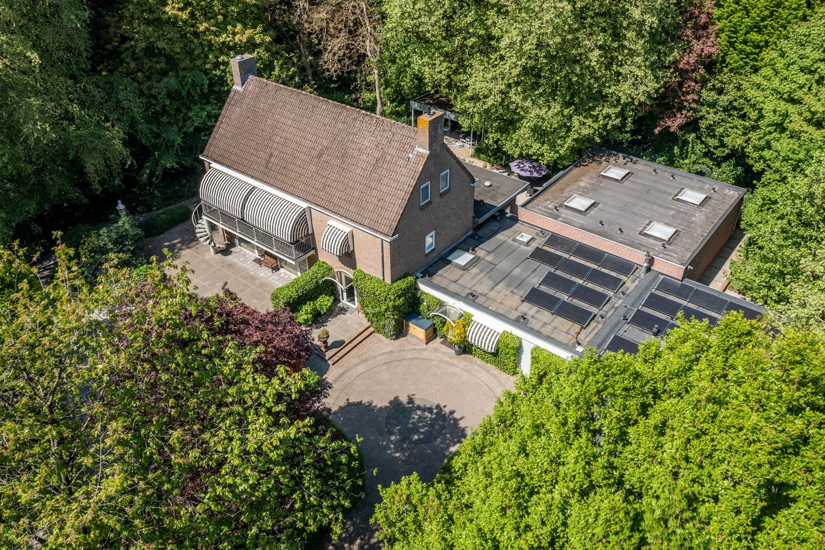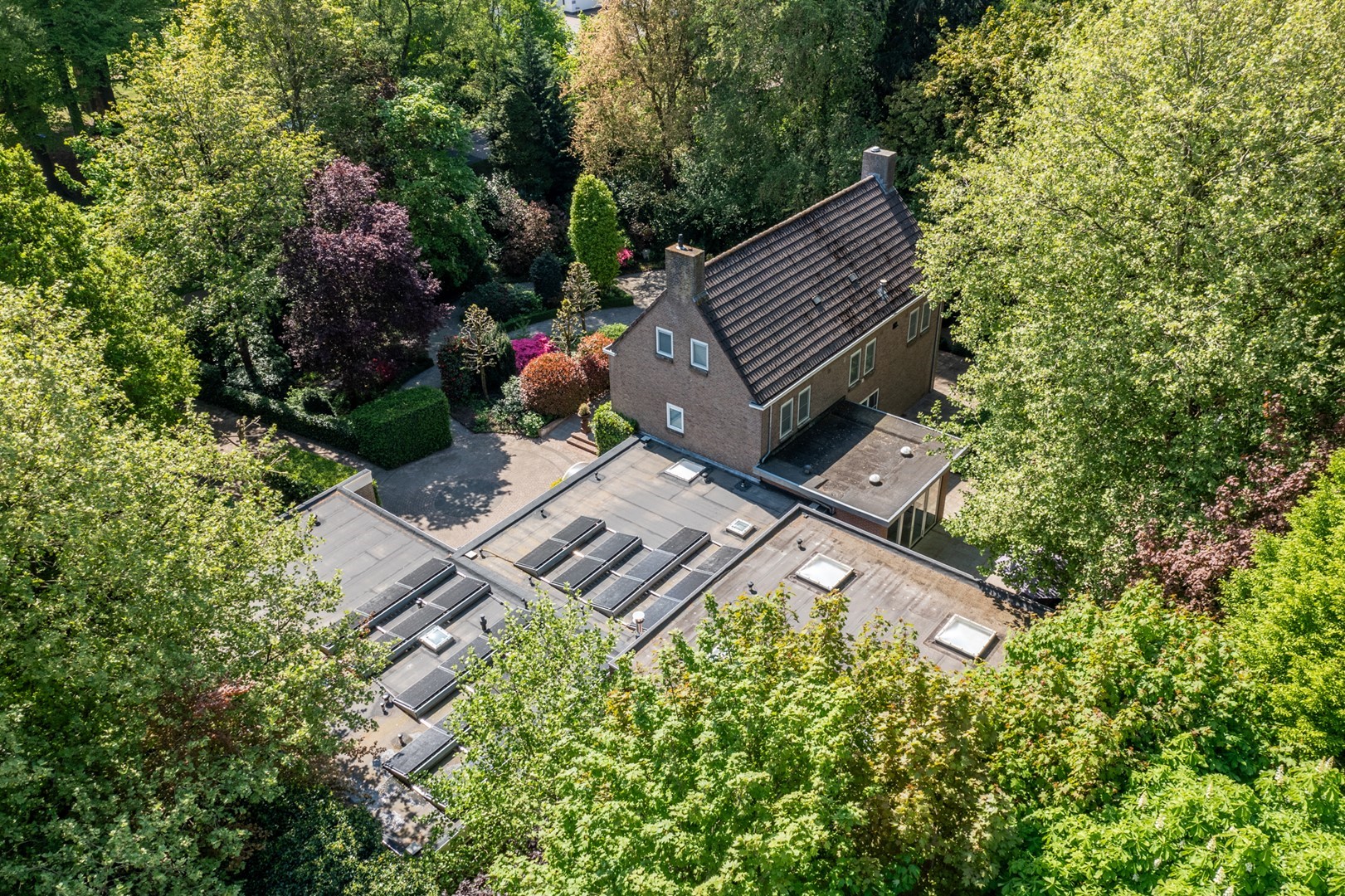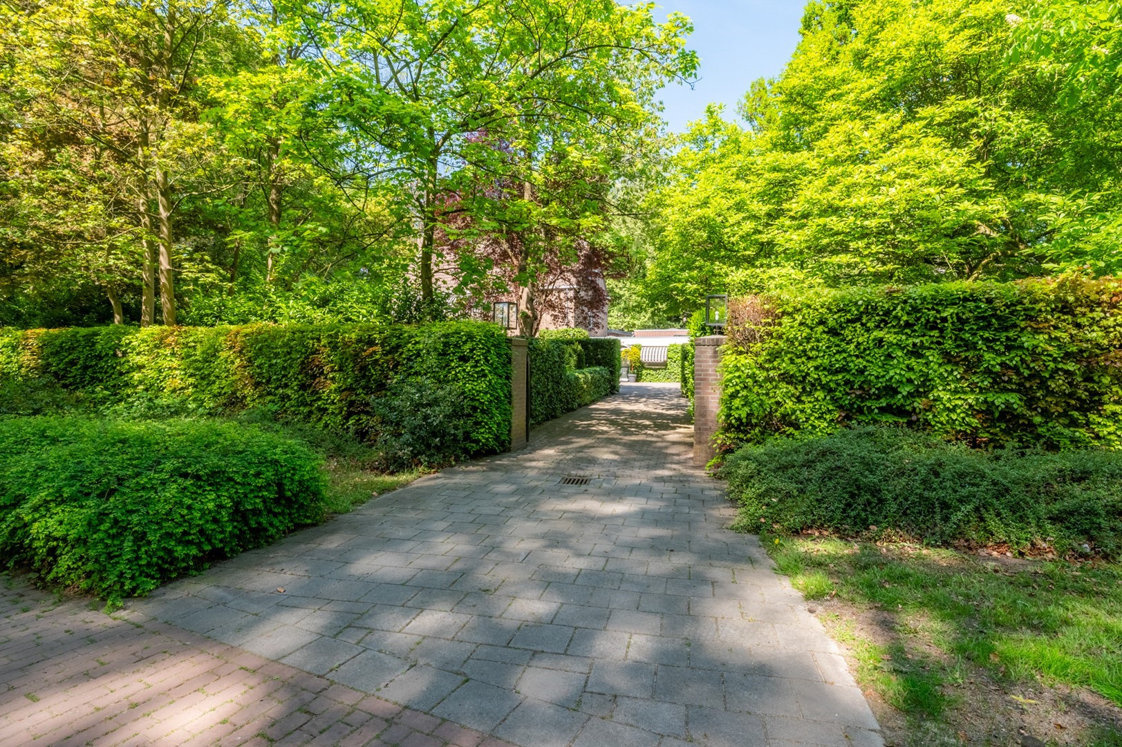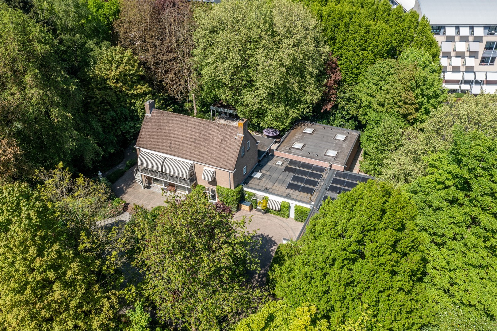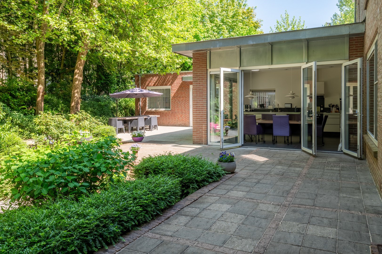 De grote tuin rondom de woning heeft meerdere terrassen. De begroeiing biedt in de zomer zoveel privacy dat op meerdere plekken onbespied kan worden genoten van het buitenzijn. Het prieel, het overdekte terras van 3 bij 6 meter, biedt al vroeg in het voorjaar een heerlijke plek om te vertoeven. Het hele jaar door is er als de zon schijnt op meerdere plekken zowel zon als weldadige schaduw te vinden. De tuin is geheel met omheining afgesloten van het park, maar door de begroeiing vormt het met dat park een schitterende eenheid.