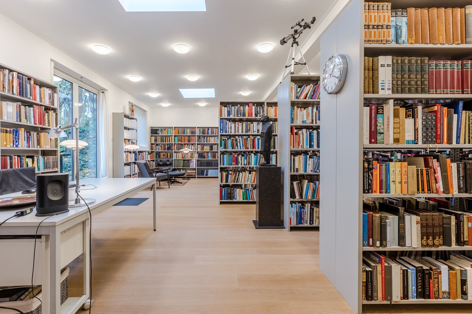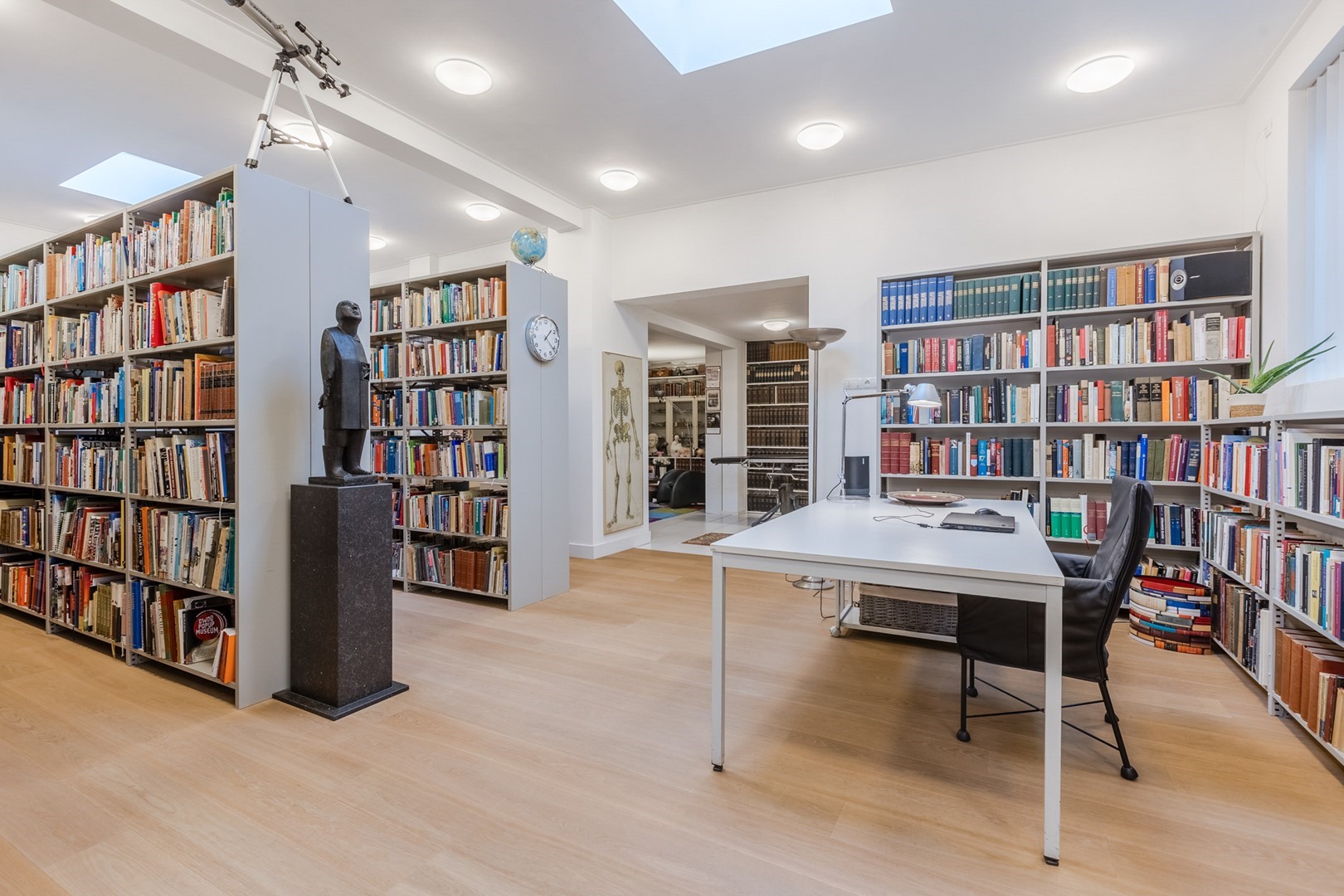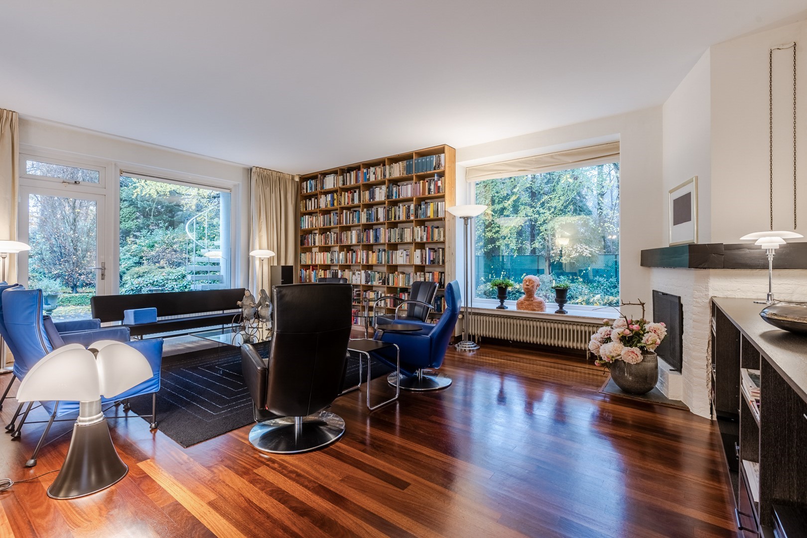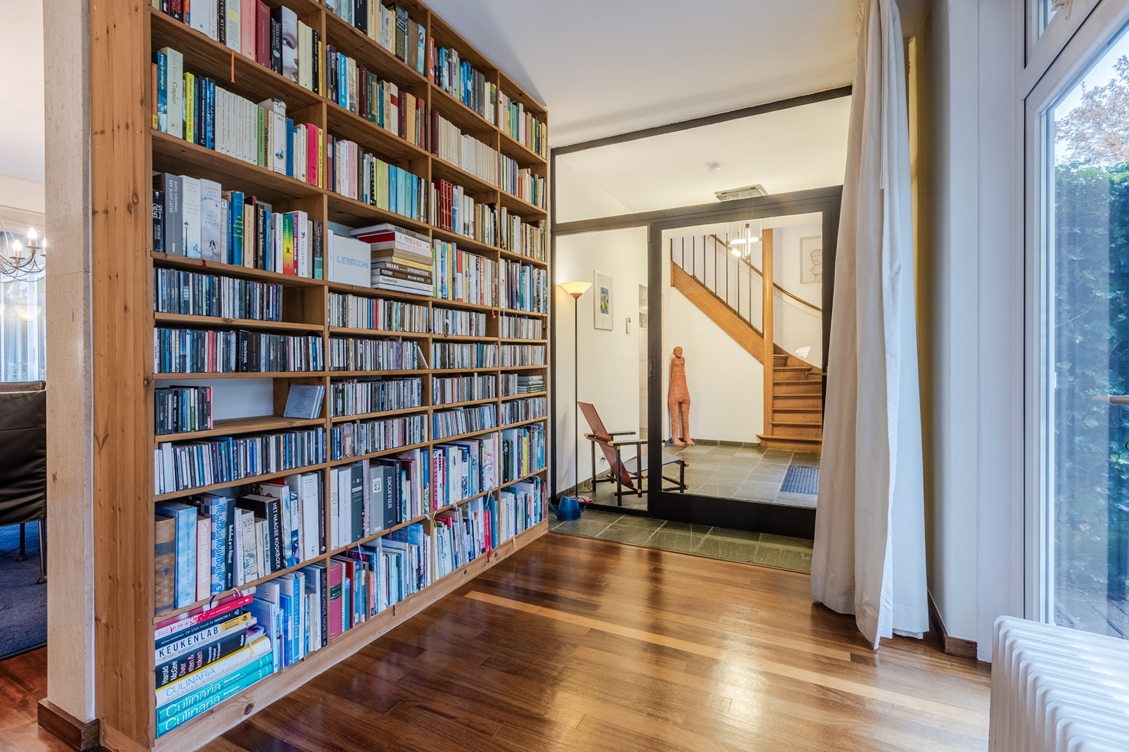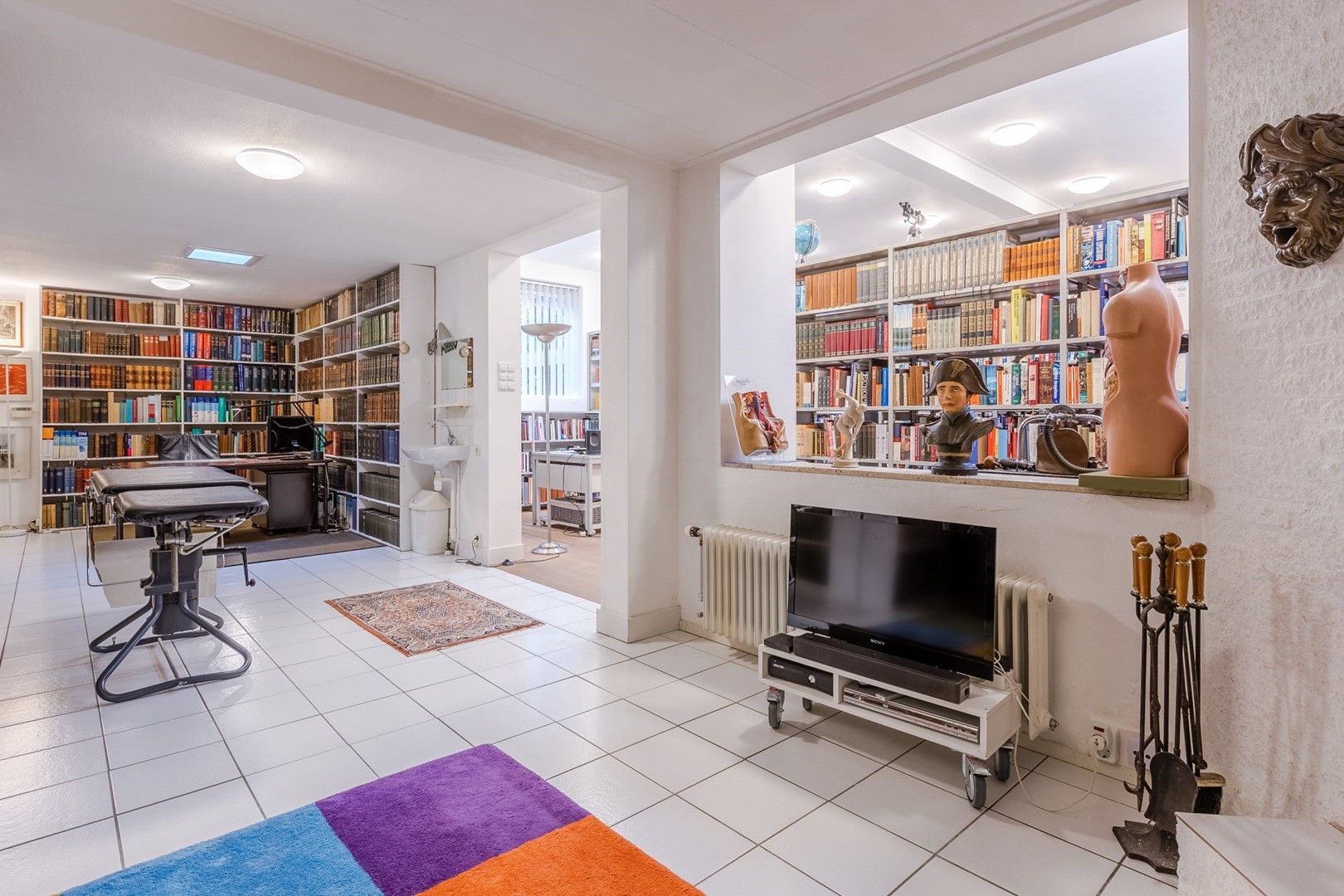 Via een eigen entree of via de woonruimte bereik je de praktijkruimte. Een gang met een wachtkamer, assistentenkamer en een grote spreek-/behandelkamer met daarin de tweede open haard. Hieraan is de bibliotheek gebouwd. Een schitterende ruimte van 10m bij 10m. Een verhoogd plafond en parketvloer met vloerverwarming, maakt het een weldaad voor het gevoel hier te toeven. Ook hier openslaande deuren naar het terras.