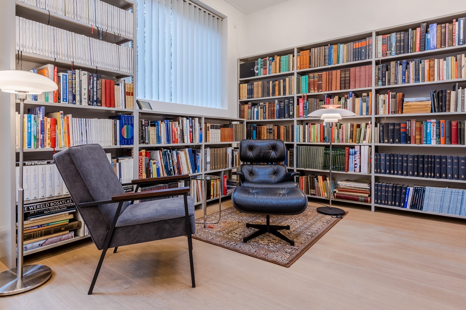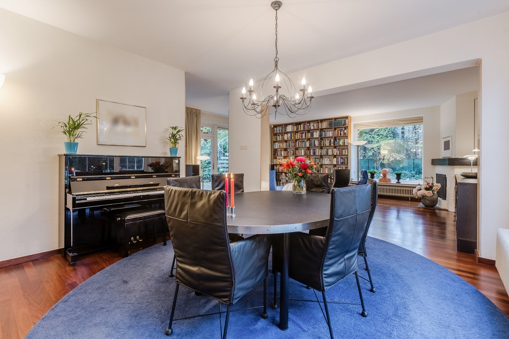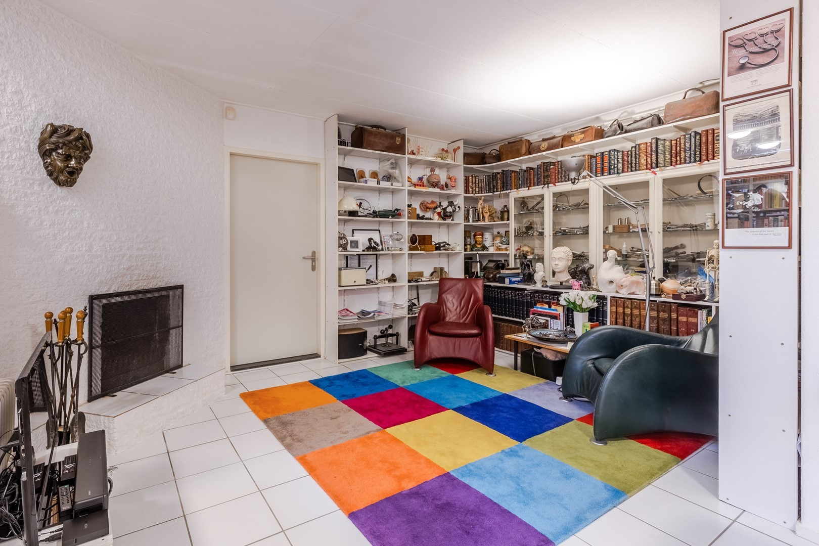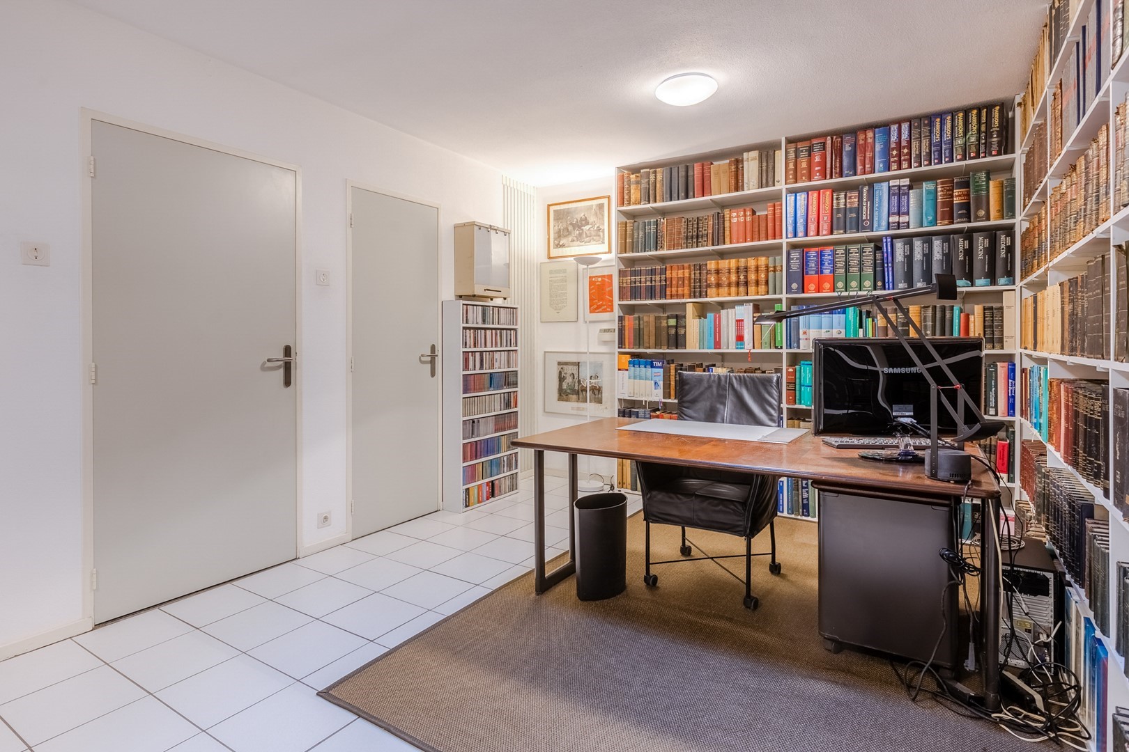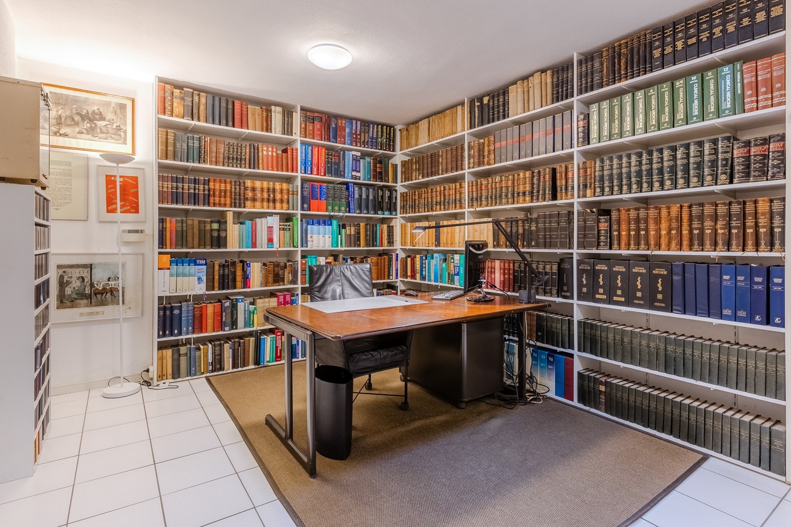 Via een eigen entree of via de woonruimte bereik je de praktijkruimte. Een gang met een wachtkamer, assistentenkamer en een grote spreek-/behandelkamer met daarin de tweede open haard. Hieraan is de bibliotheek gebouwd. Een schitterende ruimte van 10m bij 10m. Een verhoogd plafond en parketvloer met vloerverwarming, maakt het een weldaad voor het gevoel hier te toeven. Ook hier openslaande deuren naar het terras.