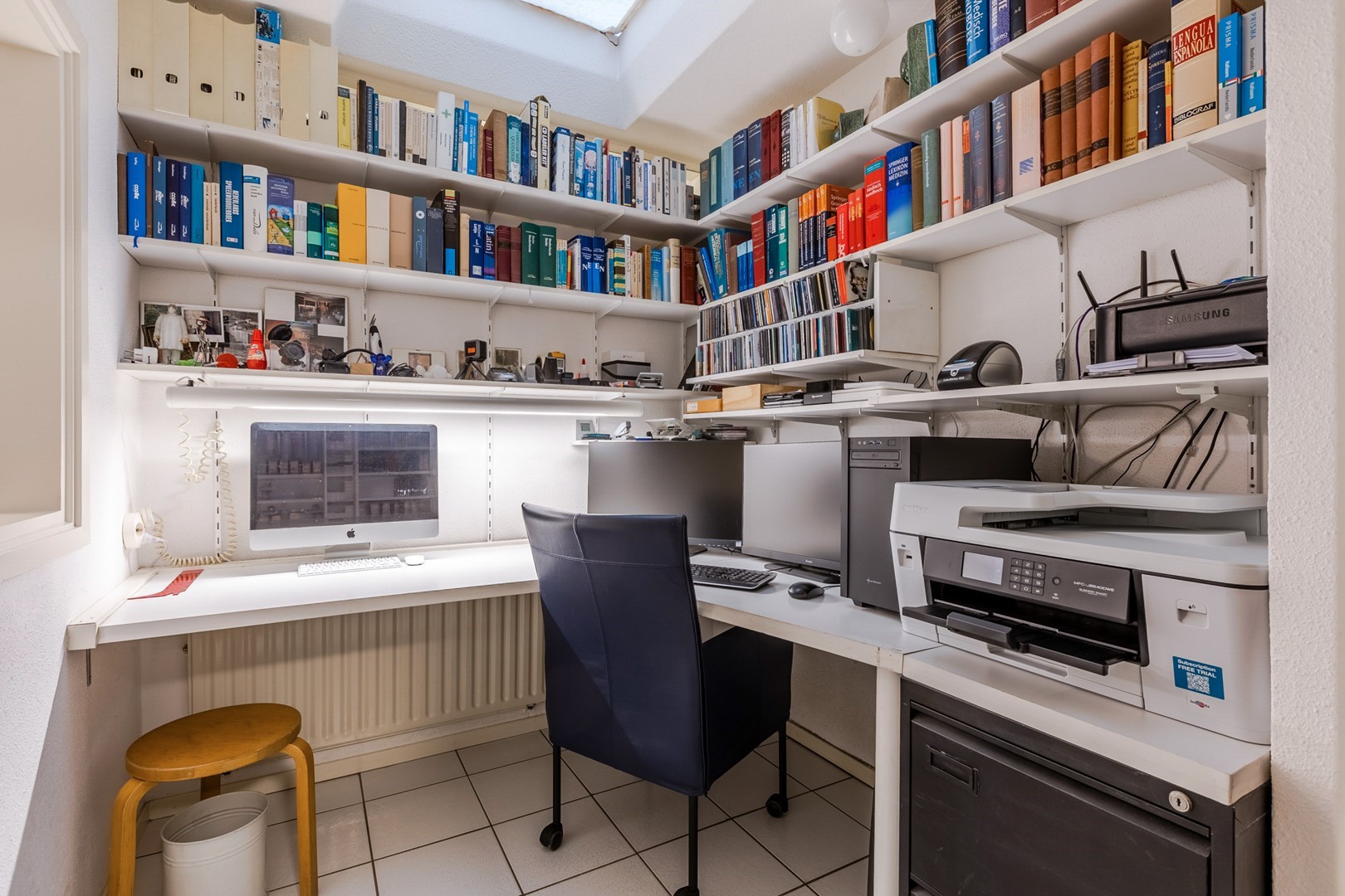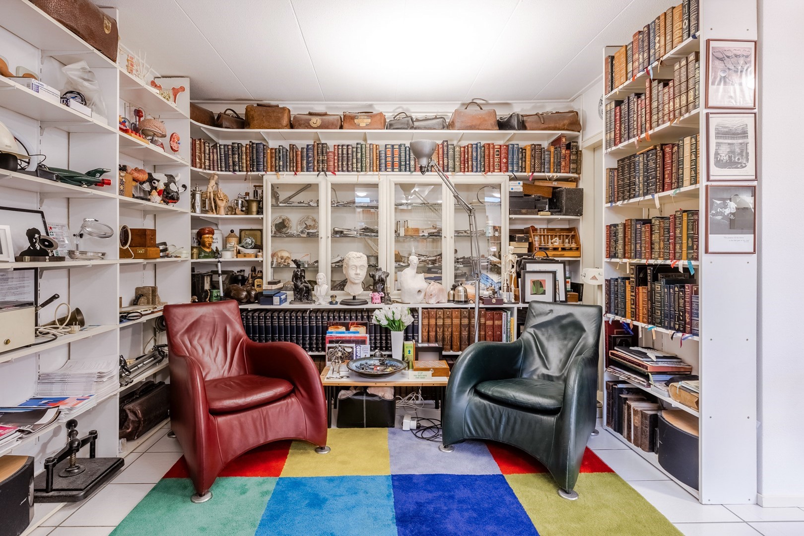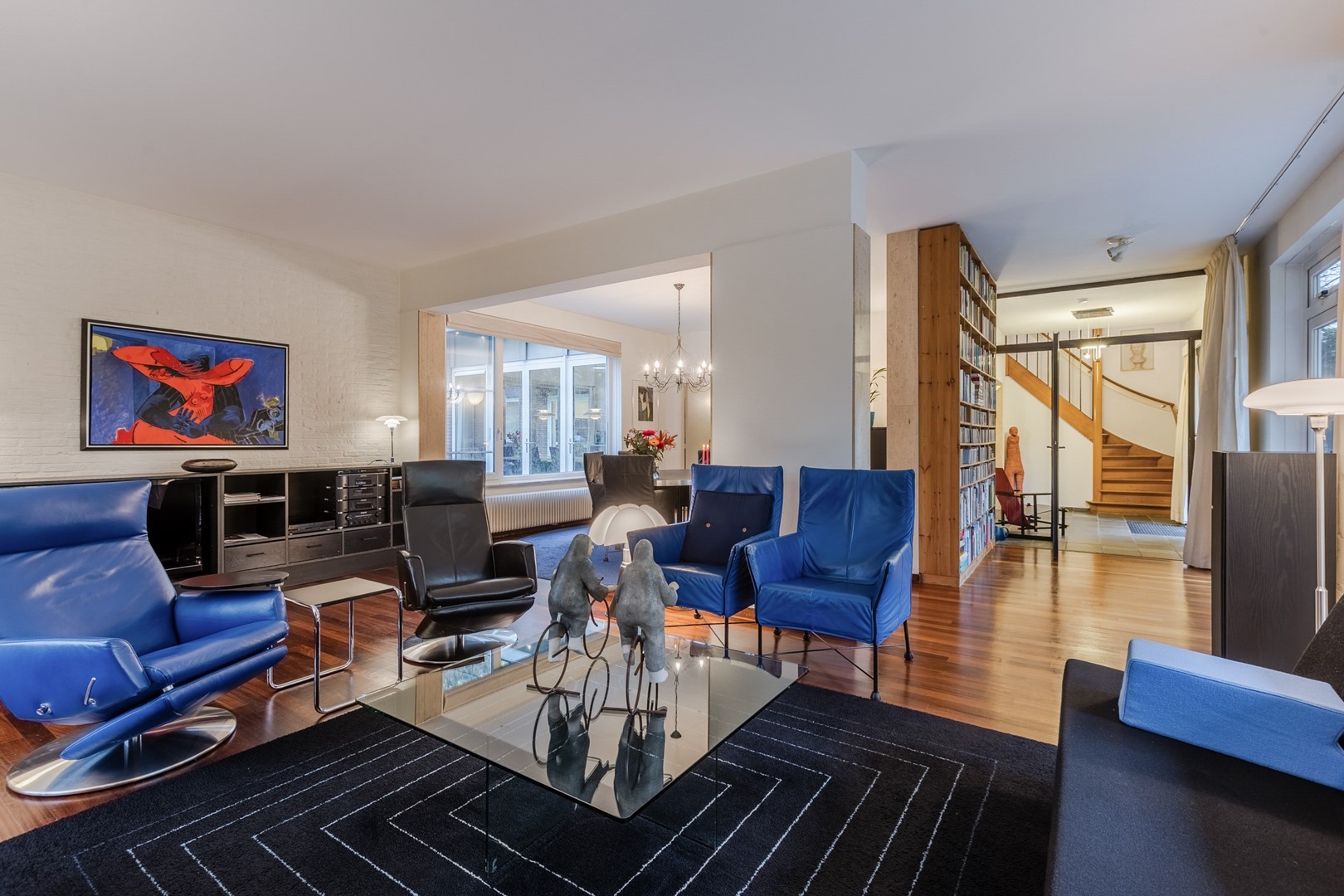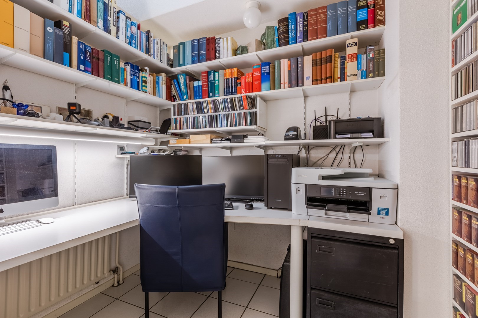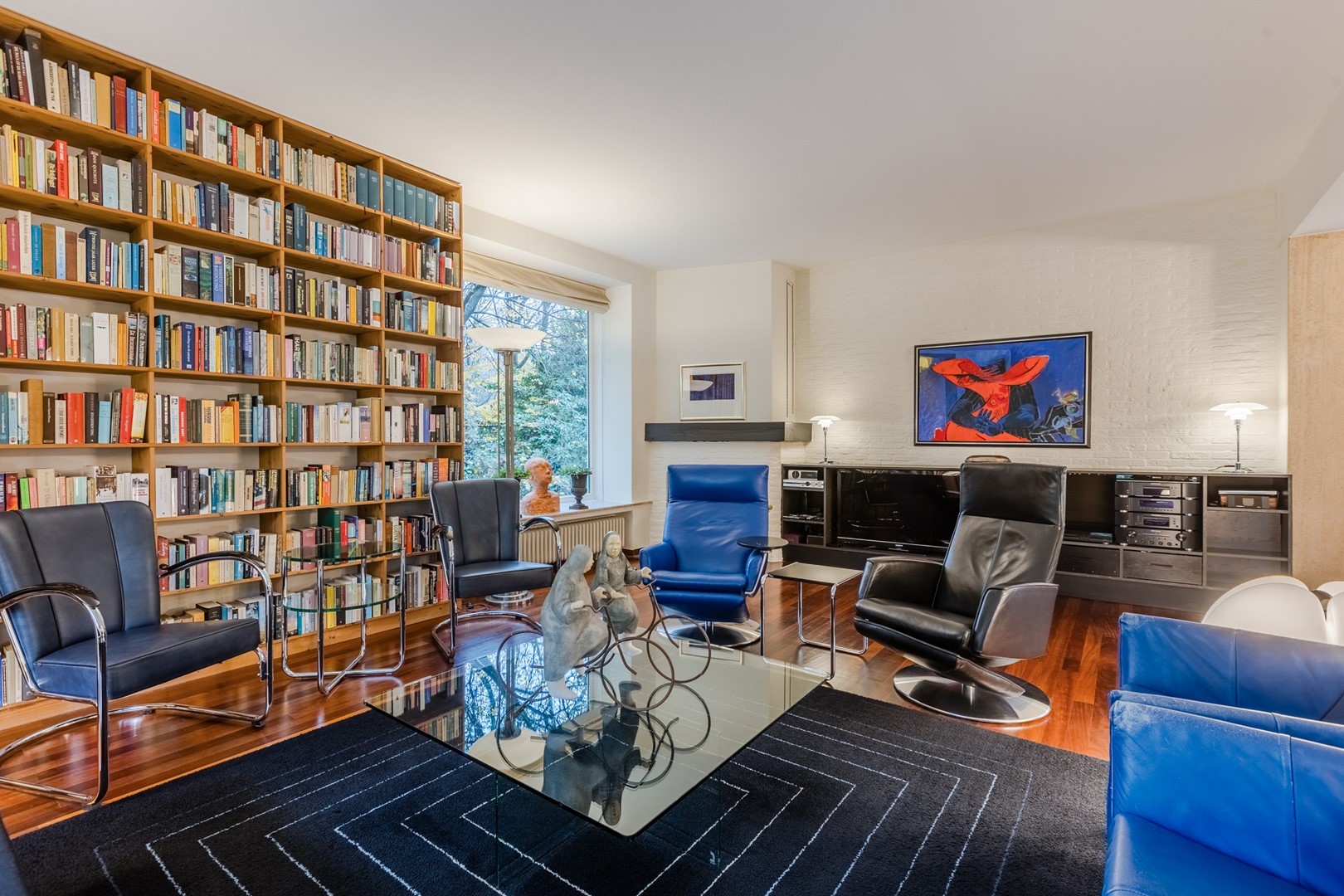 Via een eigen entree of via de woonruimte bereik je de praktijkruimte. Een gang met een wachtkamer, assistentenkamer en een grote spreek-/behandelkamer met daarin de tweede open haard. Hieraan is de bibliotheek gebouwd. Een schitterende ruimte van 10m bij 10m. Een verhoogd plafond en parketvloer met vloerverwarming, maakt het een weldaad voor het gevoel hier te toeven. Ook hier openslaande deuren naar het terras.