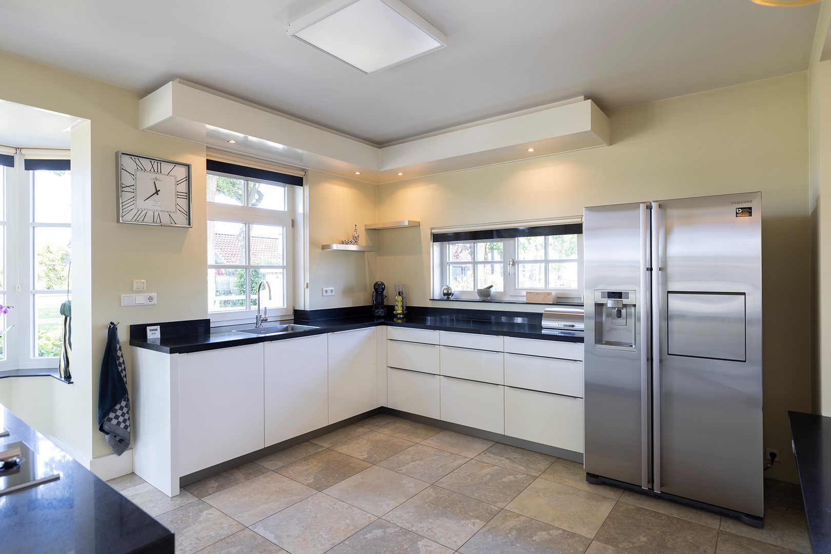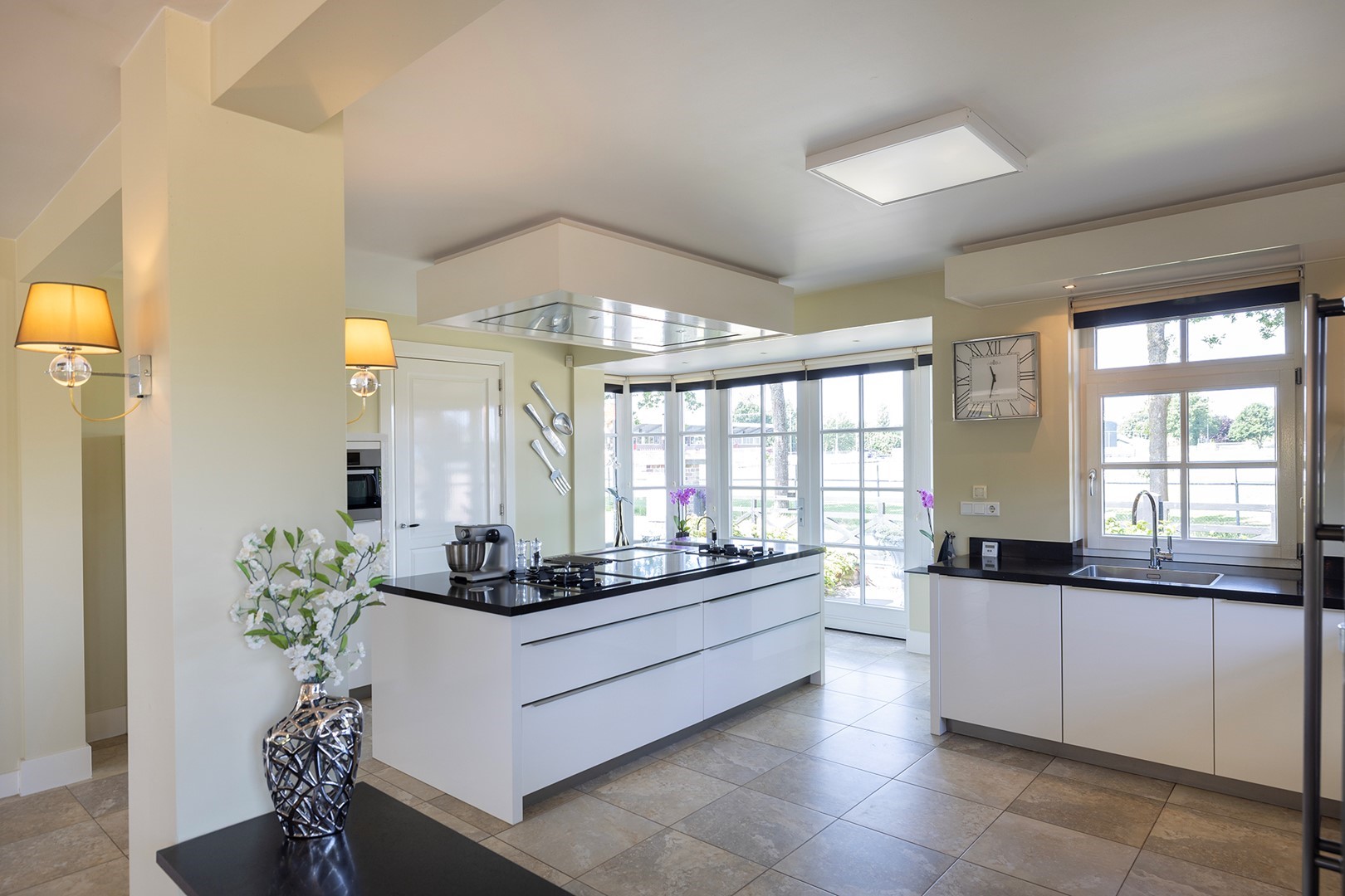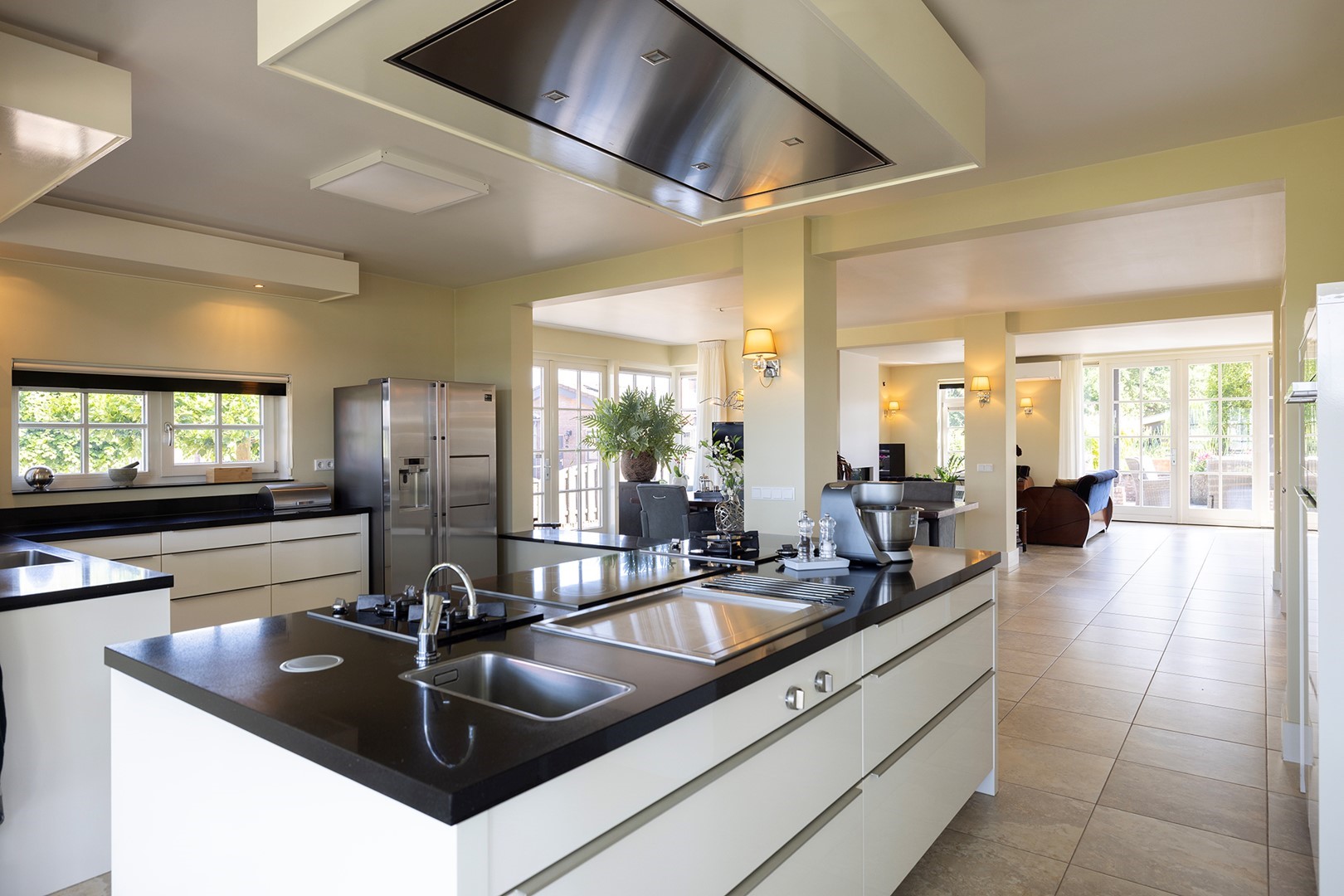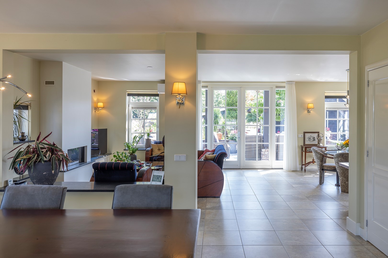 Dubbele schuifdeuren met geslepen glas geven toegang tot de royale living area. In het midden van dit royale leef- en woongedeelte is een ruime eethoek gesitueerd met hoge ramen en openslaande deuren naar buiten, die zorgen voor een prachtige lichtinval. Aansluitend bevindt zich aan de voorzijde de luxe keuken met uitzicht op de voortuin. Deze keuken is zeer compleet uitgerust met een kookeiland, inductiekookplaat met vier zones, twee gaspitten, een wok- gaspit, een teppanyaki bakplaat, Quooker, afzuigkap, vaatwasser, koel-vrieskast voorzien van ijsblokjesfunctie en een vriesgedeelte, een combi oven-magnetron en een stoomoven. De keuken is uitgevoerd in hoogglans met een composiet aanrechtblad en biedt daarnaast volop kastruimte. Het zitgedeelte heeft een schouw met gashaard en via de openslaande deuren is direct toegang tot het terras. Er is ruimte voor een extra eethoek of een werkplek, waardoor deze ruimte eenvoudig kan worden aangepast aan uw woonwensen. Het geheel straalt comfort, luxe en flexibiliteit uit en is tot in detail verzorgd. De airconditioning geeft hier extra comfort. Via de keuken bereikt u de bijkeuken, die eveneens is voorzien van een buitendeur en extra bergruimte. Deze ruimte heeft een keukenblok met een warm/koud water aansluiting.