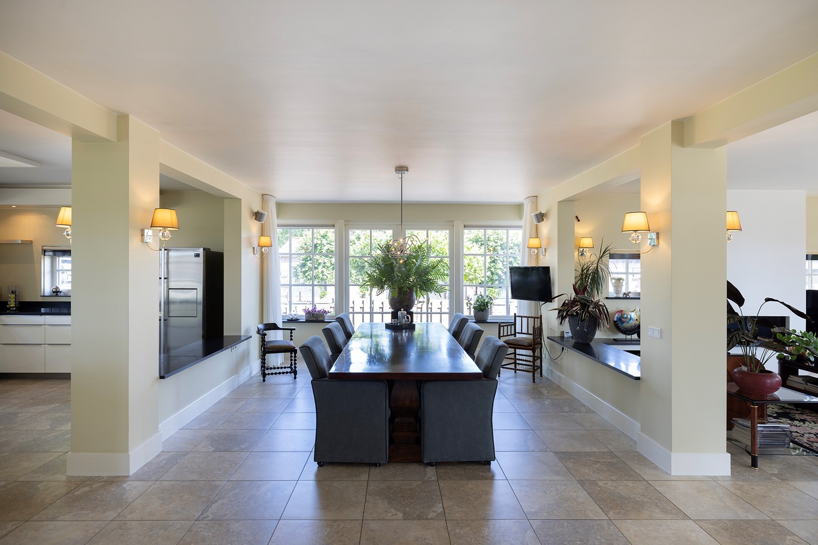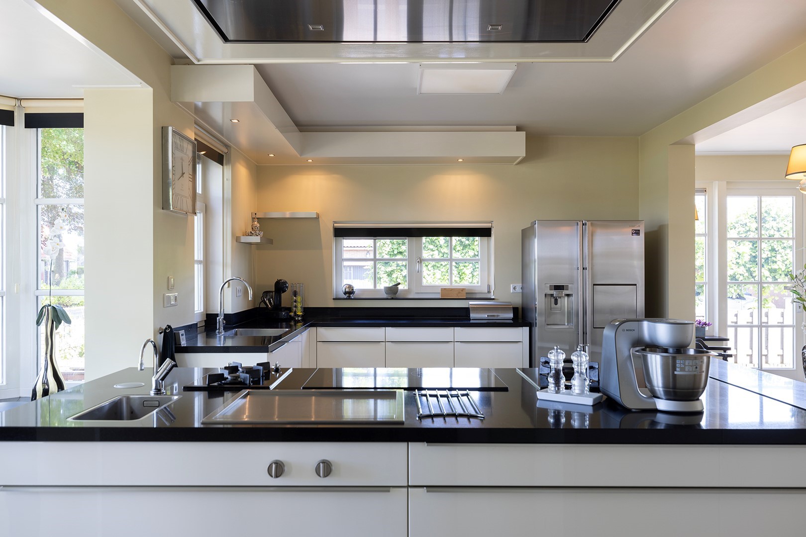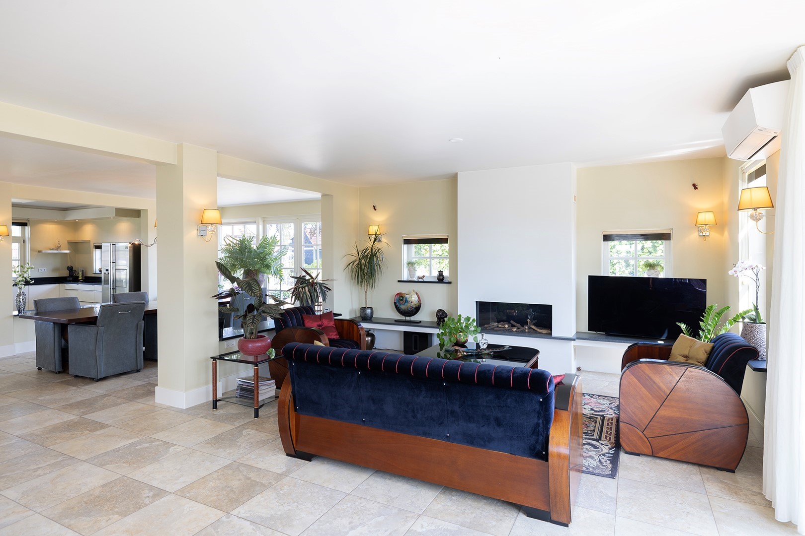 Dubbele schuifdeuren met geslepen glas geven toegang tot de royale living area. In het midden van dit royale leef- en woongedeelte is een ruime eethoek gesitueerd met hoge ramen en openslaande deuren naar buiten, die zorgen voor een prachtige lichtinval. Aansluitend bevindt zich aan de voorzijde de luxe keuken met uitzicht op de voortuin. Deze keuken is zeer compleet uitgerust met een kookeiland, inductiekookplaat met vier zones, twee gaspitten, een wok- gaspit, een teppanyaki bakplaat, Quooker, afzuigkap, vaatwasser, koel-vrieskast voorzien van ijsblokjesfunctie en een vriesgedeelte, een combi oven-magnetron en een stoomoven. De keuken is uitgevoerd in hoogglans met een composiet aanrechtblad en biedt daarnaast volop kastruimte. Het zitgedeelte heeft een schouw met gashaard en via de openslaande deuren is direct toegang tot het terras. Er is ruimte voor een extra eethoek of een werkplek, waardoor deze ruimte eenvoudig kan worden aangepast aan uw woonwensen. Het geheel straalt comfort, luxe en flexibiliteit uit en is tot in detail verzorgd. De airconditioning geeft hier extra comfort. Via de keuken bereikt u de bijkeuken, die eveneens is voorzien van een buitendeur en extra bergruimte. Deze ruimte heeft een keukenblok met een warm/koud water aansluiting.