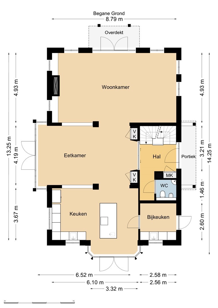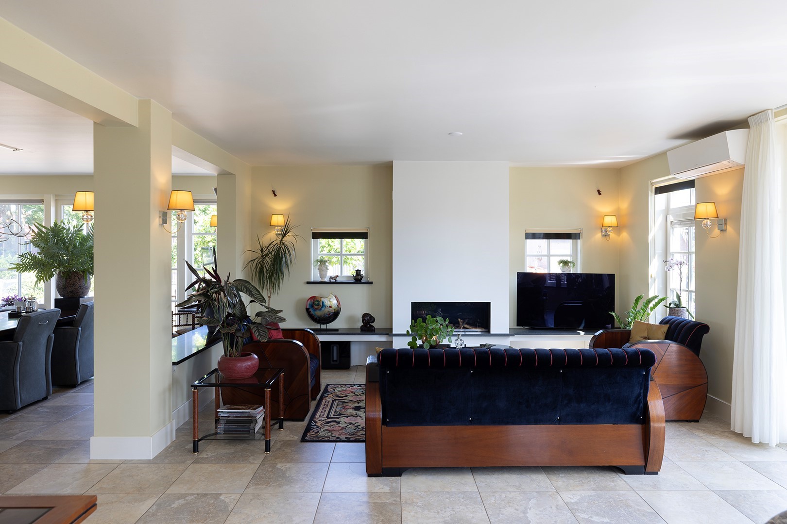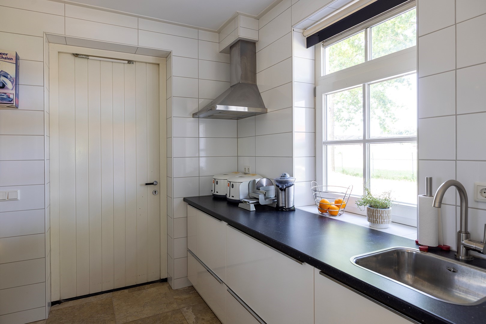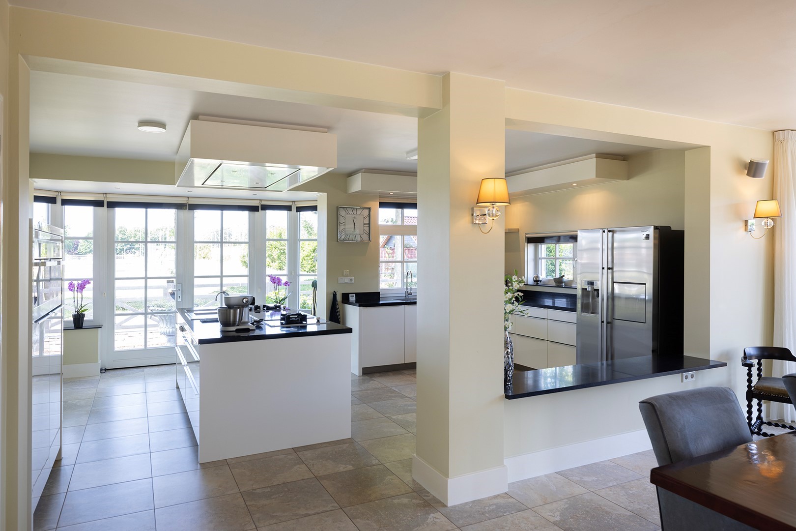 Dubbele schuifdeuren met geslepen glas geven toegang tot de royale living area. In het midden van dit royale leef- en woongedeelte is een ruime eethoek gesitueerd met hoge ramen en openslaande deuren naar buiten, die zorgen voor een prachtige lichtinval. Aansluitend bevindt zich aan de voorzijde de luxe keuken met uitzicht op de voortuin. Deze keuken is zeer compleet uitgerust met een kookeiland, inductiekookplaat met vier zones, twee gaspitten, een wok- gaspit, een teppanyaki bakplaat, Quooker, afzuigkap, vaatwasser, koel-vrieskast voorzien van ijsblokjesfunctie en een vriesgedeelte, een combi oven-magnetron en een stoomoven. De keuken is uitgevoerd in hoogglans met een composiet aanrechtblad en biedt daarnaast volop kastruimte. Het zitgedeelte heeft een schouw met gashaard en via de openslaande deuren is direct toegang tot het terras. Er is ruimte voor een extra eethoek of een werkplek, waardoor deze ruimte eenvoudig kan worden aangepast aan uw woonwensen. Het geheel straalt comfort, luxe en flexibiliteit uit en is tot in detail verzorgd. De airconditioning geeft hier extra comfort. Via de keuken bereikt u de bijkeuken, die eveneens is voorzien van een buitendeur en extra bergruimte. Deze ruimte heeft een keukenblok met een warm/koud water aansluiting.