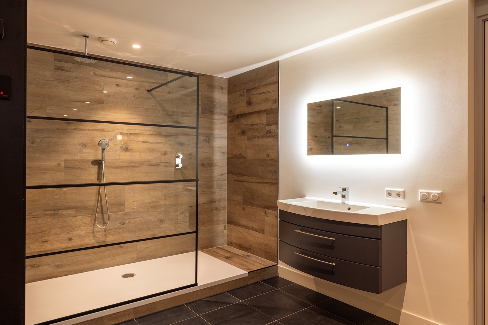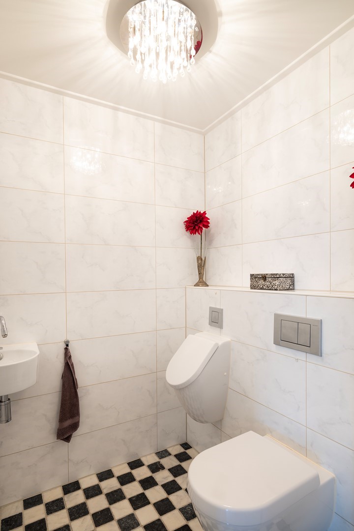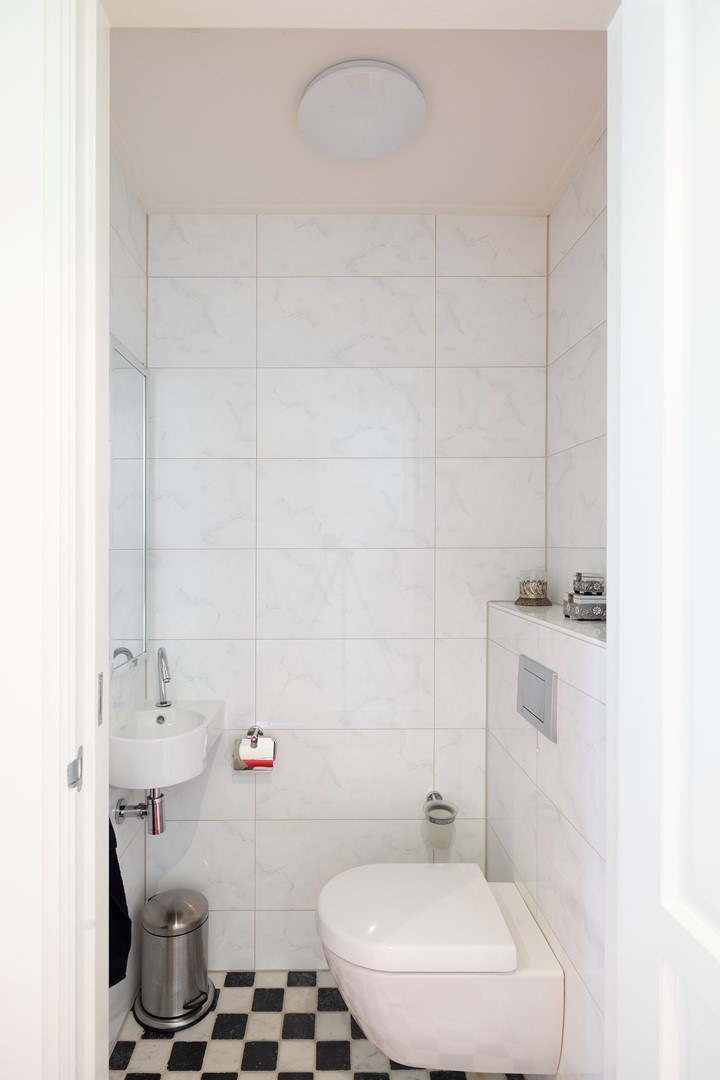 De badkamer op deze verdieping is uitgevoerd in luxe marmerlook tegels en voorzien van een regen- en handdouche, een designradiator en een modern wastafelmeubel. Daarnaast is er een stortkoker aanwezig voor de vuile was die uitkomt in de kelder, rechtstreeks naar de wasruimte met wasmachine- en drogeraansluiting. Naast de badkamer bevindt zich een separaat toilet met fonteintje, eveneens in marmerlook tegels uitgevoerd.