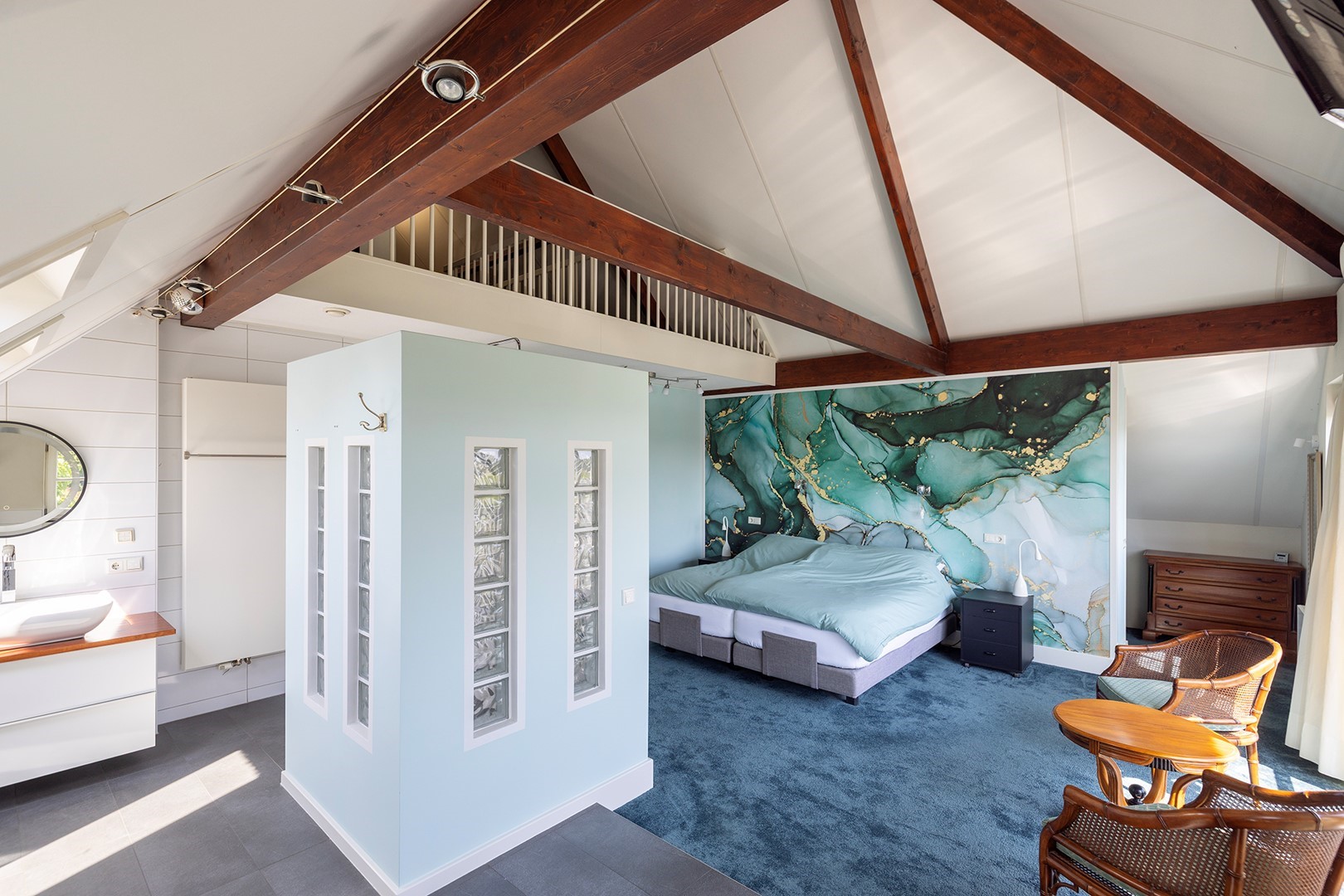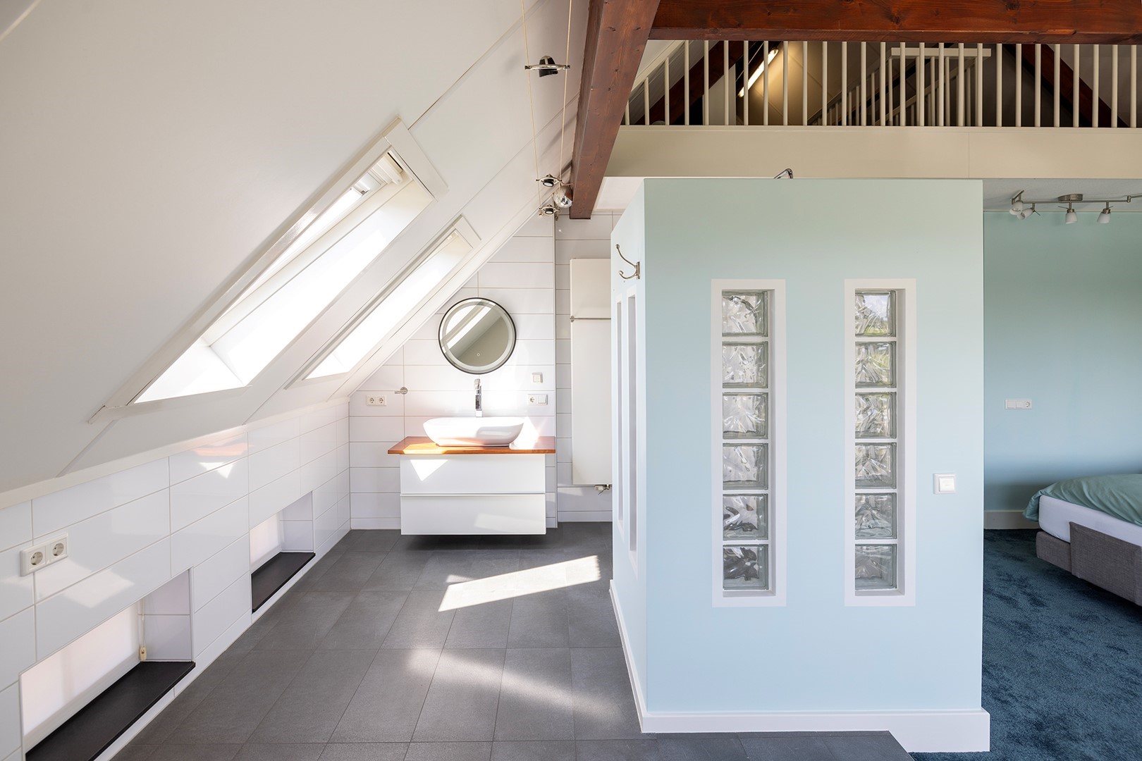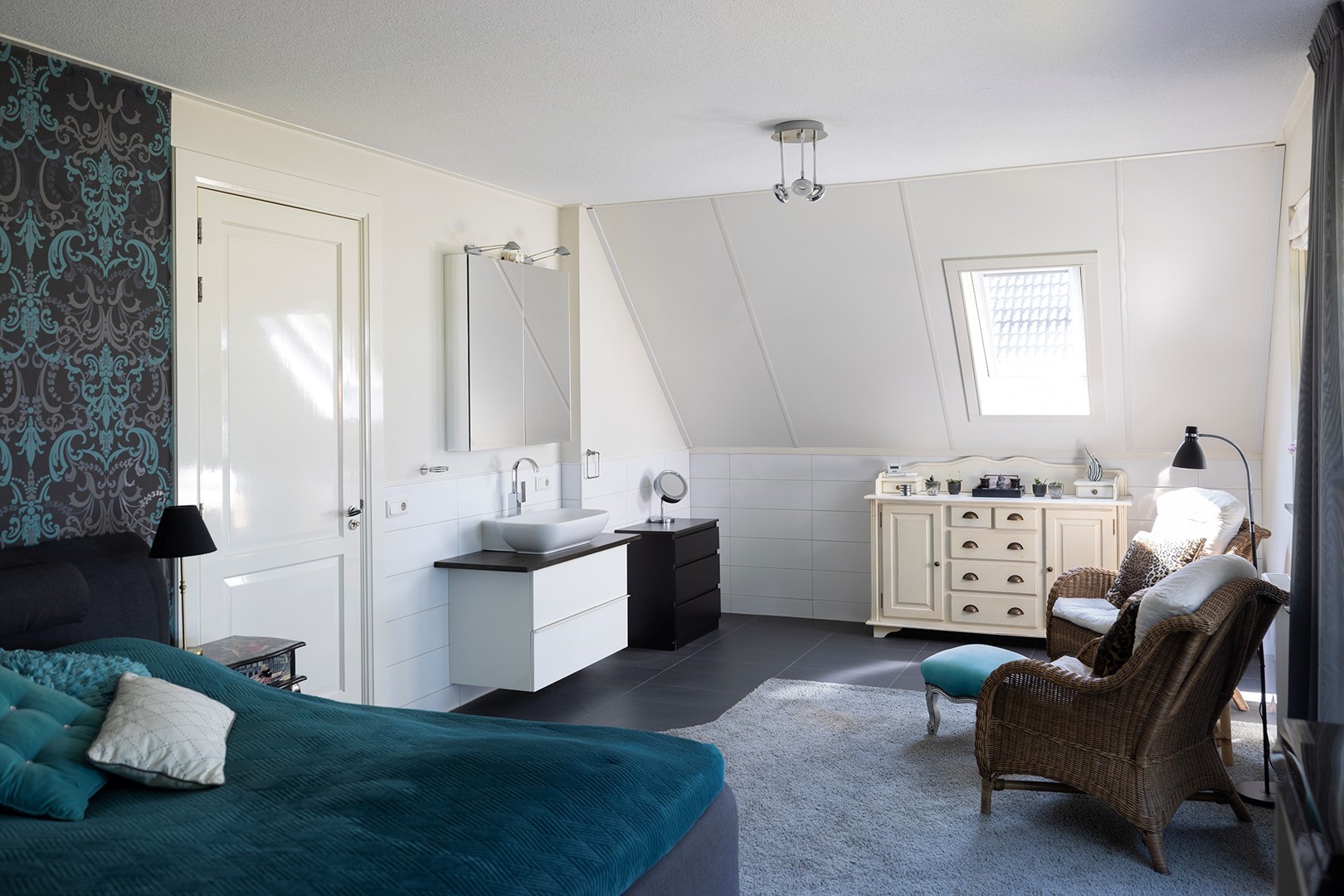 De master bedroom bevindt zich aan de achterzijde van de woning en biedt een prachtig uitzicht over de tuin. Ook deze kamer beschikt over kiep kantelramen met regensensoren en een eigen balkon, ruim genoeg voor een gezellig terras. Een heerlijke plek om in de ochtendzon te genieten van uw koffie! De kamer is voorzien van een walk in closet en een eigen badkamer en suite met regendouche, badmeubel en de mogelijkheid voor het plaatsen van een ligbad. Airconditioning zorgt hier voor extra comfort. Tevens is de vloerverwarming van de ensuite badkamer apart te regelen. Een vaste trap leidt u naar de vide, die niet alleen sfeervol is, maar ook veel extra opbergruimte biedt.