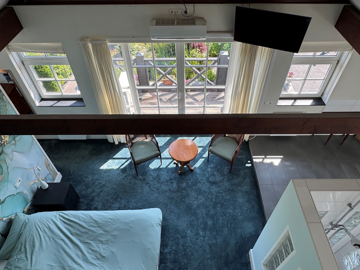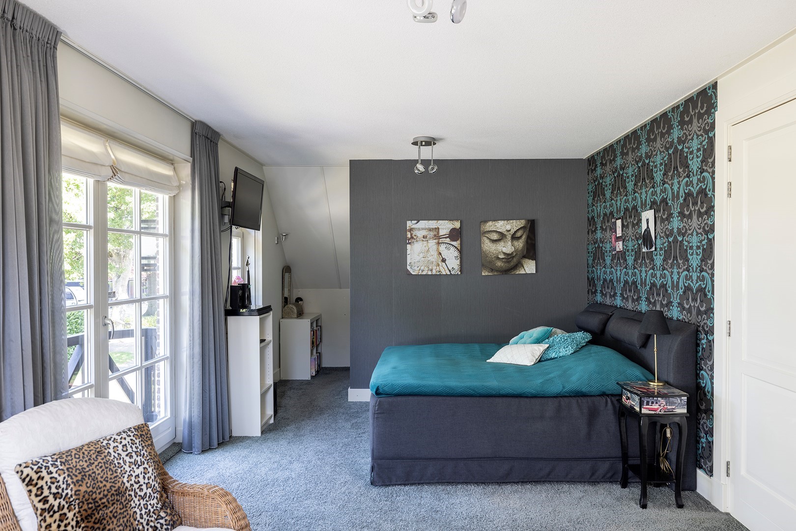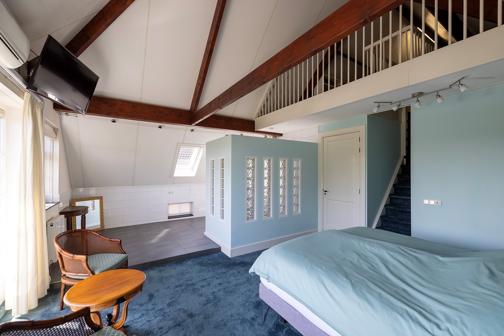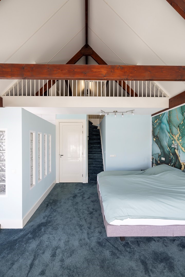 De master bedroom bevindt zich aan de achterzijde van de woning en biedt een prachtig uitzicht over de tuin. Ook deze kamer beschikt over kiep kantelramen met regensensoren en een eigen balkon, ruim genoeg voor een gezellig terras. Een heerlijke plek om in de ochtendzon te genieten van uw koffie! De kamer is voorzien van een walk in closet en een eigen badkamer en suite met regendouche, badmeubel en de mogelijkheid voor het plaatsen van een ligbad. Airconditioning zorgt hier voor extra comfort. Tevens is de vloerverwarming van de ensuite badkamer apart te regelen. Een vaste trap leidt u naar de vide, die niet alleen sfeervol is, maar ook veel extra opbergruimte biedt.