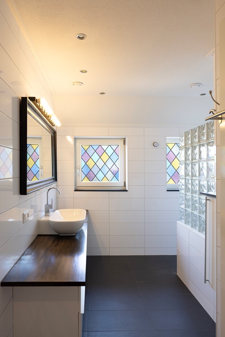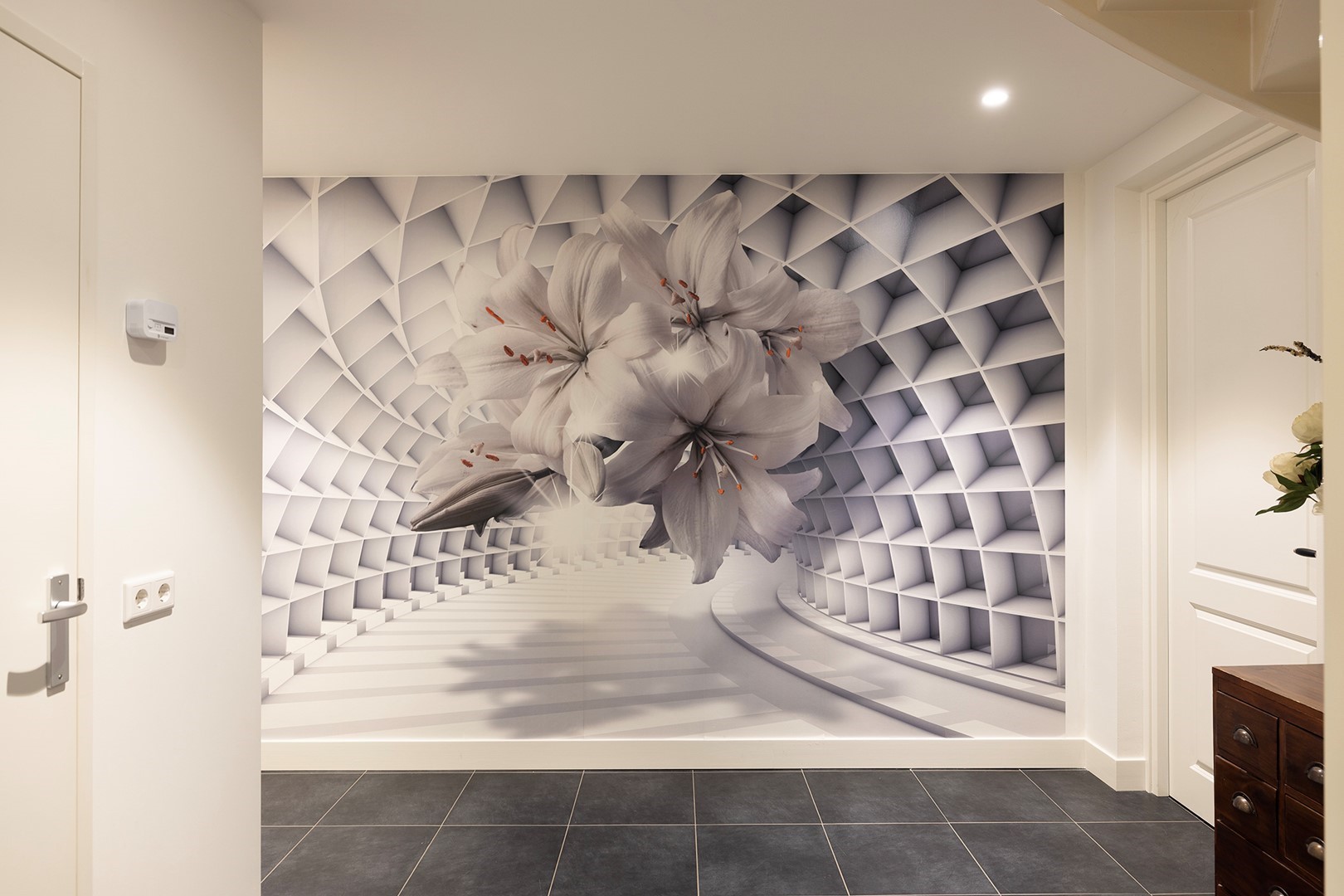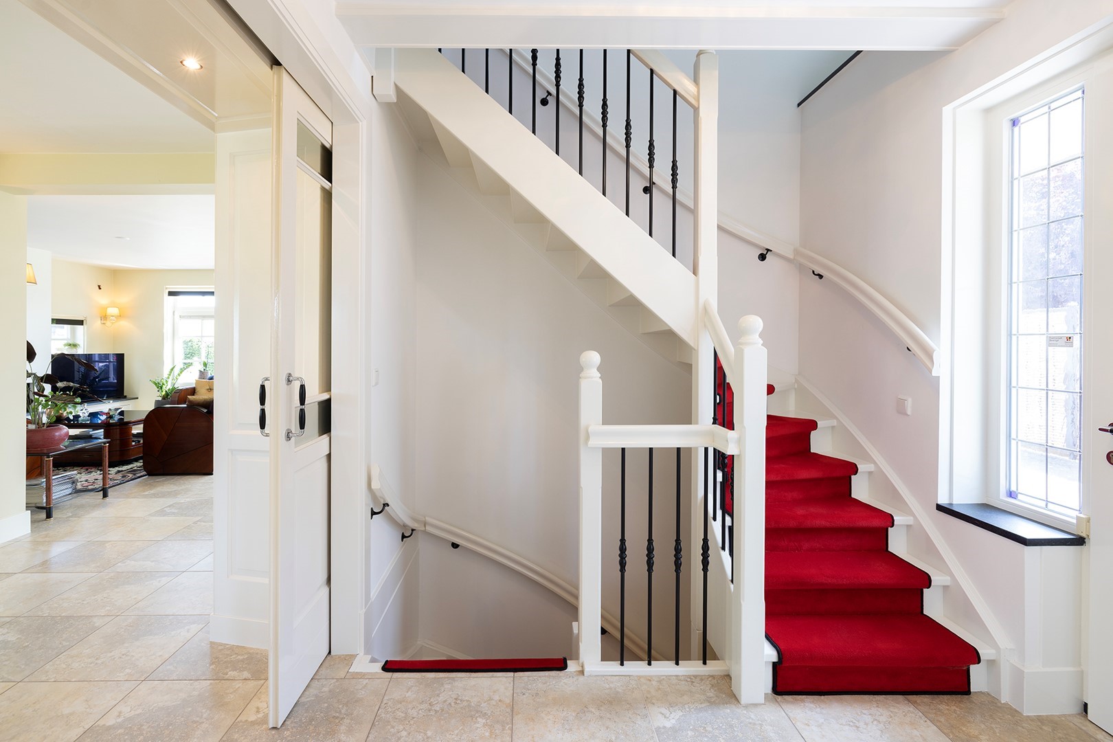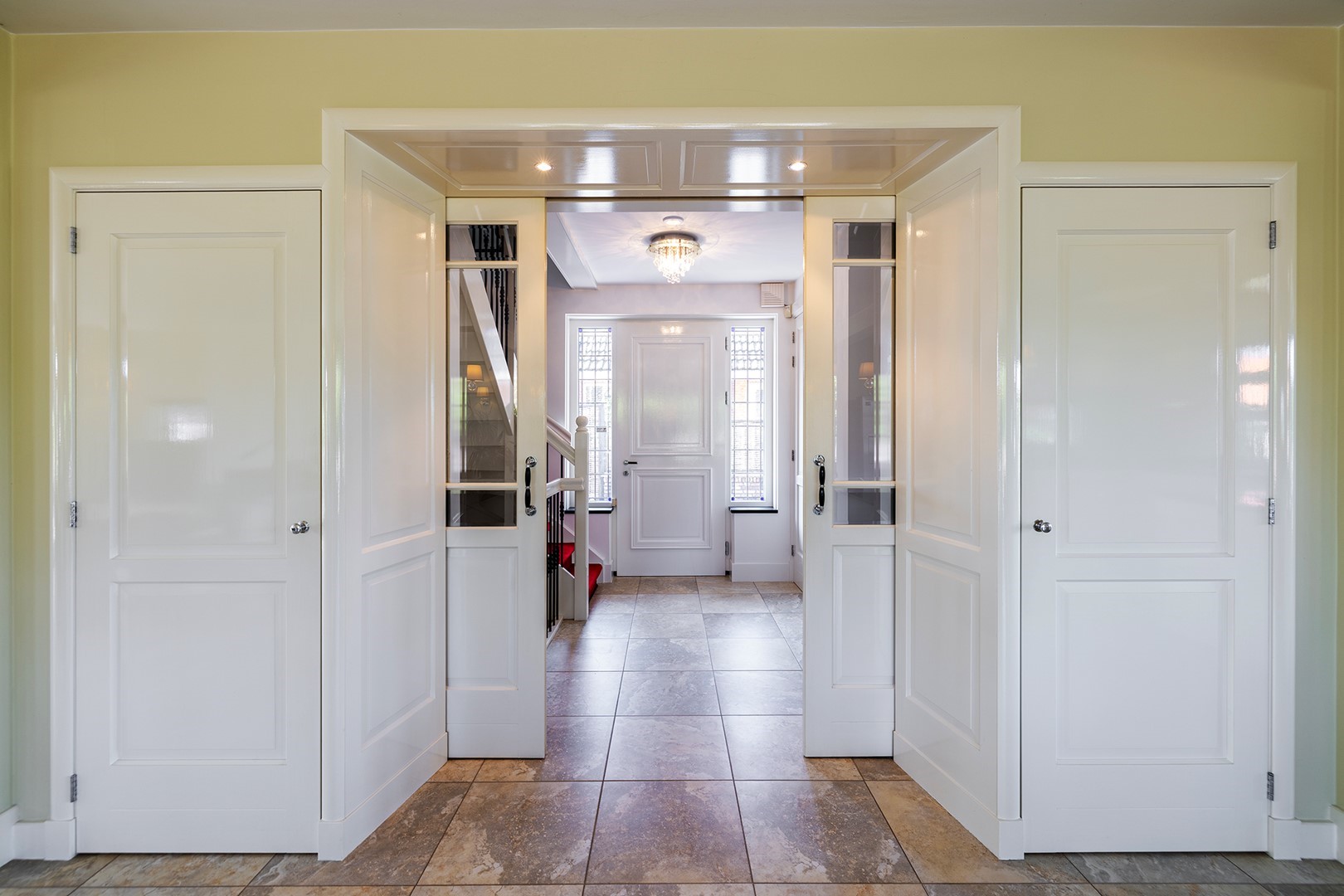 Via de voordeur met prachtige glas-in-loodramen komt u binnen in een ruime en lichte hal. De ramen zijn uitgevoerd in isolerend tripleglas en de vensterbanken zijn vervaardigd uit hardsteen. Op de gehele parterre ligt een stijlvolle Italiaanse keramische tegelvloer met comfortabele vloerverwarming, die per zone instelbaar is. In de hal bevinden zich een toilet met fonteintje, een garderobe en de meterkast met de verdeler van de vloerverwarming.