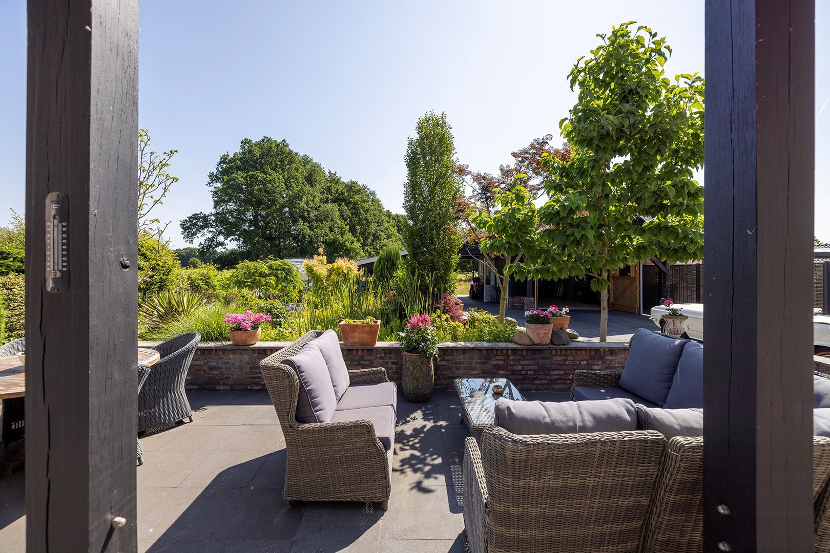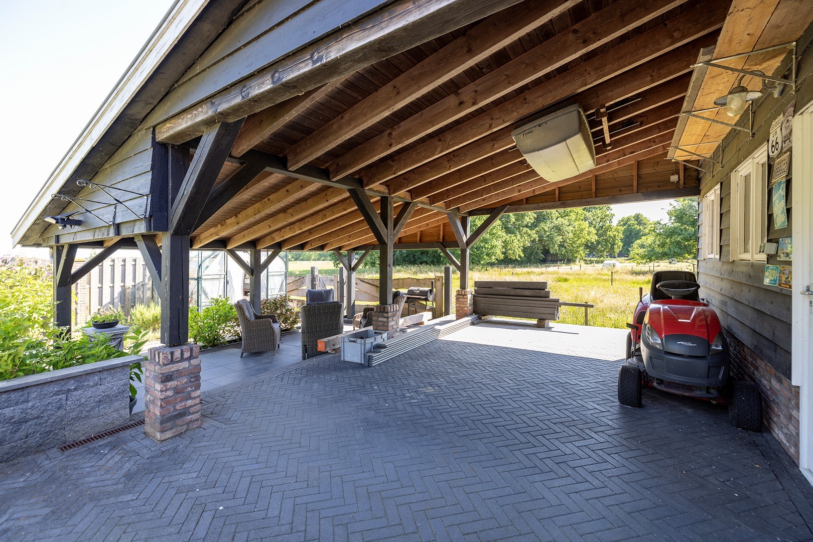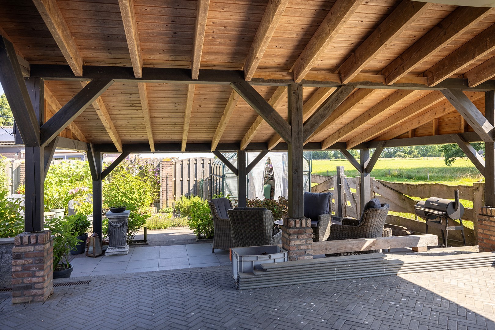 Tot slot is er een gezellige overkapping, ideaal als beschutte zithoek voor lange avonden buiten of als plek om zelfs bij minder weer heerlijk te ontspannen. De tuin is een fijne en rustgevende buitenruimte die perfect aansluit op het comfortabele karakter van de woning. Het passende straatwerk maakt het geheel compleet.