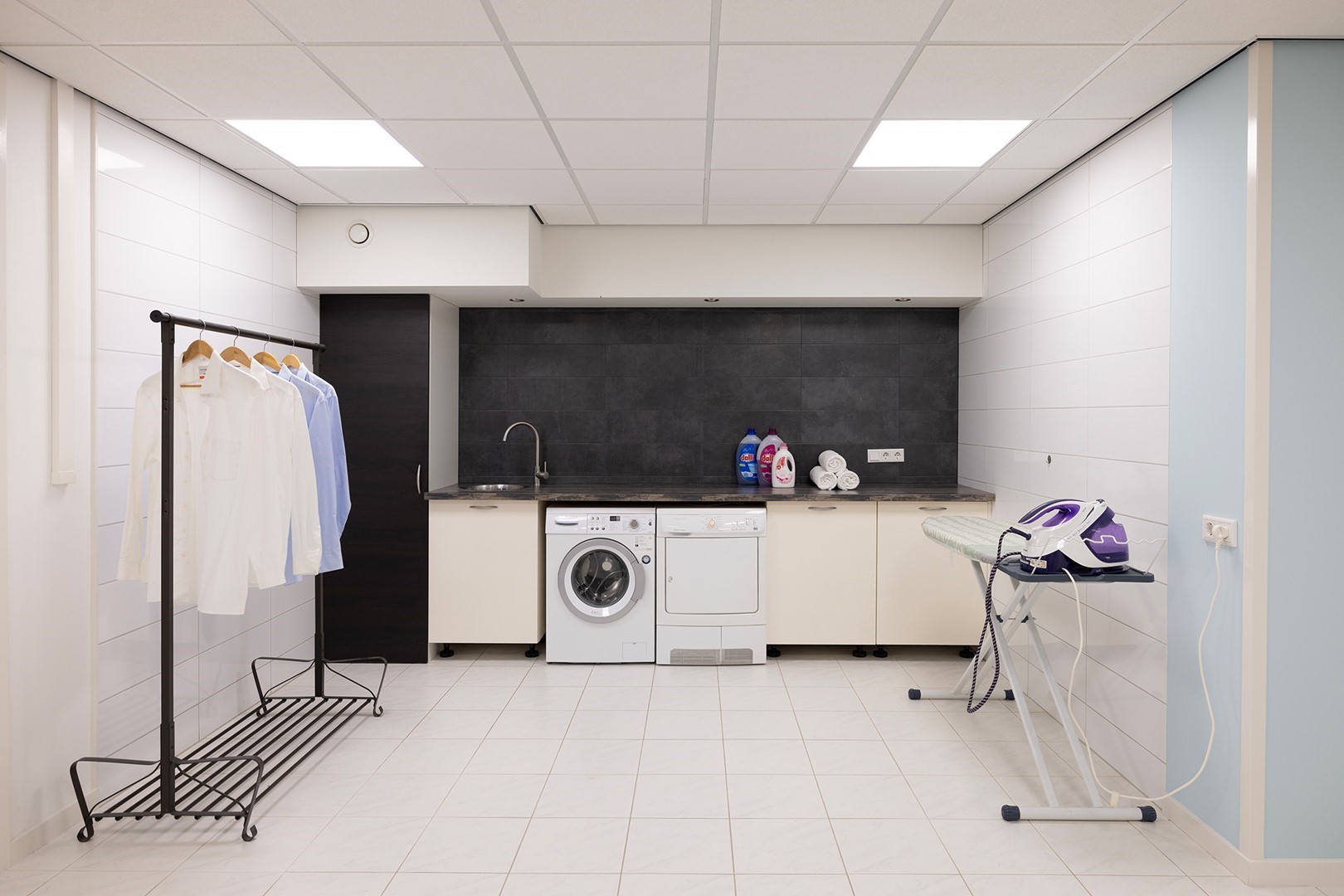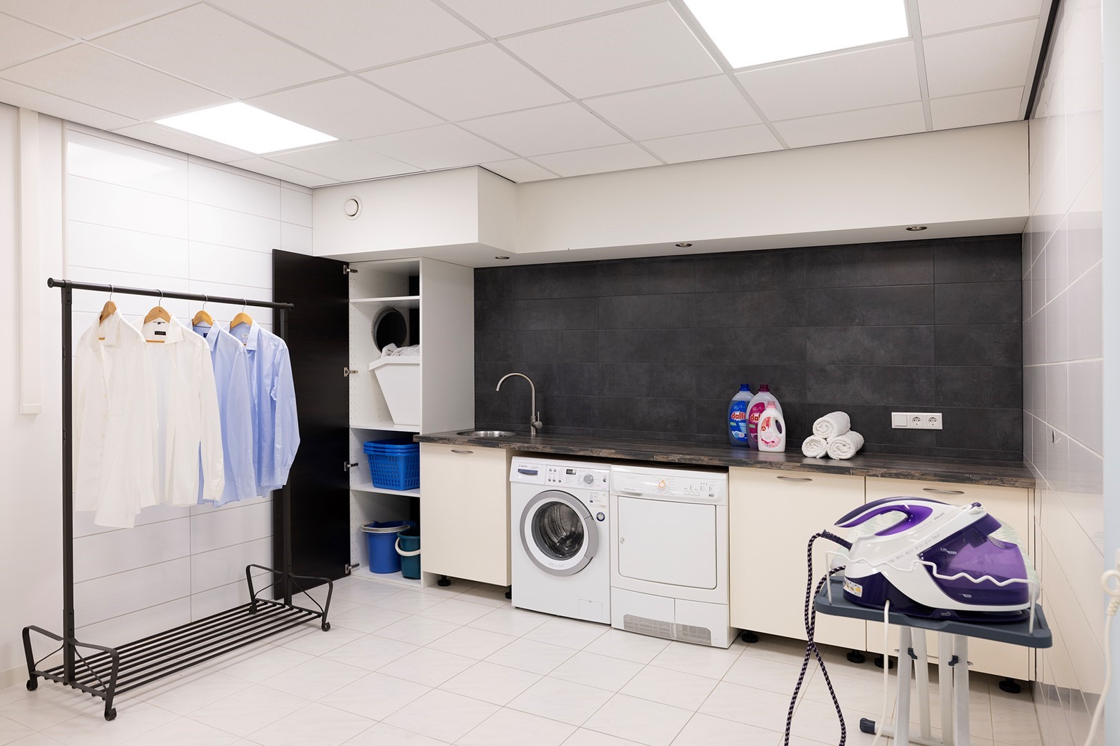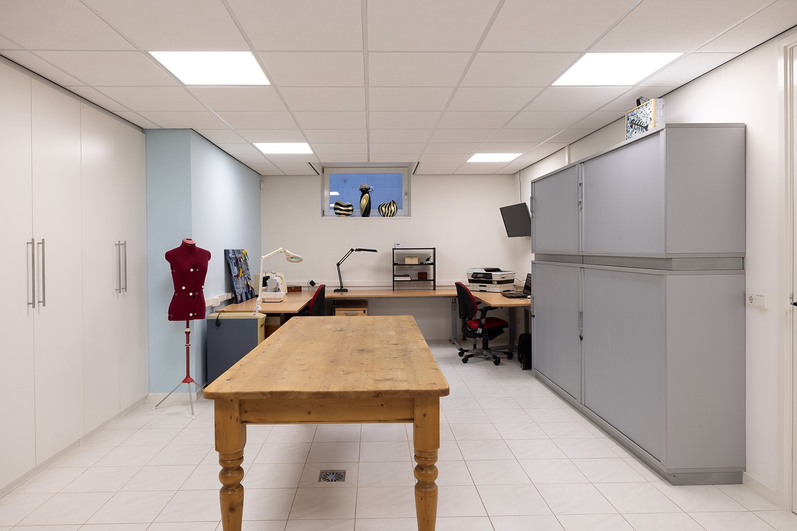 In het atelier/kantoor is een volwaardig keukenblok, een kast met stortkoker vanuit de badkamer op de eerste verdieping, aansluitingen voor wasmachine en droger en een vaste kastenwand. De dimbare ledverlichting draagt bij aan de flexibele sfeer en maakt deze ruimtes multifunctioneel. De sport-wellnessruimte heeft een elektrische sauna, een ruime inloopdouche met een regen- en handdouche en een badmeubel. Tevens is hier een internetaansluiting aanwezig, ideaal voor het creëren van een rustige werk- of ontspanningsplek. Via openslaande dubbele deuren is de berging bereikbaar, bijzonder geschikt voor seizoensspullen of opslag.