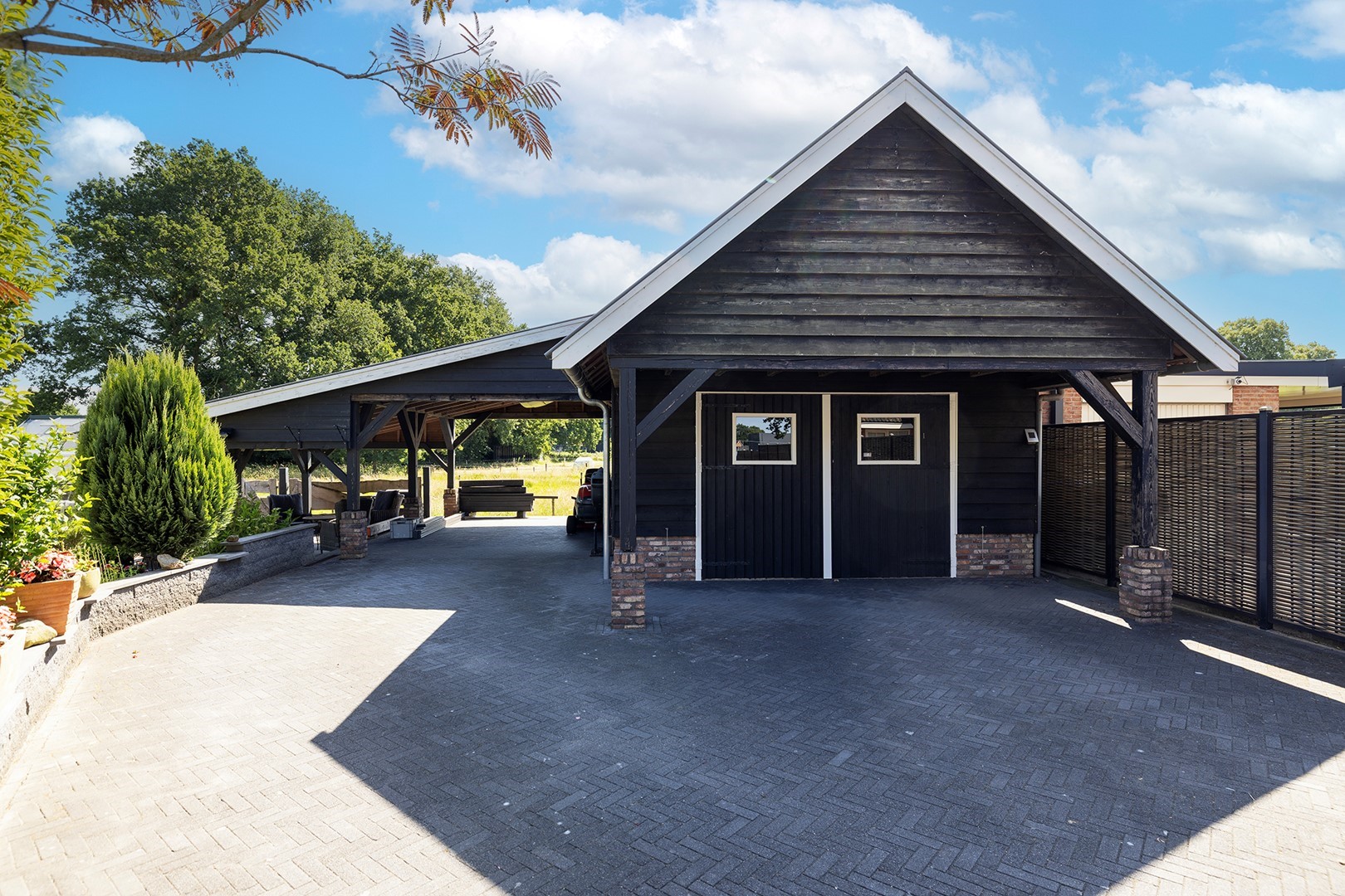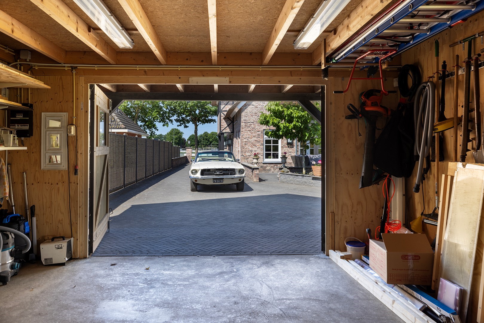 Aan de achterzijde van het perceel bevindt zich een ruime gepotdekselde garage met openslaande deuren en een overkapping. Deze multifunctionele ruimte biedt volop mogelijkheden voor opslag, hobby’s of als werkplaats. Daarnaast is er voldoende ruimte om uw auto te parkeren, wat het geheel extra praktisch maakt.