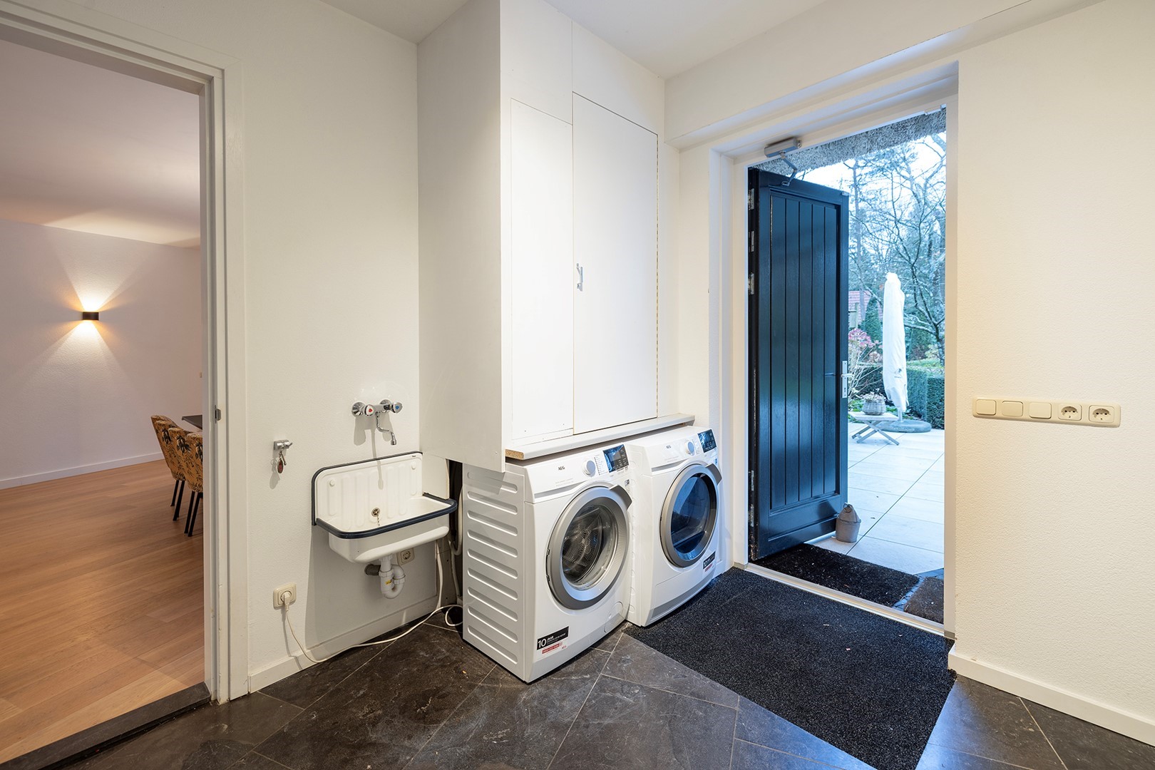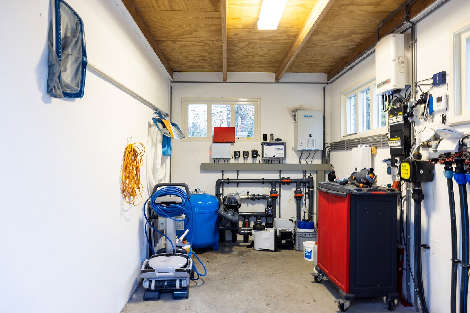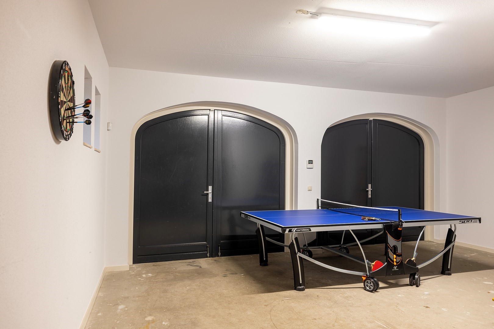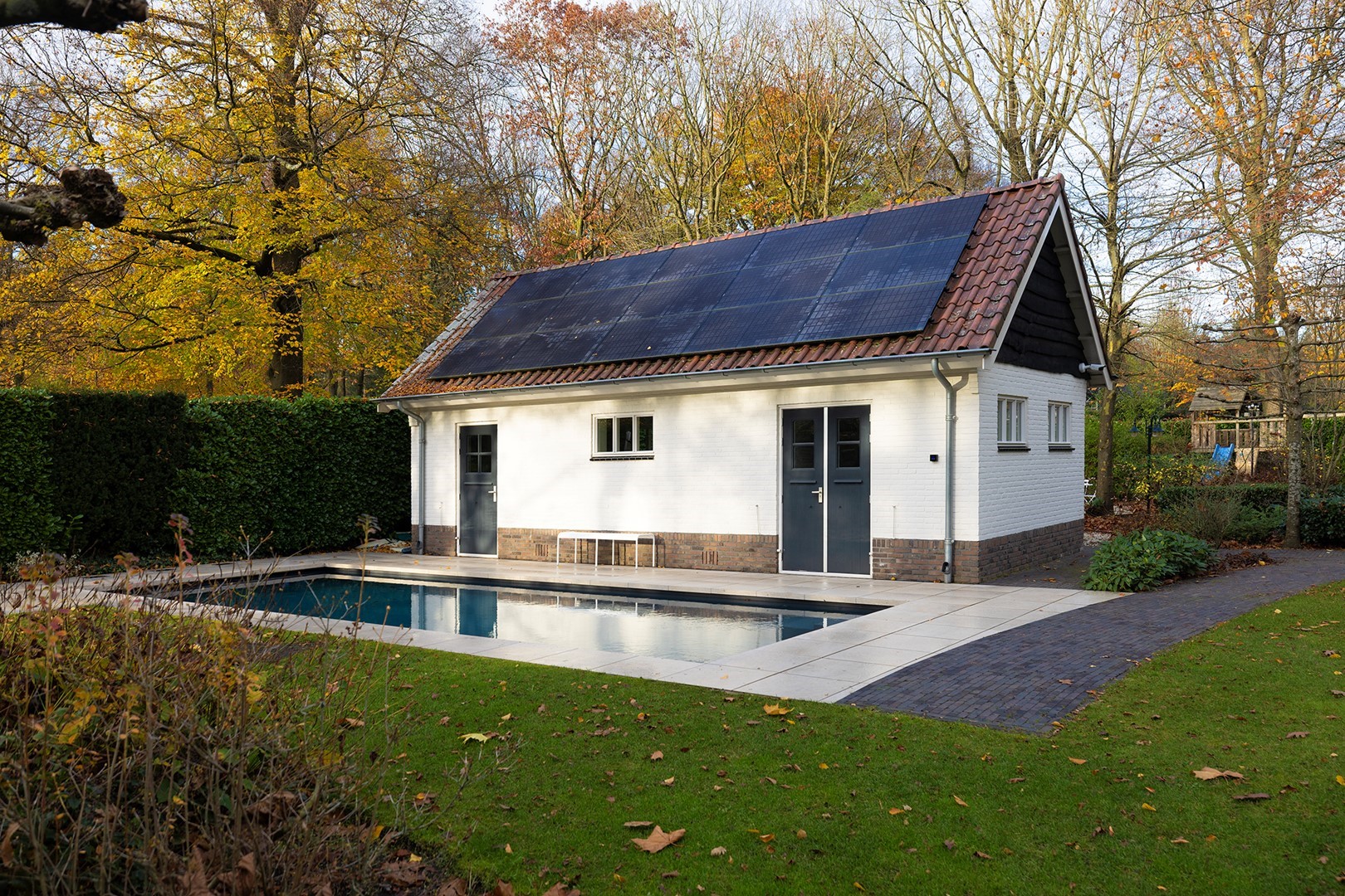 De inpandige garage heeft dubbele openslaande deuren. De laadpaal voor uw elektrische auto bevindt zich tussen de twee garage deuren. Aan de buitenkant zijn de airco-units en warmtepomp weggewerkt. De overkapping biedt ruim plek voor een sfeervol terras. Het eerste bijgebouw heeft een technische ruimte met de omvormer van zonnepanelen en de techniek voor het zwembad. De fitnessruimte is voorzien van airco. Deze ruimte is tevens geschikt als kantoor- of praktijkruimte. De vrijstaande garage heeft openslaande deuren en bevindt zich naast de tweede toegangspoort.