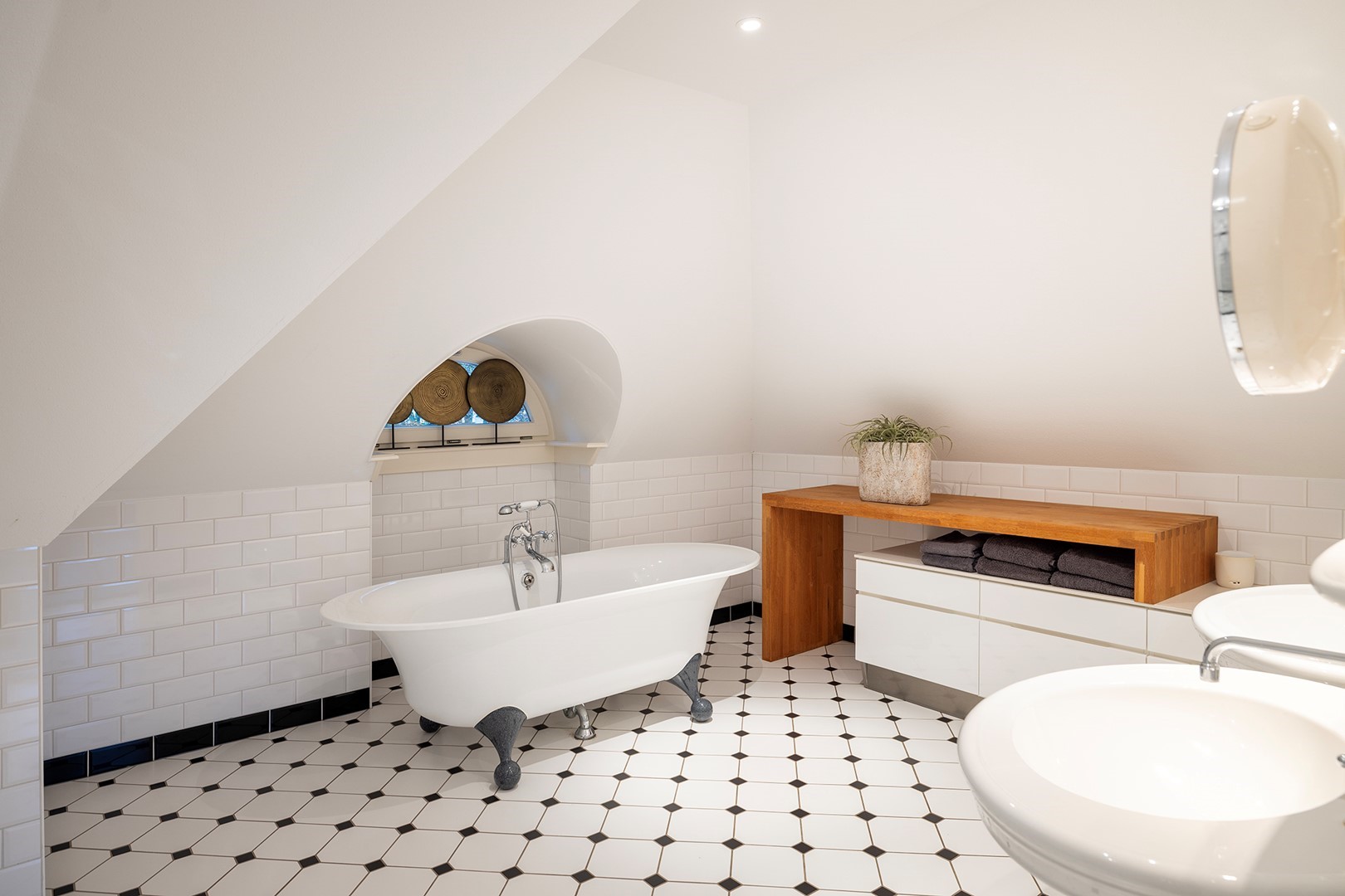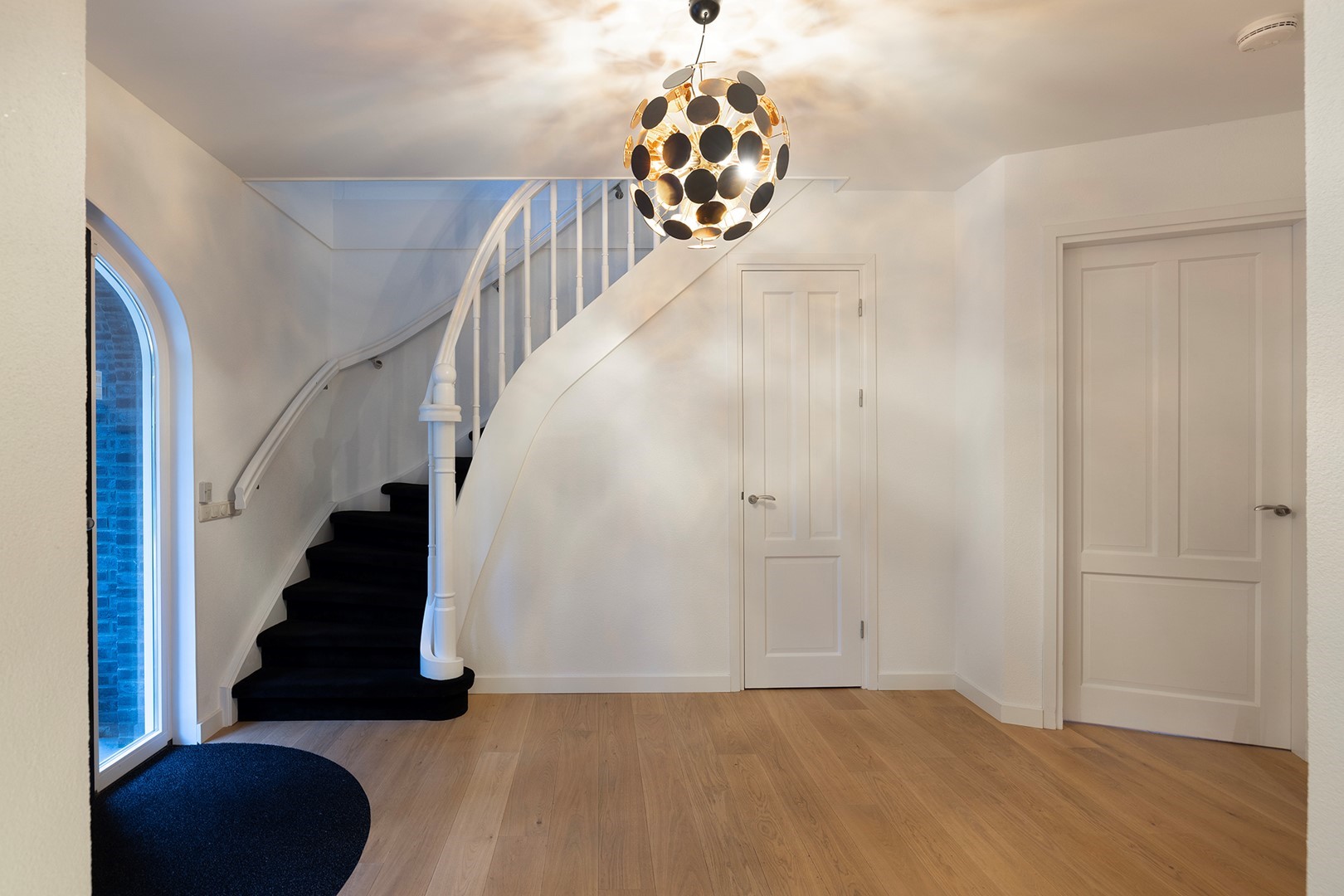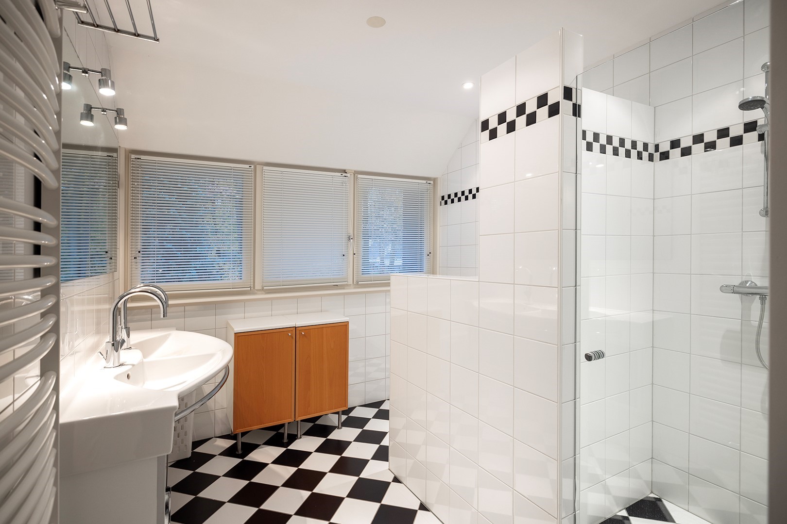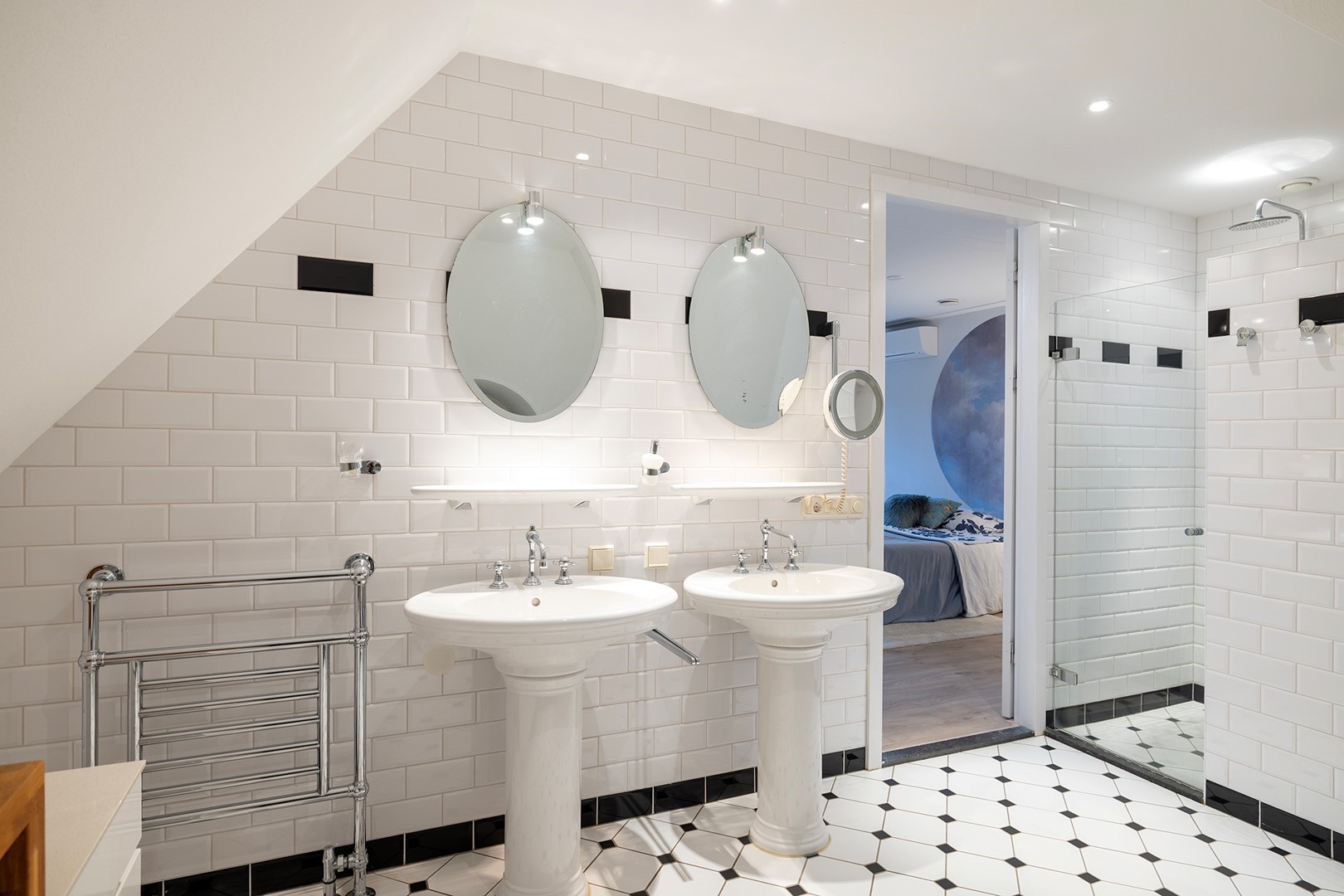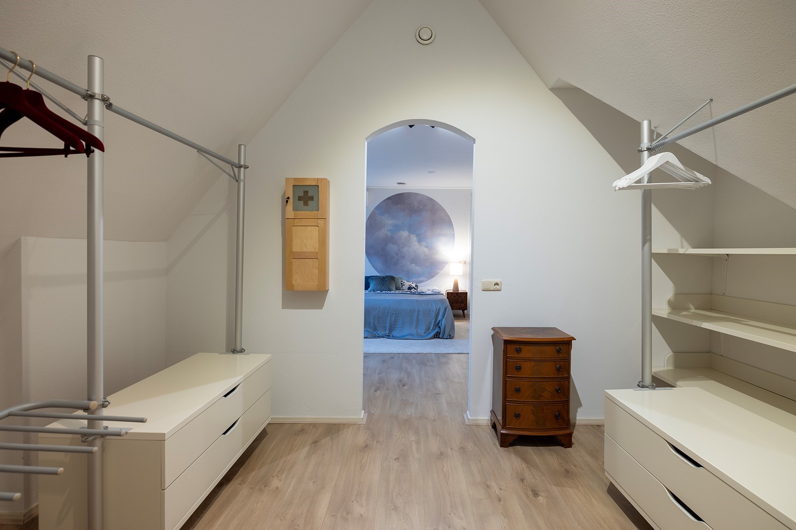Een karakteristieke trap geeft toegang tot de eerste verdieping. Hier zijn maar liefst vijf slaapkamers waarvan de master bedroom is voorzien van een badkamer en suite én een walk in closet. Deze badkamer heeft een douchecabine, een toilet, een vrijstaand bad, dubbele wastafel en is voorzien van vloerverwarming. De tweede en derde slaapkamer hebben toegang tot de loggia, het inpandige balkon. Onder de trap is een bergkast aanwezig. De tweede badkamer heeft een douchecabine, een toilet en een dubbele wastafel. Vervolgens bieden de vierde en vijfde kamer fijne ruimtes voor uw kinderen en/of gasten.