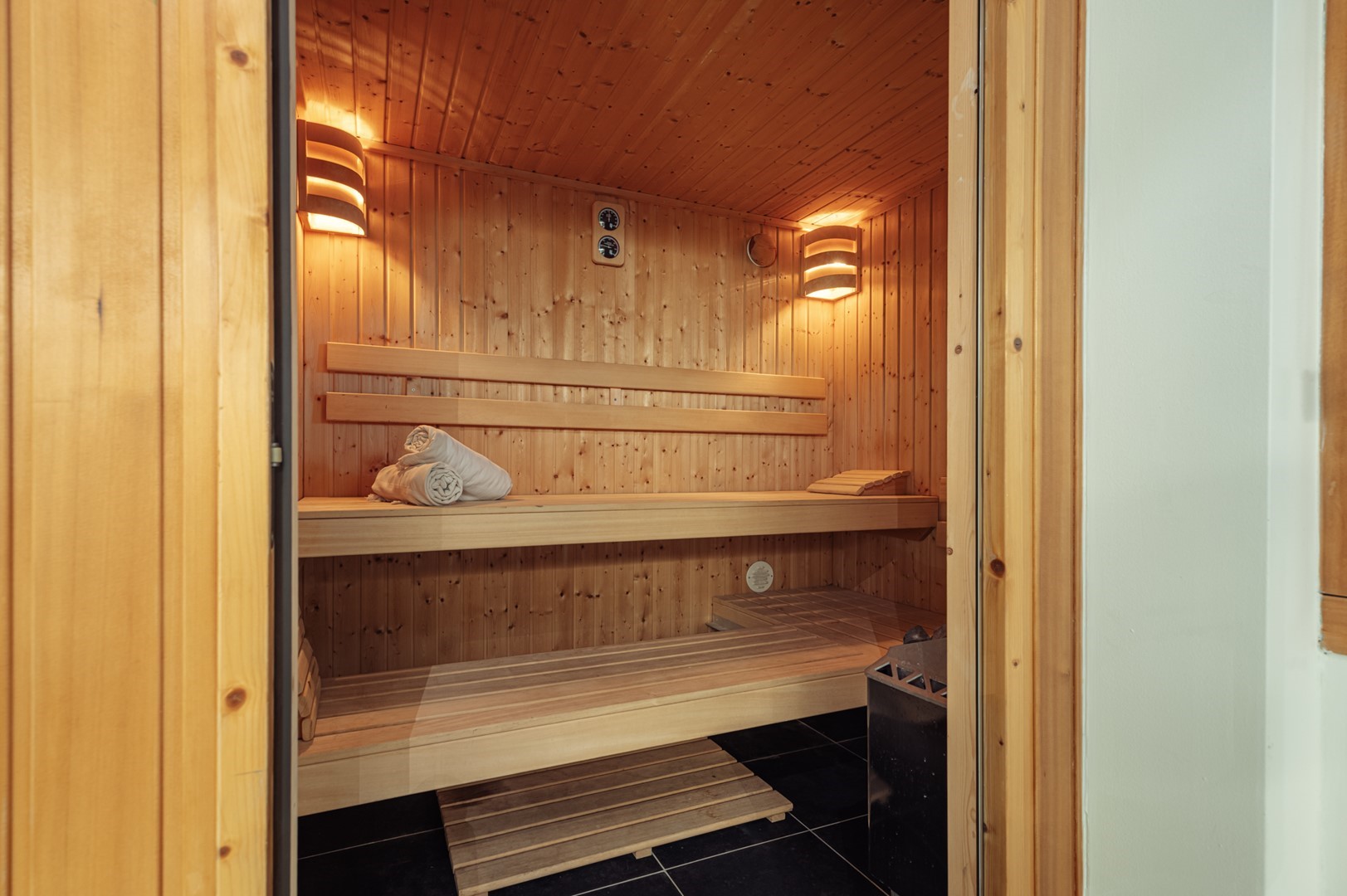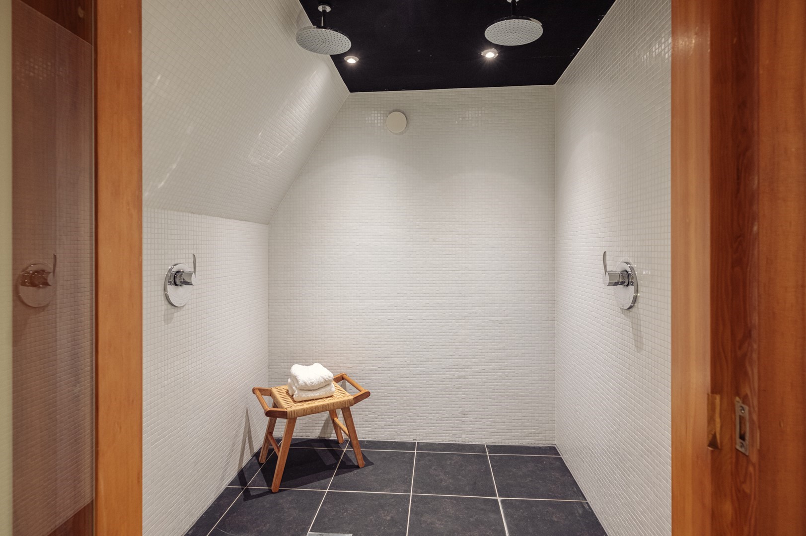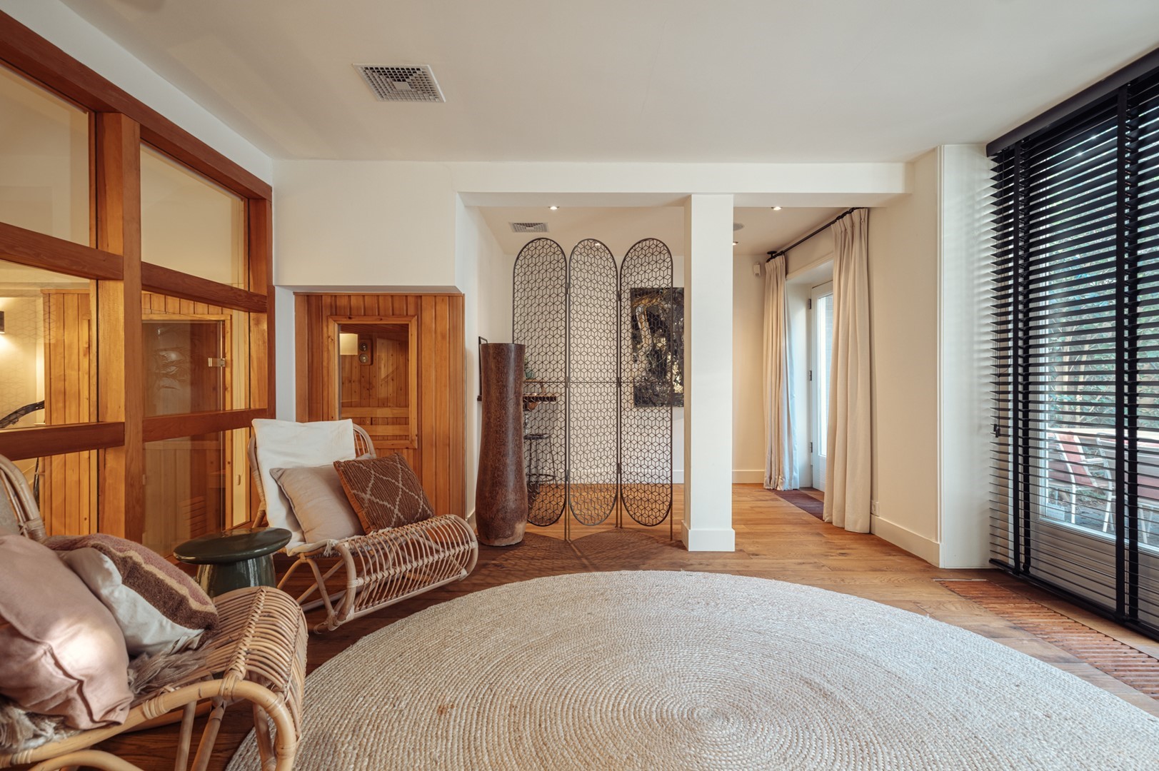 The garden floor has full ceiling height and is currently arranged as a wellness, yoga, and fitness area with a double walk-in shower, sauna, and guest accommodation. This level is also perfectly suited for use as a home office. At the rear, French doors provide direct access to the west-facing garden.