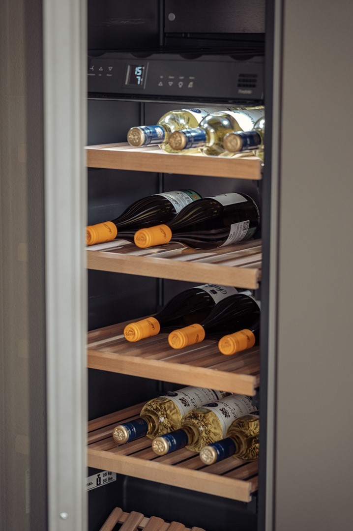 The next floor, with a ceiling height of approximately 3.70 meters, forms the heart of the home. Here, the living room spans the full width of the square side, offering beautiful, unobstructed views. The luxuriously finished open kitchen (SieMatic) with Gaggenau ovens and a cooking island is located on the west side, while the seating area is equipped with a fireplace. Large windows and French doors opening onto the balcony further enhance the sense of space.