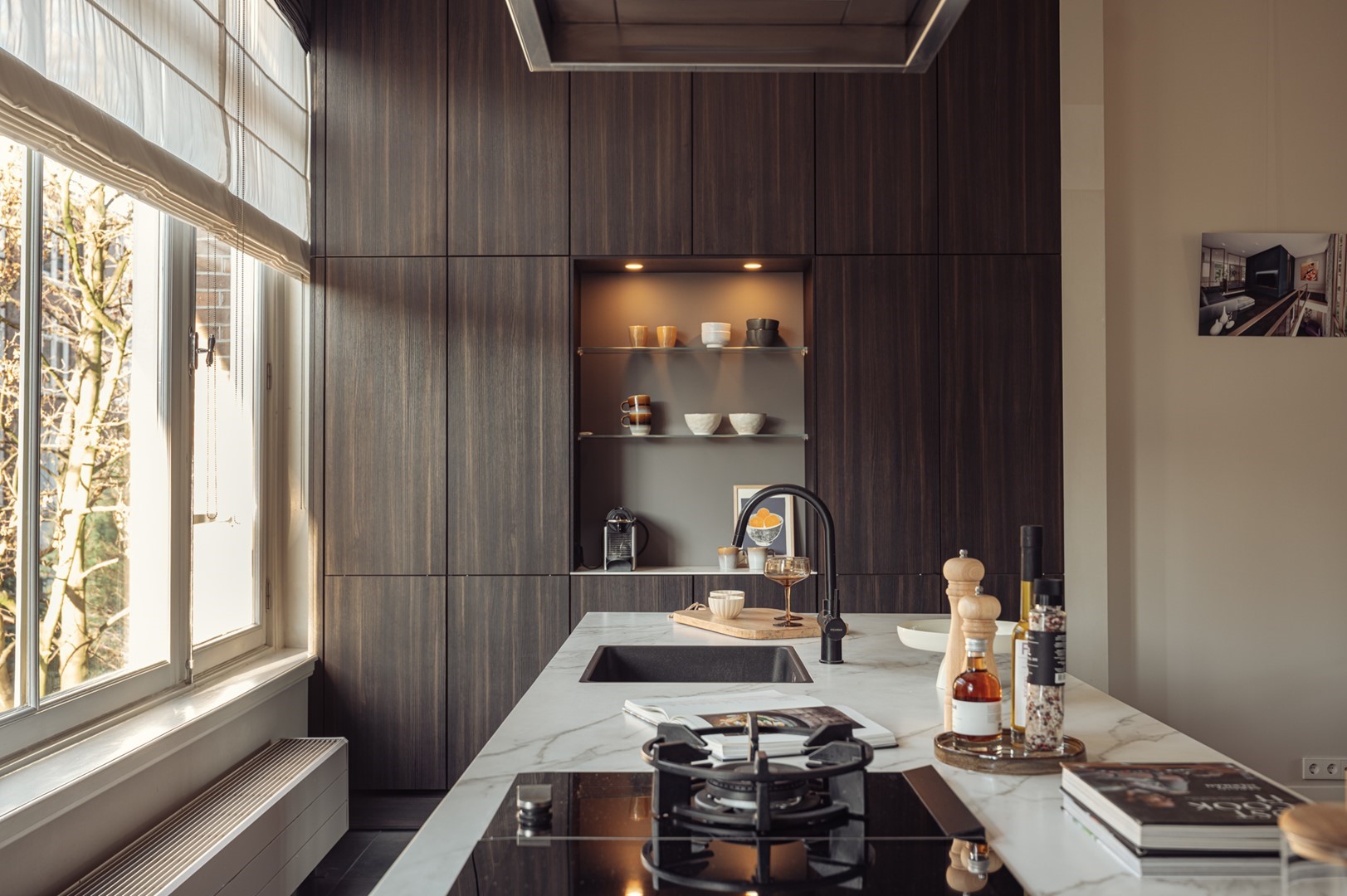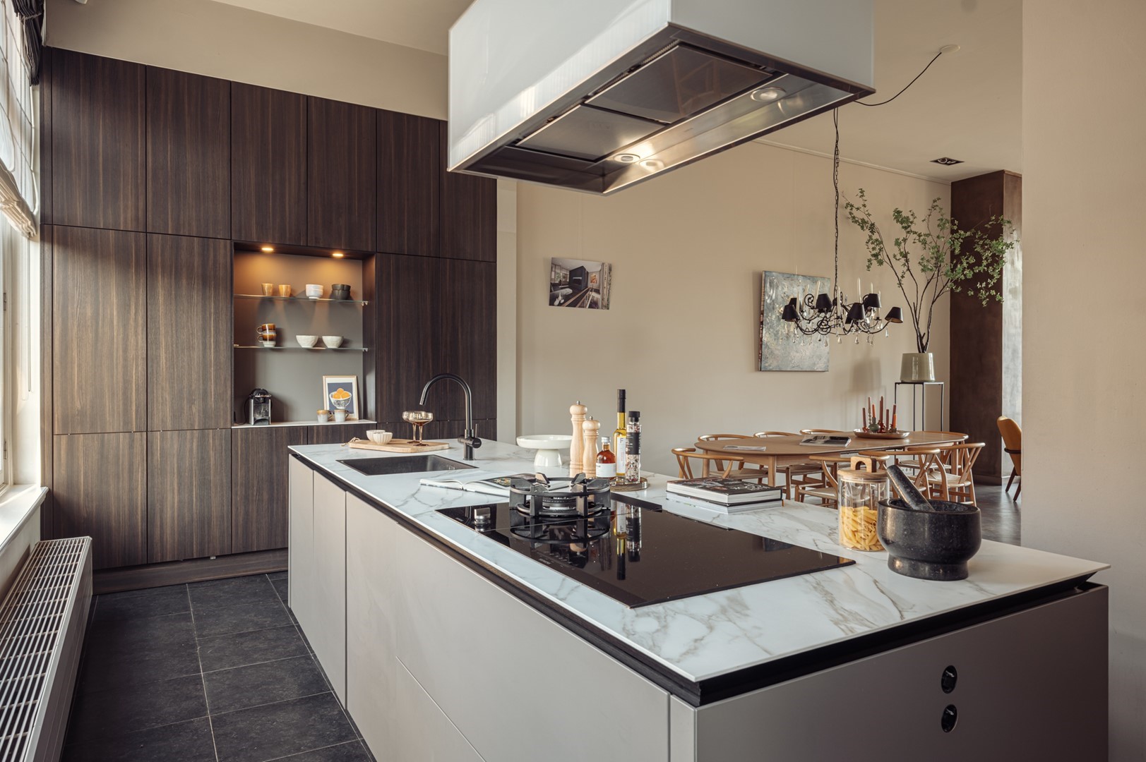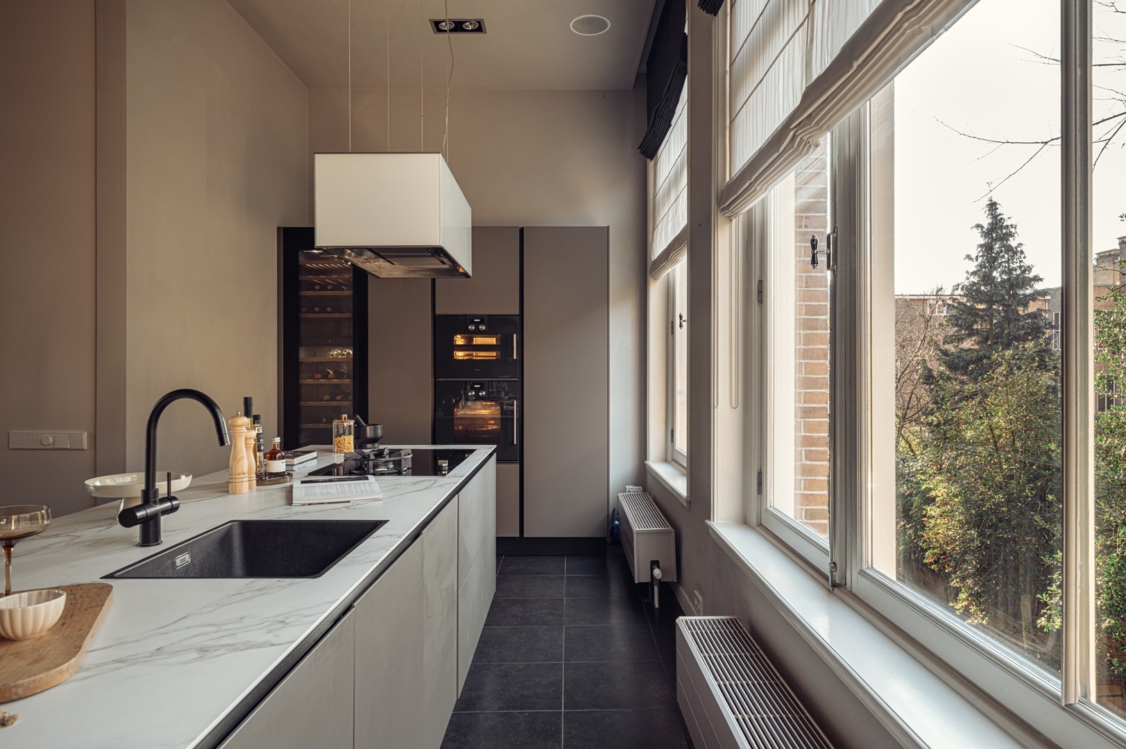 De daaropvolgende woonlaag met een plafondhoogte van circa 3.70 meter vormt het hart van het huis. Hier bevindt zich de woonkamer over de volle breedte aan het plein, met een prachtig vrij uitzicht. De luxe uitgevoerde open keuken (SieMatic) met Gaggenau-ovens en kookeiland ligt aan de westzijde, en het zitgedeelte is voorzien van een open haard. Grote raampartijen en openslaande deuren naar het balkon versterken het ruimtelijke gevoel.