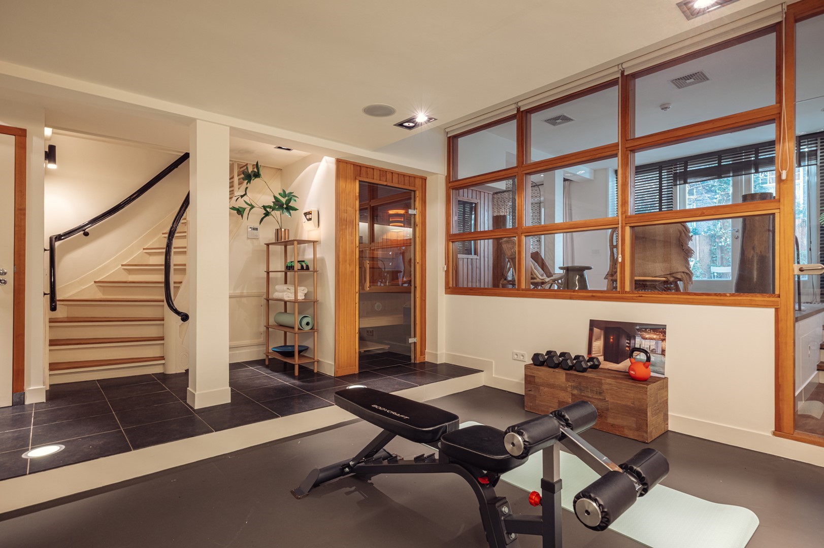 De tuinverdieping heeft een volwaardige hoogte en is momenteel ingericht als wellness-/yoga-/fitnessruimte met dubbele inloopdouche, een sauna en een gastenverblijf. Deze verdieping leent zich ook uitstekend als kantoor aan huis. Aan de achterzijde is er middels openslaande deuren directe toegang tot de op het westen gelegen tuin.