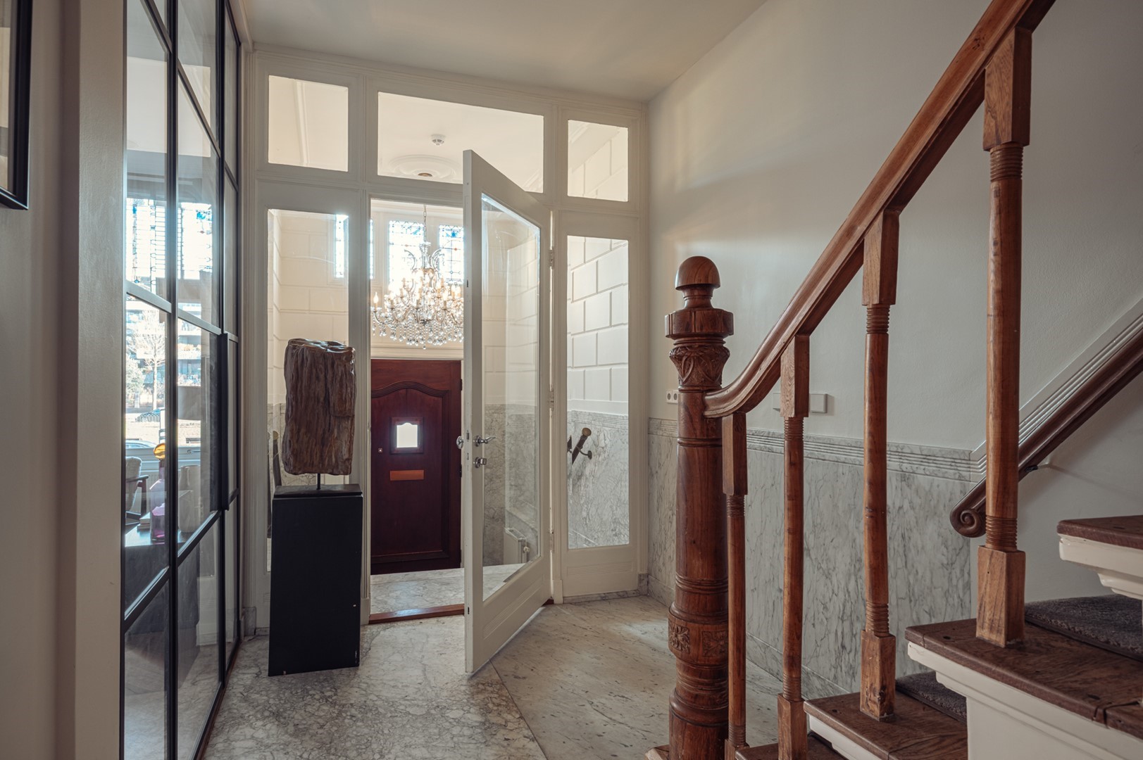 Via de eigen voortuin, bereikbaar middels een hardstenen stoep, betreedt u dit indrukwekkende pand. De entree is royaal en ademt grandeur, met een imposante hal voorzien van marmer en een tussenportaal welke tevens functioneert als veiligheidsluis. Vanuit hier heeft u toegang tot zowel de tuinverdieping als de bel-etage.