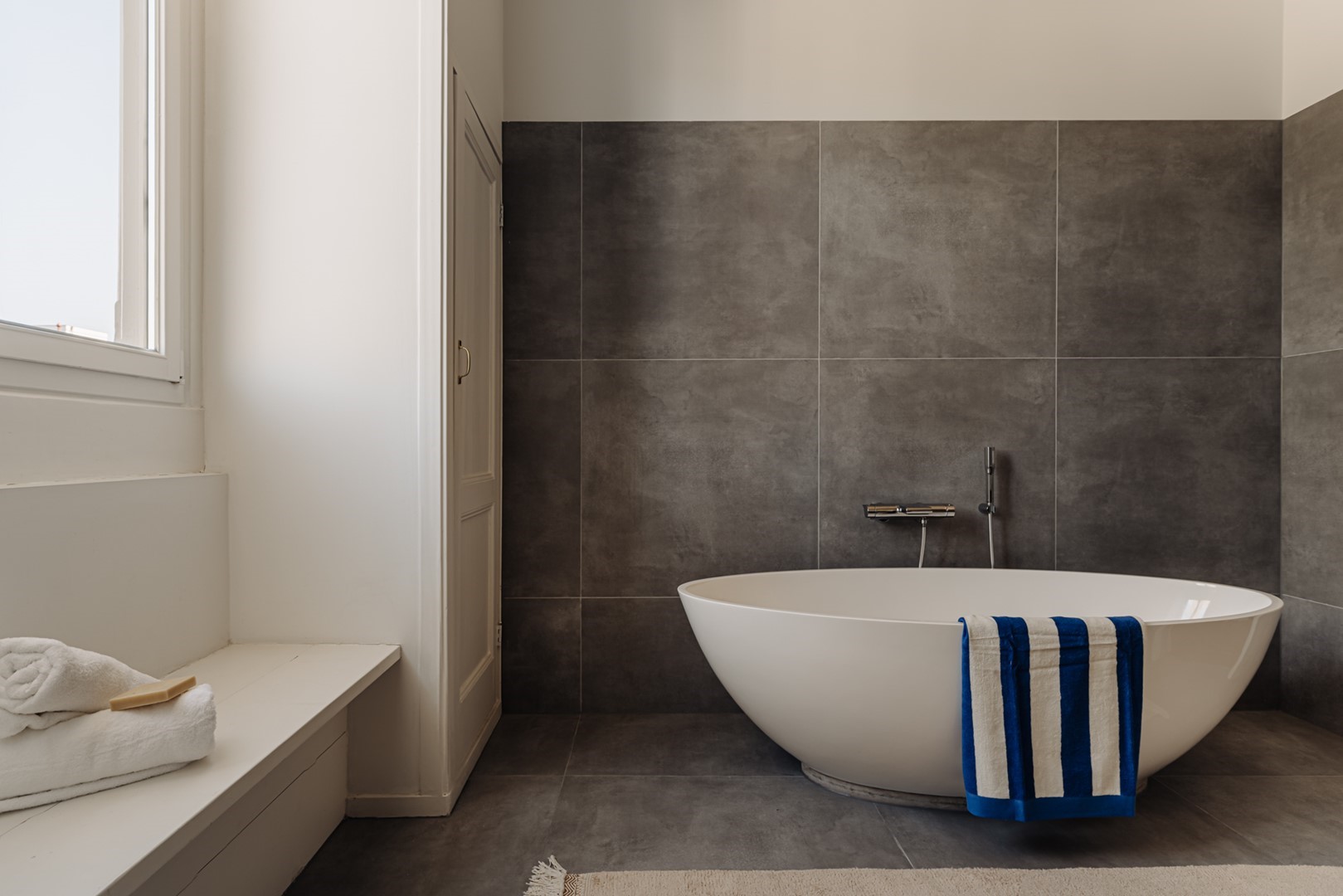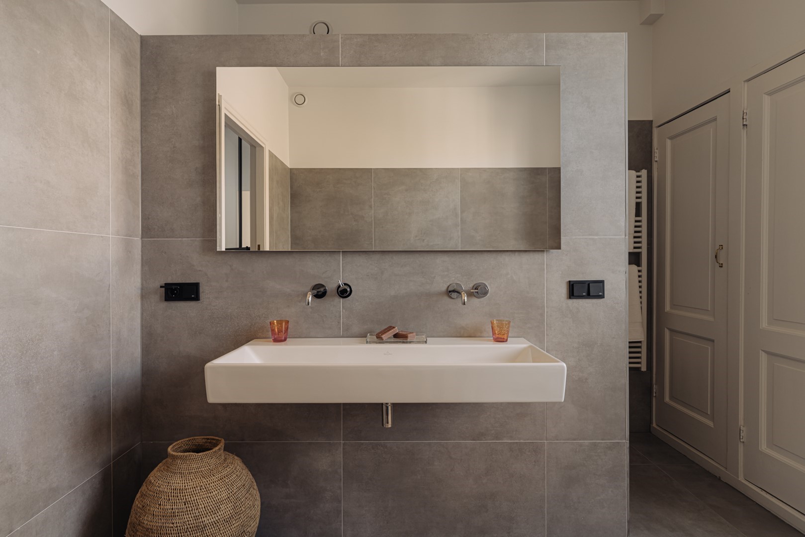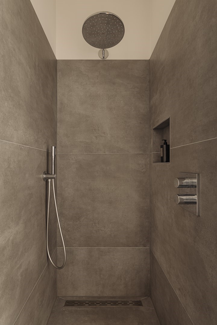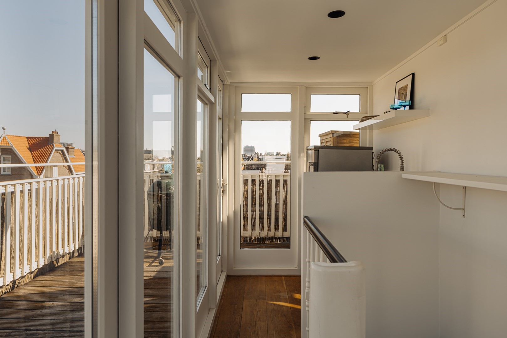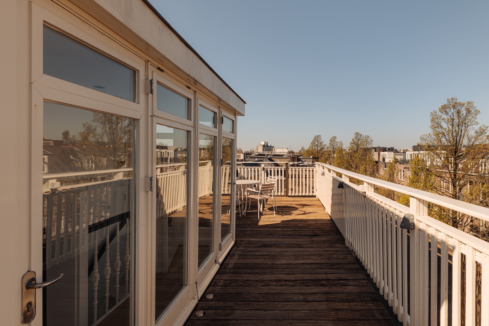 Through modern black pivot doors, access is provided to the roof terrace of approximately 33 m², oriented towards the south-west and equipped with a kitchenette with refrigerator. An ideal setting for long evenings in the sun, overlooking the rooftops of Amsterdam South and towards the Museumplein and the Concertgebouw.