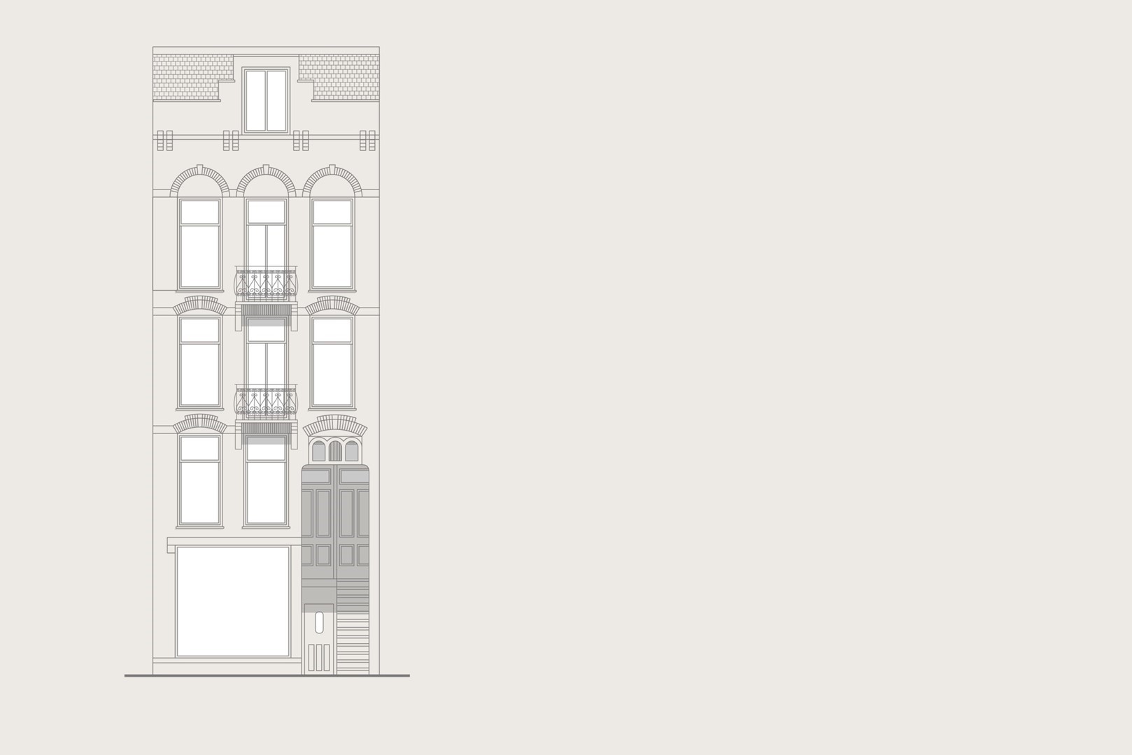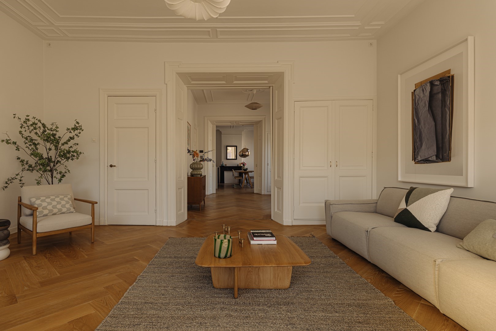 Een klassieke kamer-en-suite vormt het hart van de woonverdieping, met glas-in-loodschuifdeuren, vaste kasten en hoge plafonds van ruim drie meter. Aan de voorzijde een lichte living met erker en zicht op het levendige straatbeeld van de Van Baerlestraat; centraal een eetkamer die in directe verbinding staat met de keuken. Deze strakke woonkeuken combineert modern comfort met klassieke elegantie en is voorzien van diverse inbouwapparatuur. Openslaande deuren geven toegang tot een intiem balkon op het noorden. De visgraatparketvloer en verfijnde detaillering zorgen voor een evenwichtige en elegante beleving.