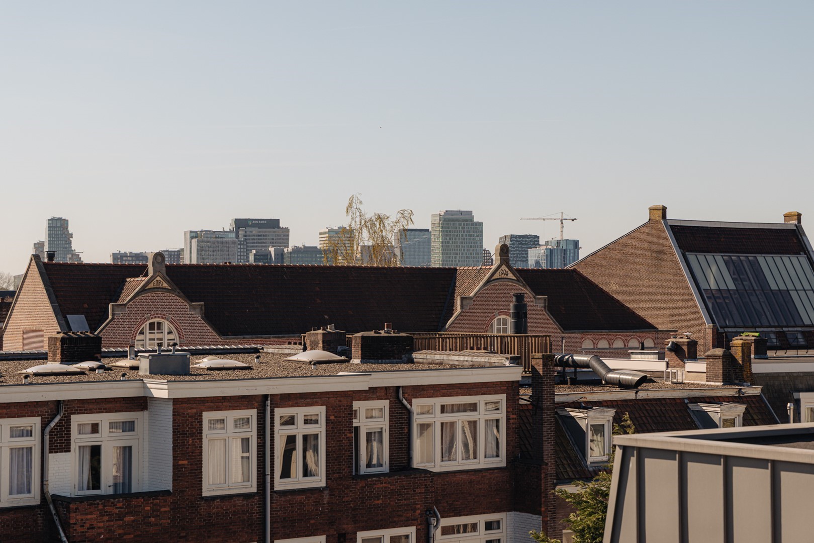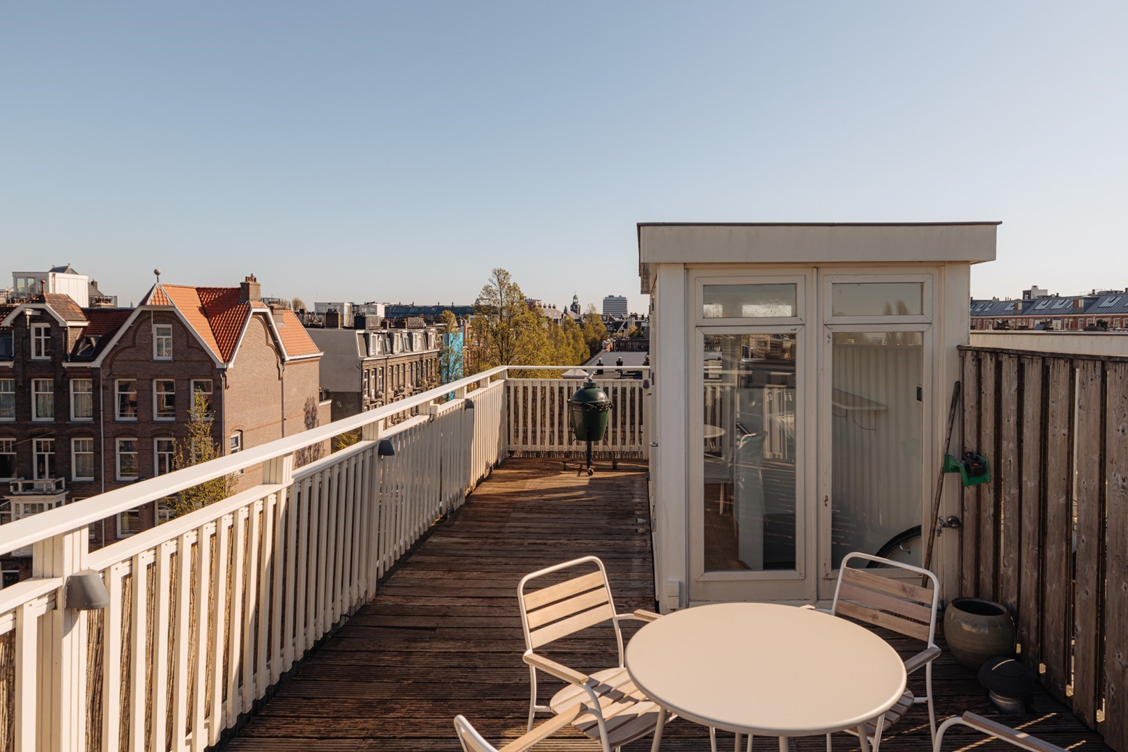 Via moderne zwarte taatsdeuren toegang tot het dakterras van circa 33 m², gelegen op het zuidwesten en voorzien van een kitchenette met koelkast. Een ideale setting voor lange avonden in de zon, met uitzicht over de daken van Amsterdam-Zuid en richting het Museumplein en het Concertgebouw.