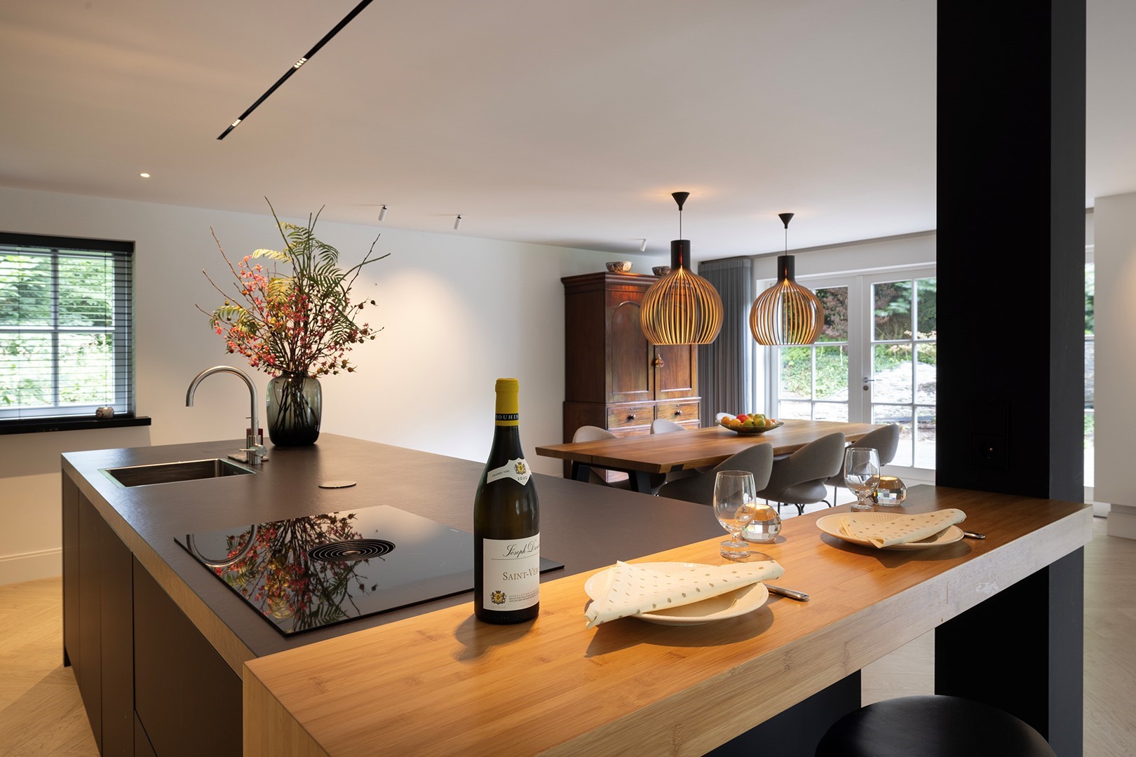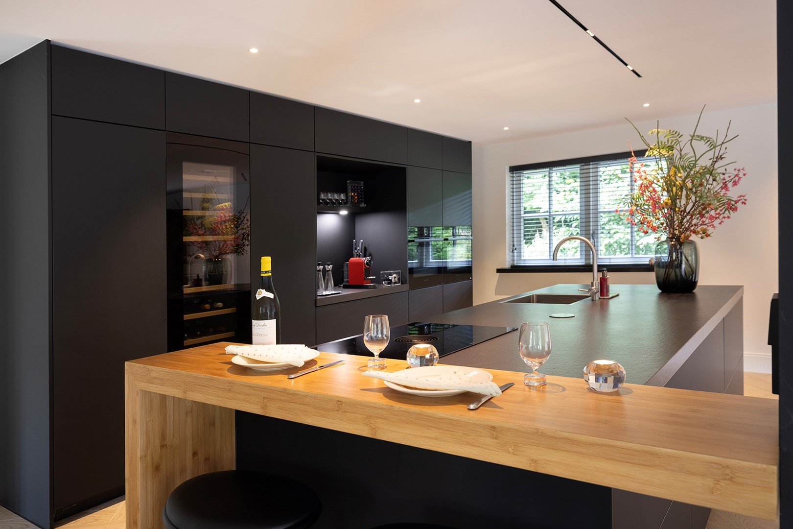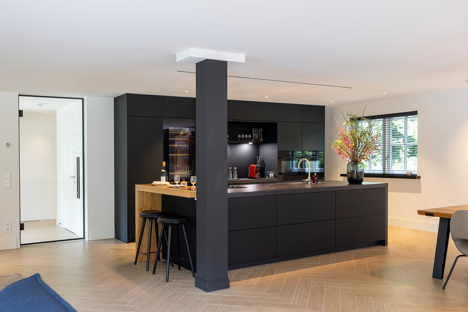 De op maat ontworpen matzwarte woonkeuken is volledig uitgerust met hoogwaardige apparatuur: een kastenwand met twee ingebouwde Bosch ovens, een Liebherr wijnklimaatkast, koel-/vriescombinatie, koffiecorner en een royaal kook-/spoeleiland met BORA inductiekookplaat (met geïntegreerde afzuiging), vaatwasser en een gezellige eetbar. De verschuifbare opbouwspots boven het eiland maken het geheel compleet.