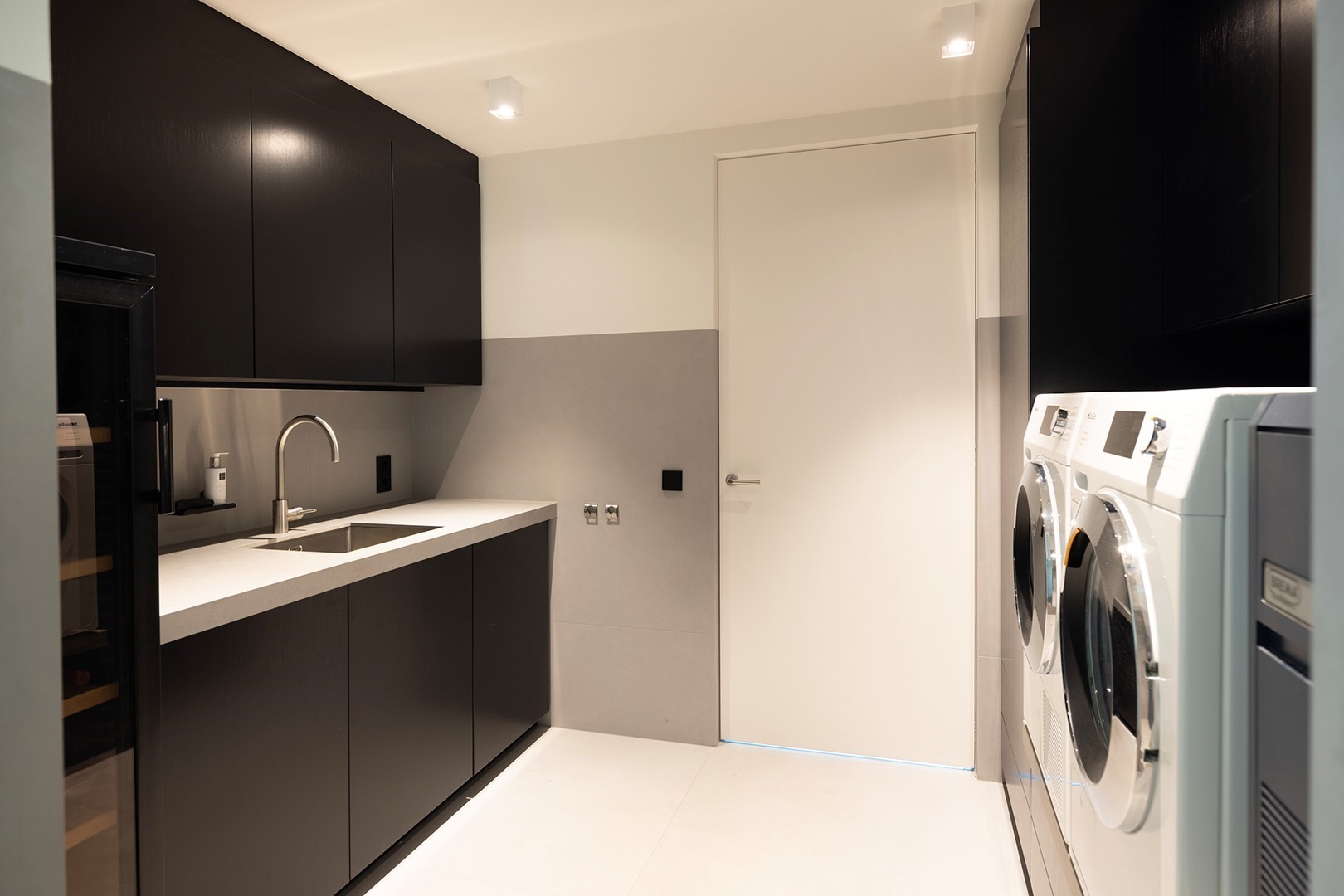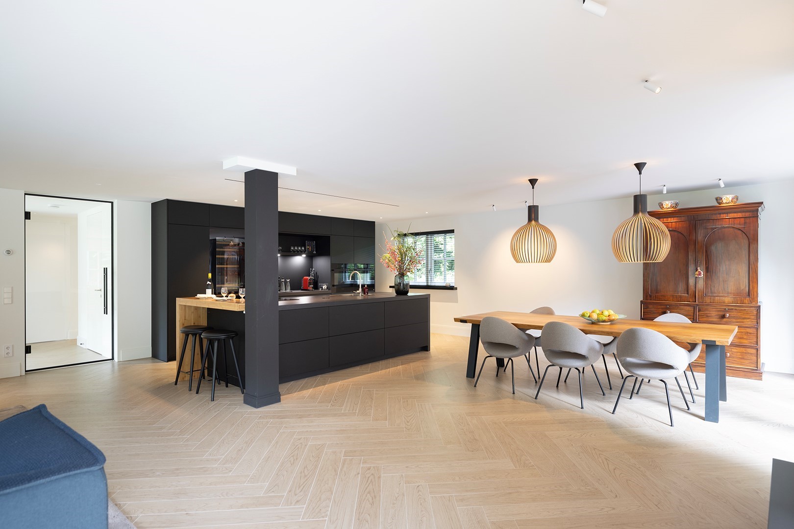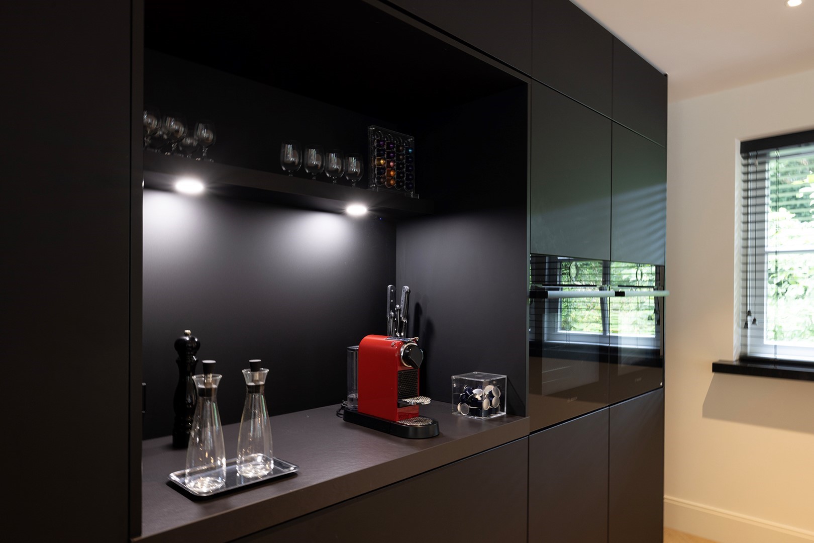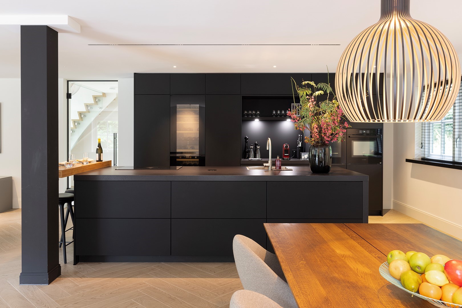 De op maat ontworpen matzwarte woonkeuken is volledig uitgerust met hoogwaardige apparatuur: een kastenwand met twee ingebouwde Bosch ovens, een Liebherr wijnklimaatkast, koel-/vriescombinatie, koffiecorner en een royaal kook-/spoeleiland met BORA inductiekookplaat (met geïntegreerde afzuiging), vaatwasser en een gezellige eetbar. De verschuifbare opbouwspots boven het eiland maken het geheel compleet.