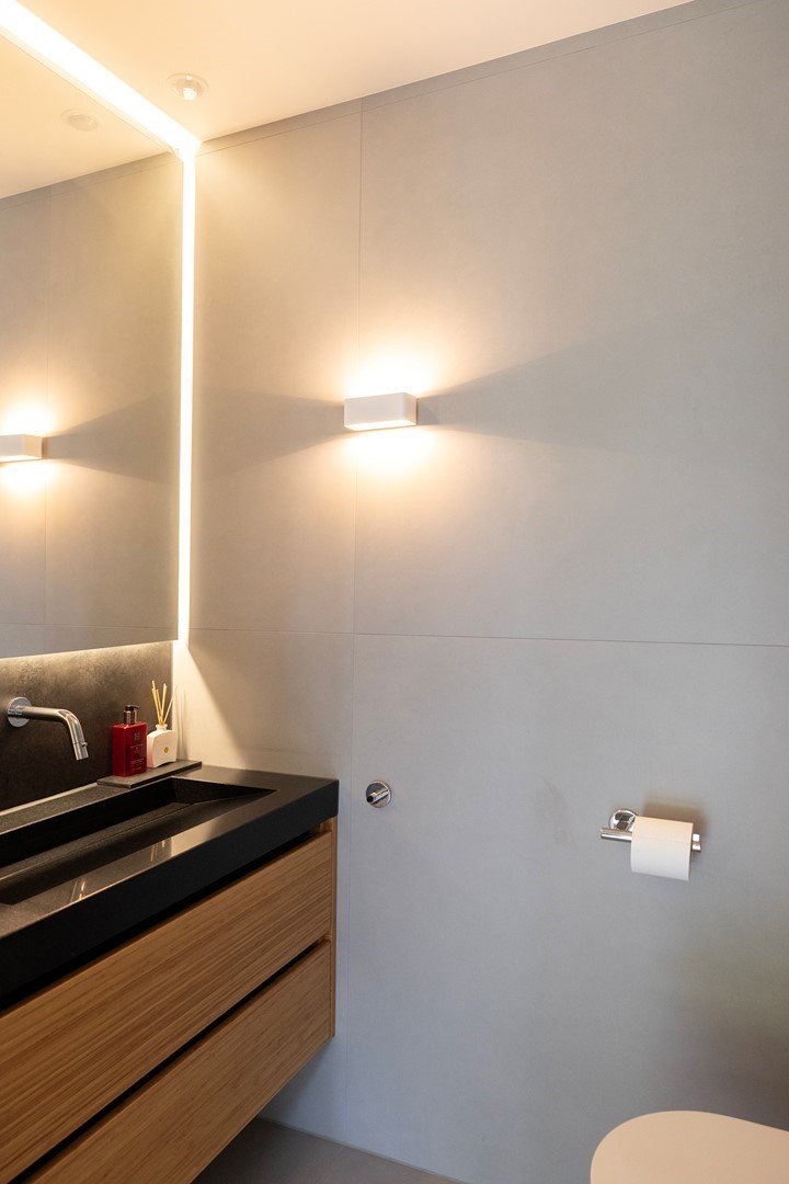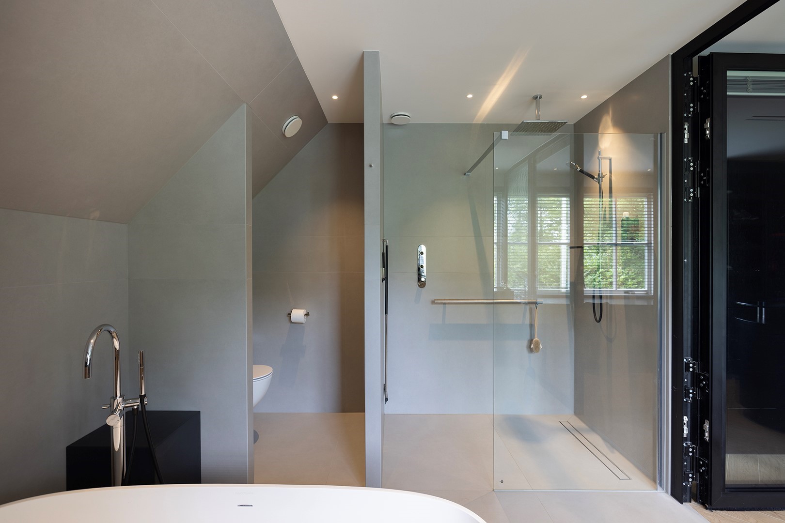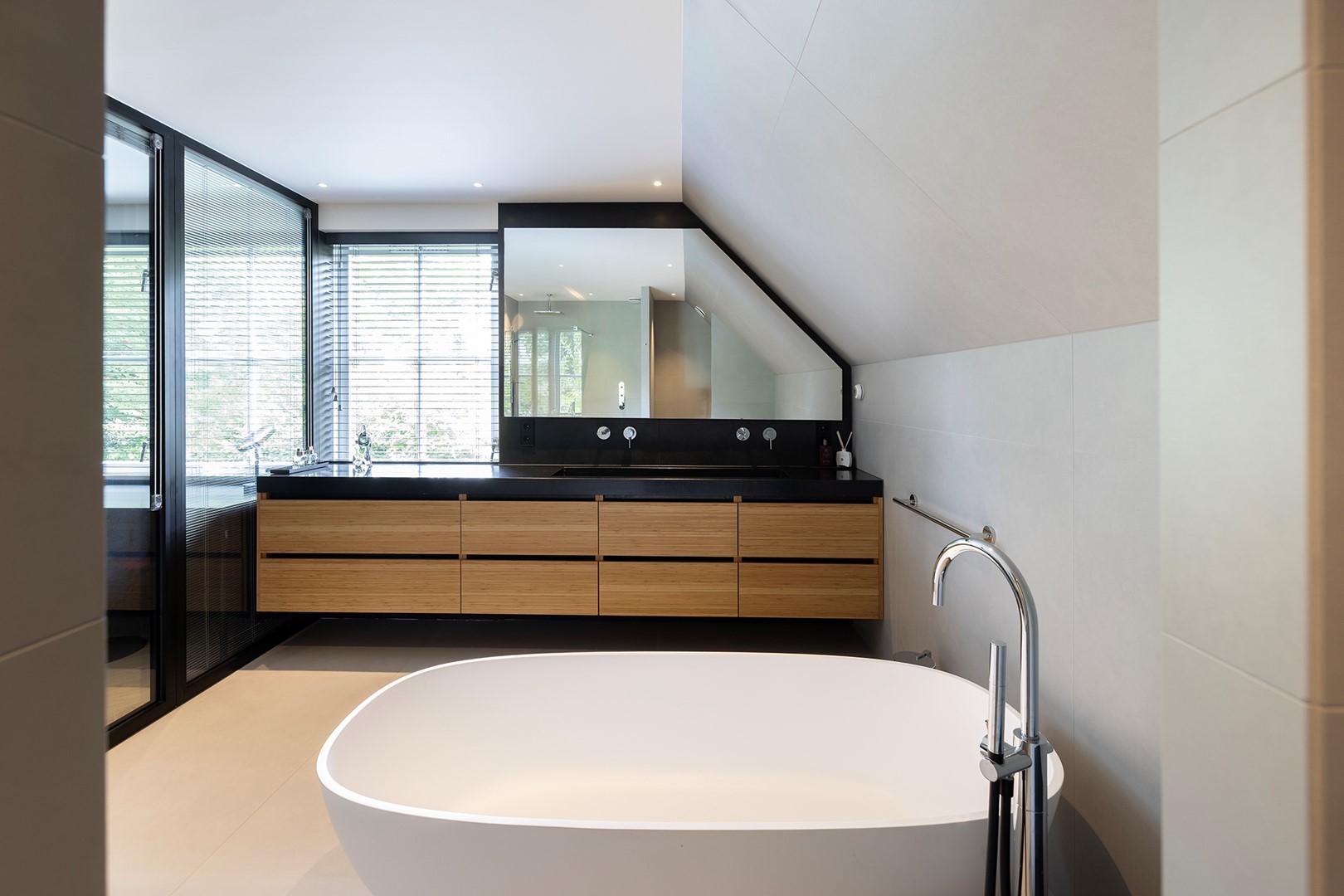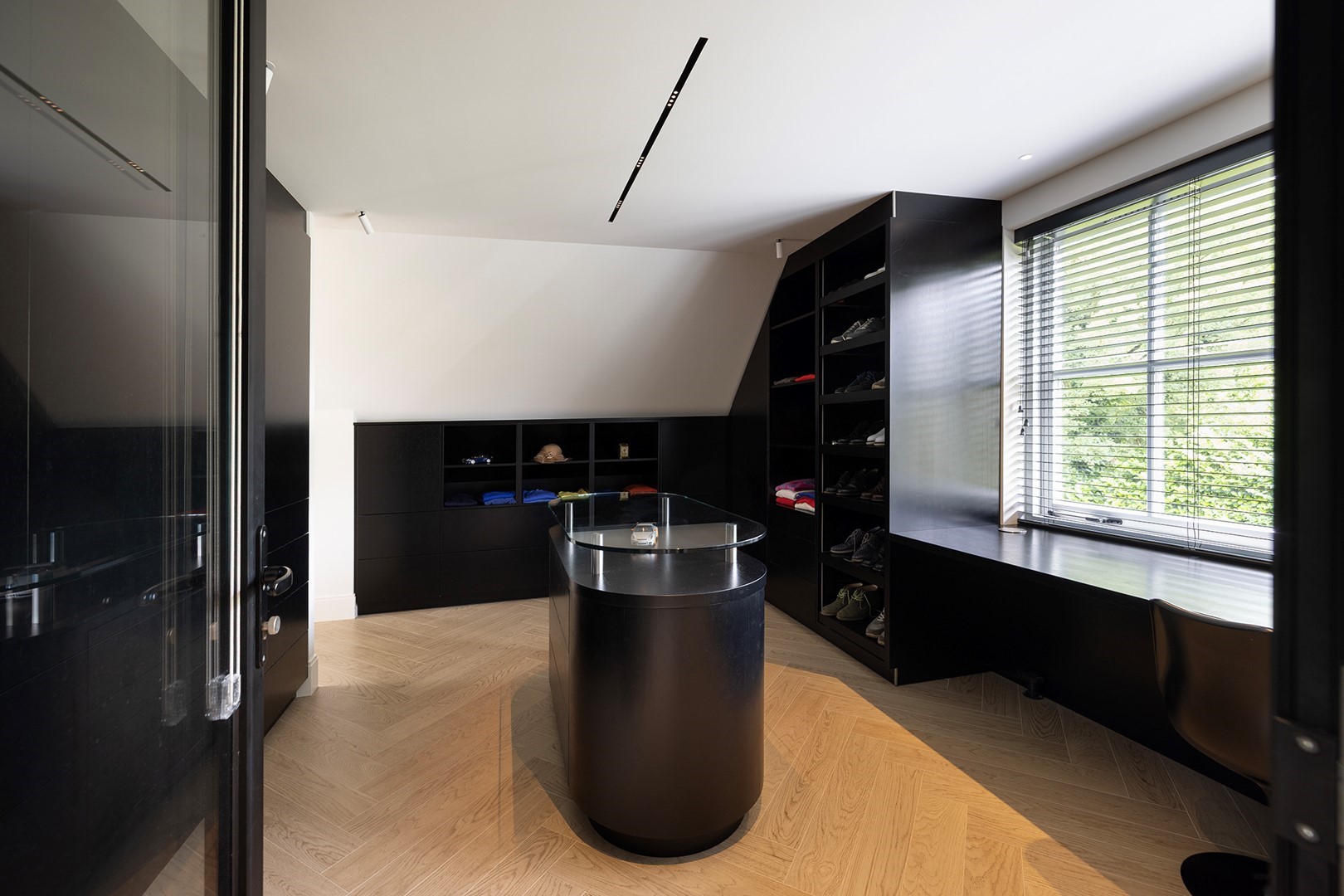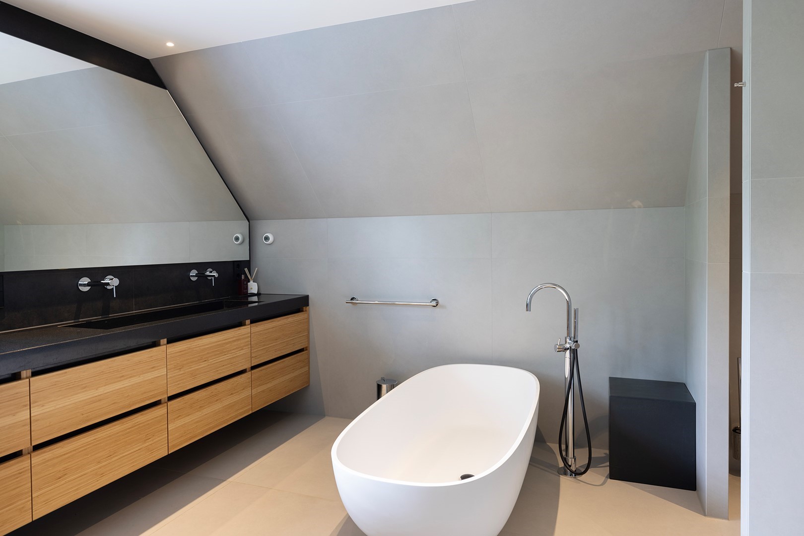 De master bedroom aan de achterzijde is een oase van rust: ruim, licht en met zicht op het groen. Via glazen deuren bereik je de riante inloopkast met luxe, op maat gemaakte kledingkasten en geïntegreerde verlichting. Aansluitend bevindt zich de exclusieve badkamer, ingericht met een vrijstaand Dado Quartz ligbad, maatwerk wastafelmeubel (Assenti) met zwart natuurstenen blad, een ruime inloopdouche en een toilet. Alles in een serene en stijlvolle afwerking.