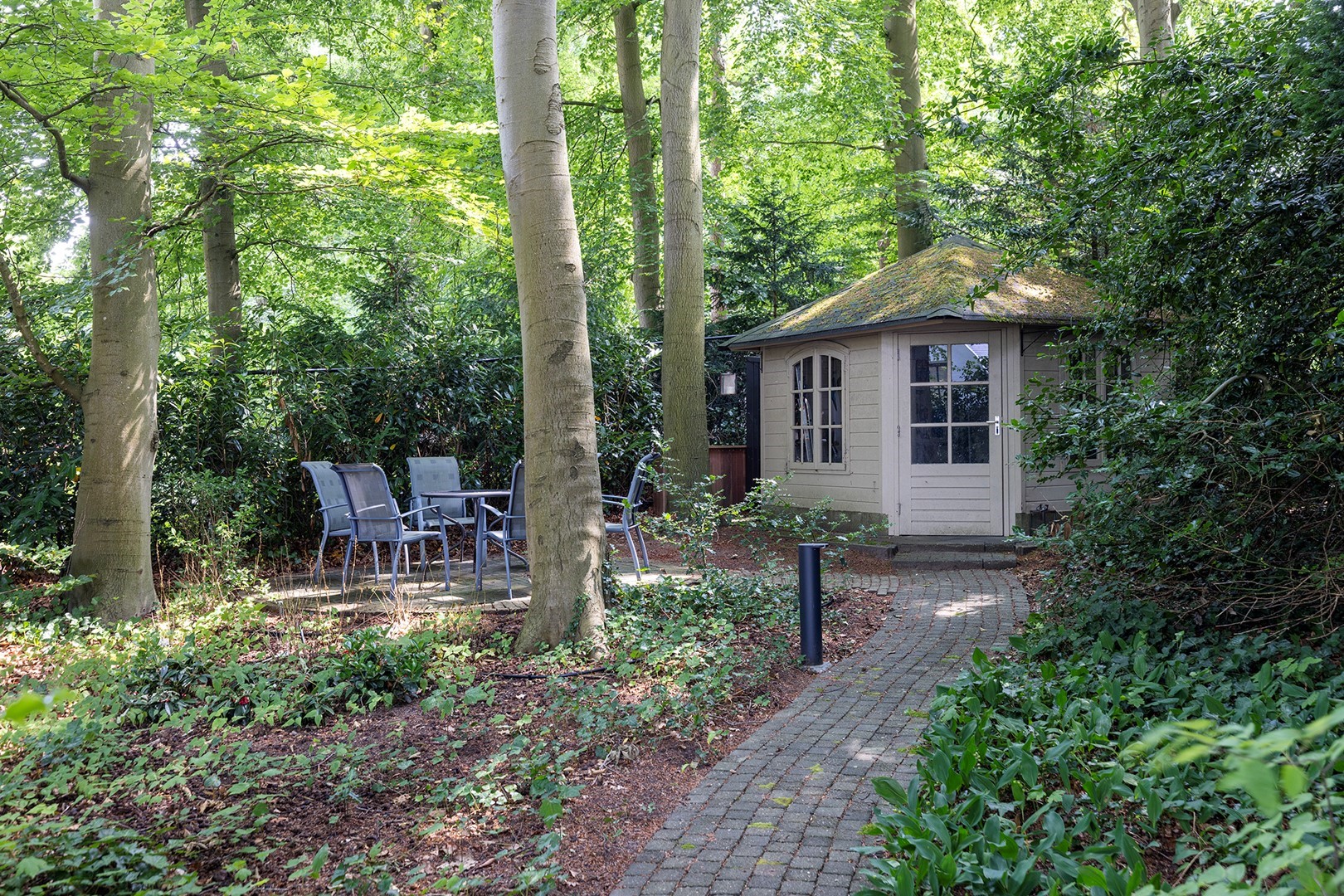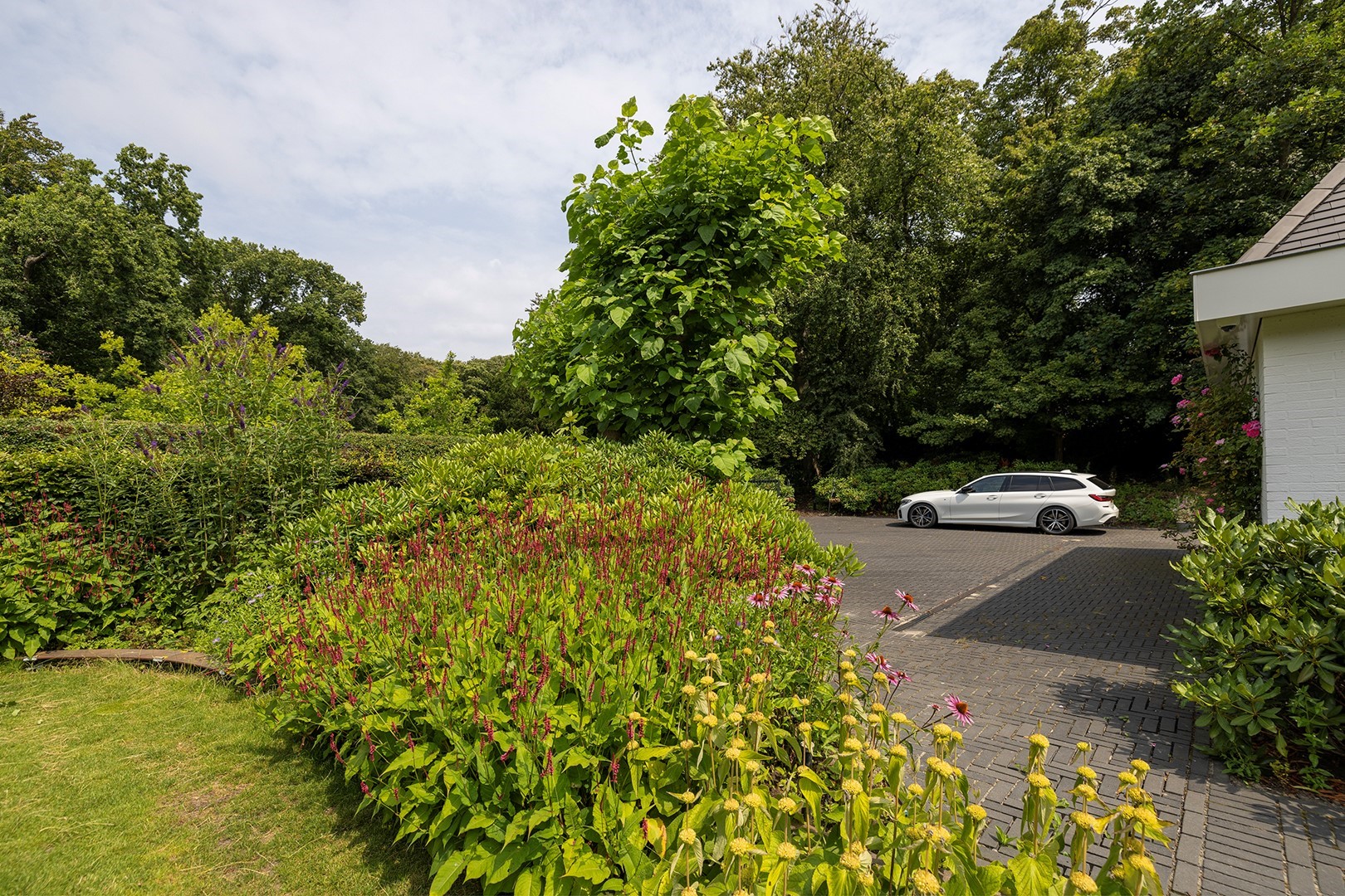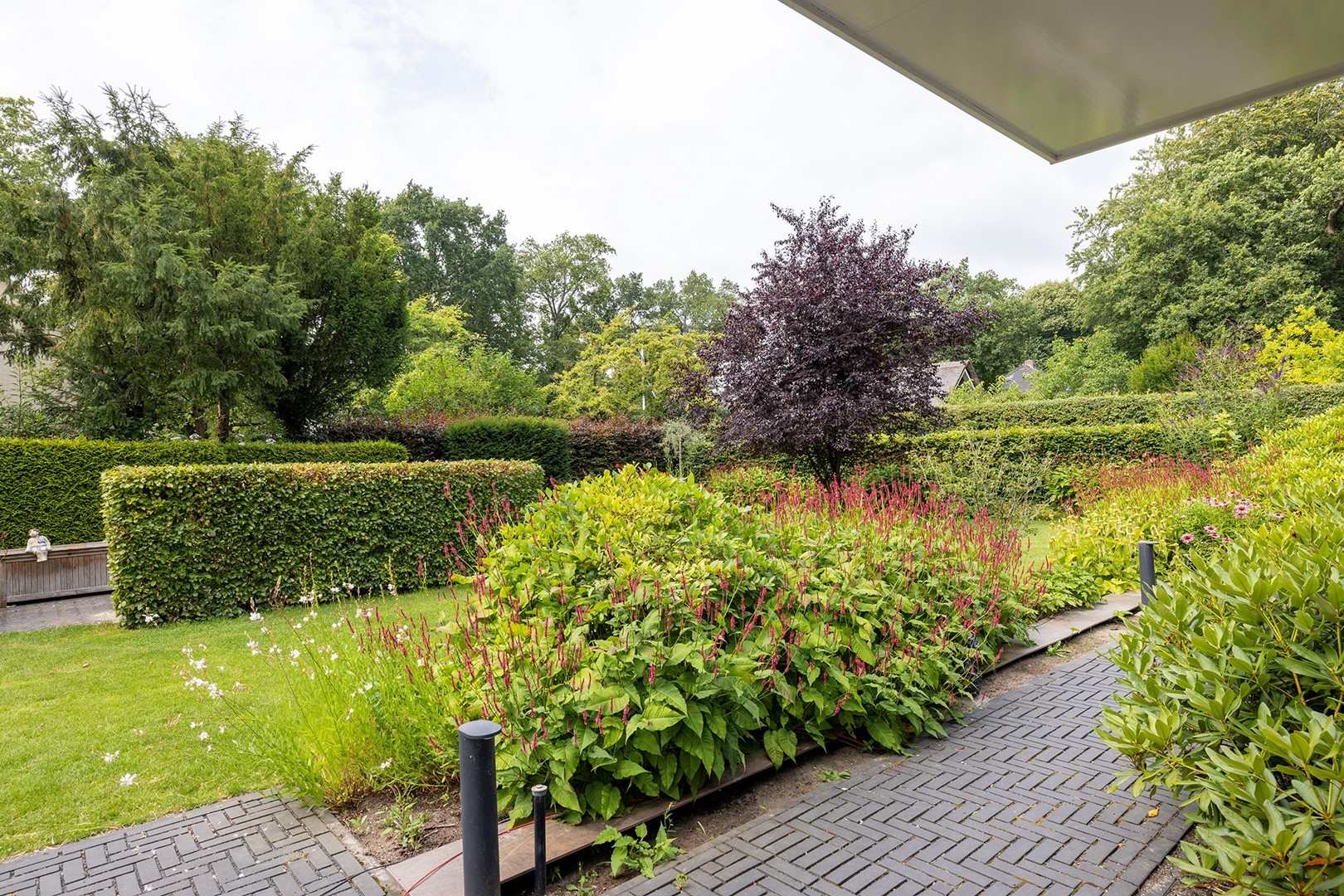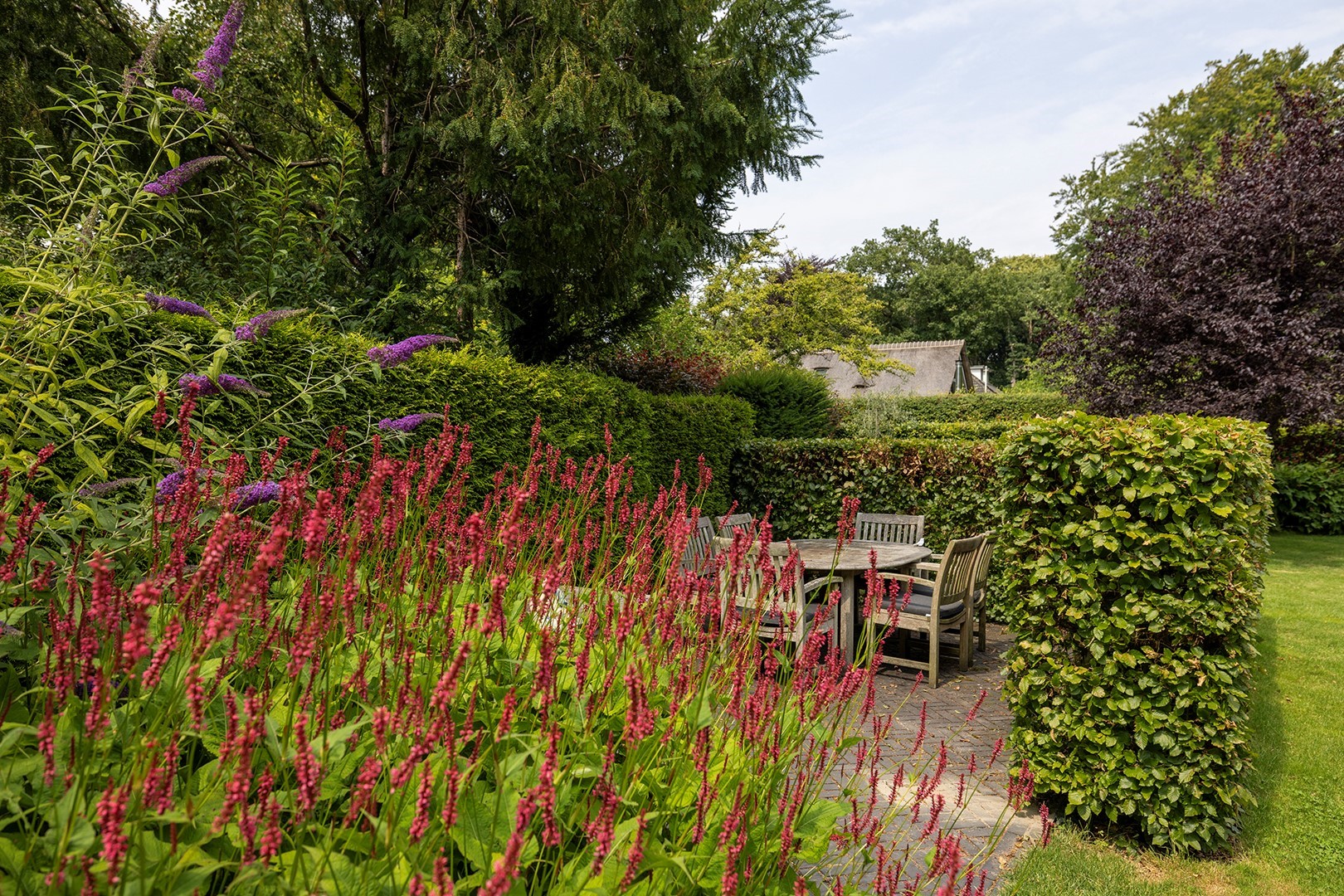 De rondom gelegen tuin is met veel zorg aangelegd en biedt volledige privacy. De beplanting is zorgvuldig gekozen, met bloeiers die elkaar door de seizoenen heen afwisselen en zo een continu spel van kleur en vorm creëren. Er zijn meerdere terrassen gecreëerd, zodat er op elk moment van de dag een plek in de zon of schaduw te vinden is.