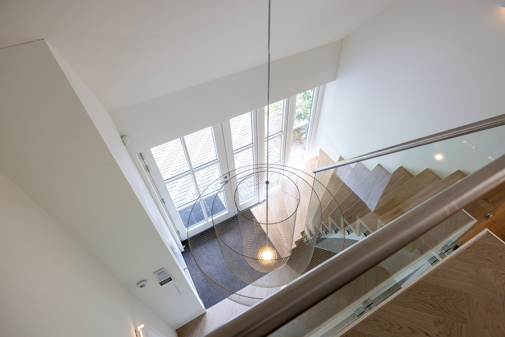The master bedroom at the rear is an oasis of calm: spacious, light and with views of greenery. Glass doors lead into a large walk-in wardrobe fitted with bespoke wardrobes and integrated lighting. Adjoining this is the exclusive en-suite bathroom, featuring a freestanding Dado Quartz bath, a bespoke Assenti washbasin unit with a black natural stone countertop, a spacious walk-in shower and a toilet — all finished in a serene, sophisticated style.