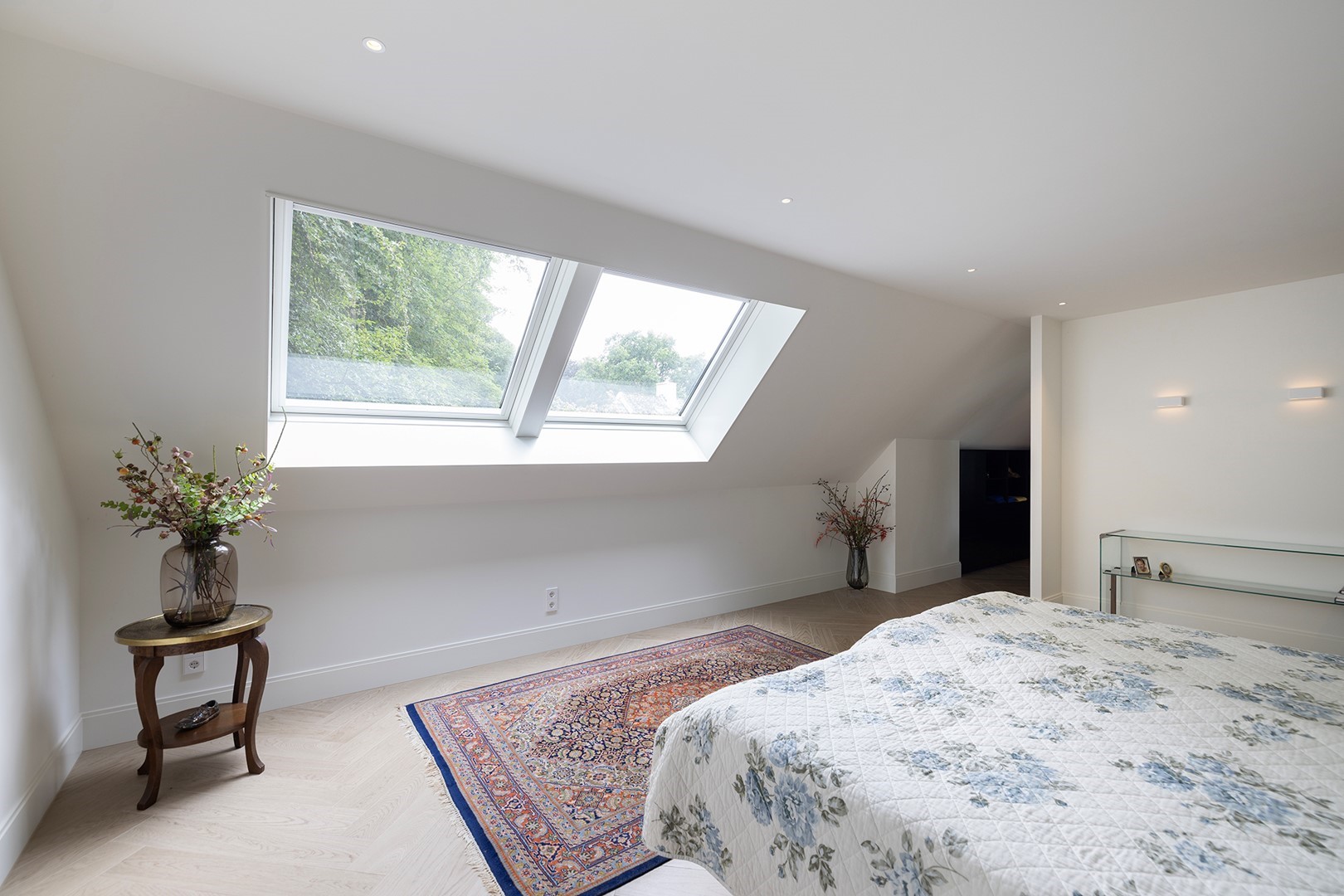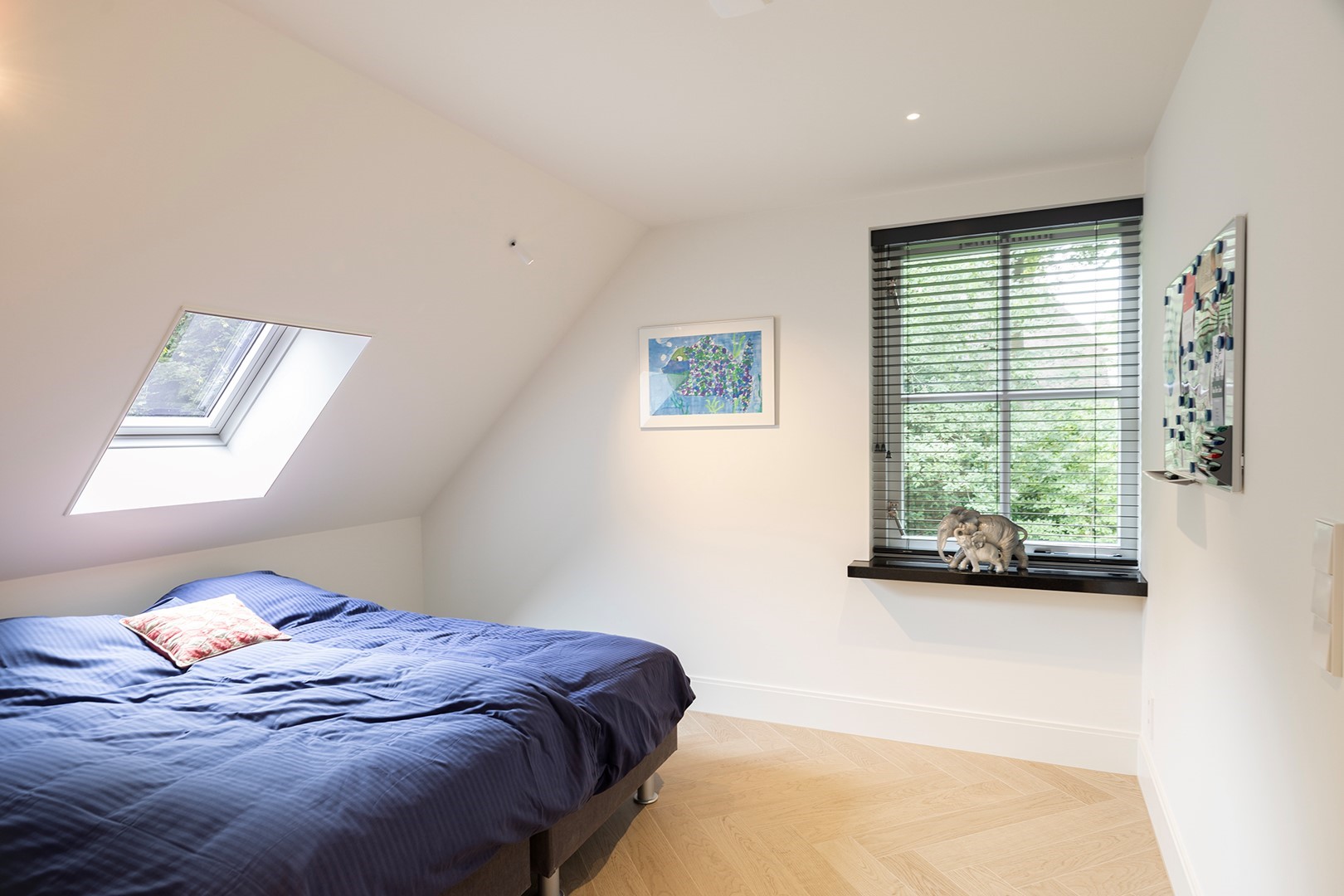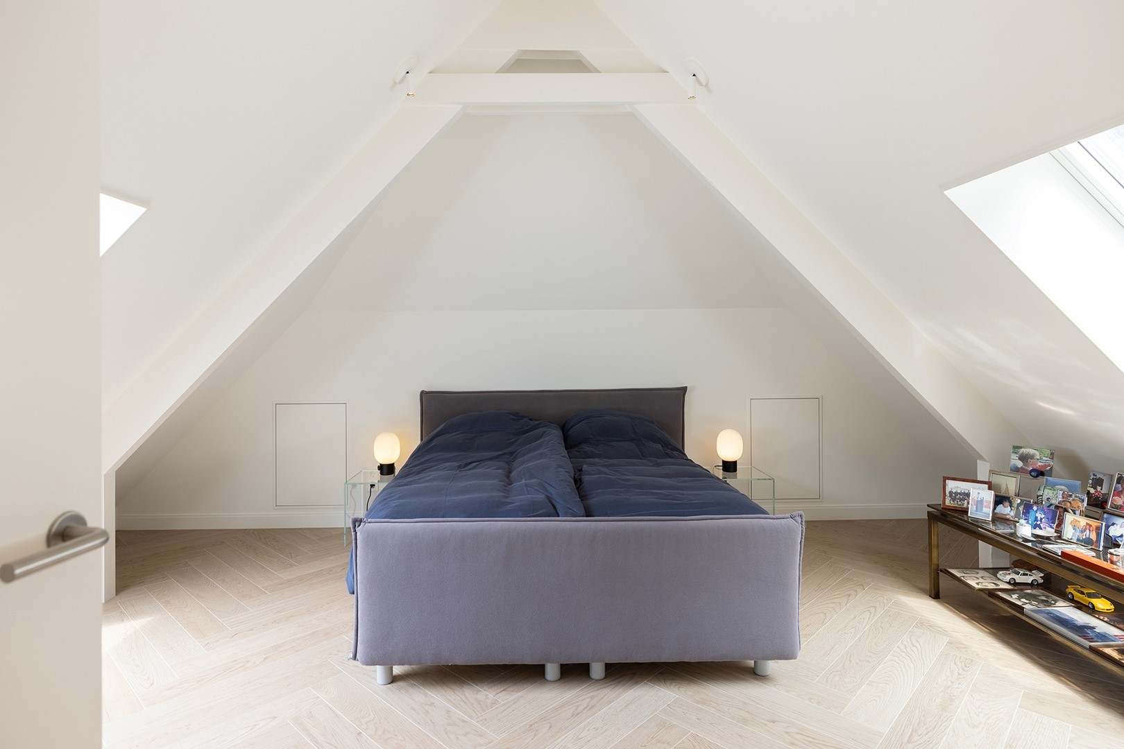 De overloop is subtiel verlicht en biedt toegang tot drie slaapkamers. De gehele verdieping is voorzien van vloerverwarming. De eerste kamer heeft twee grote dakramen en is ruim van opzet. De tweede slaapkamer is geschikt als kinderkamer of logeerkamer. De moderne badkamer op deze verdieping is voorzien van een inloopdouche, wastafelmeubel en toilet.