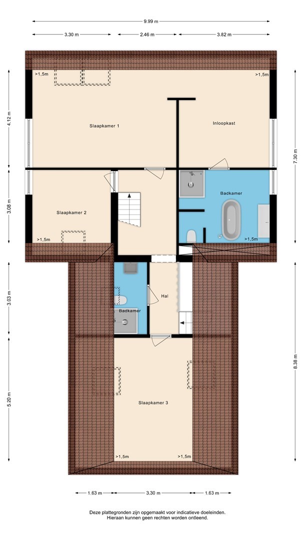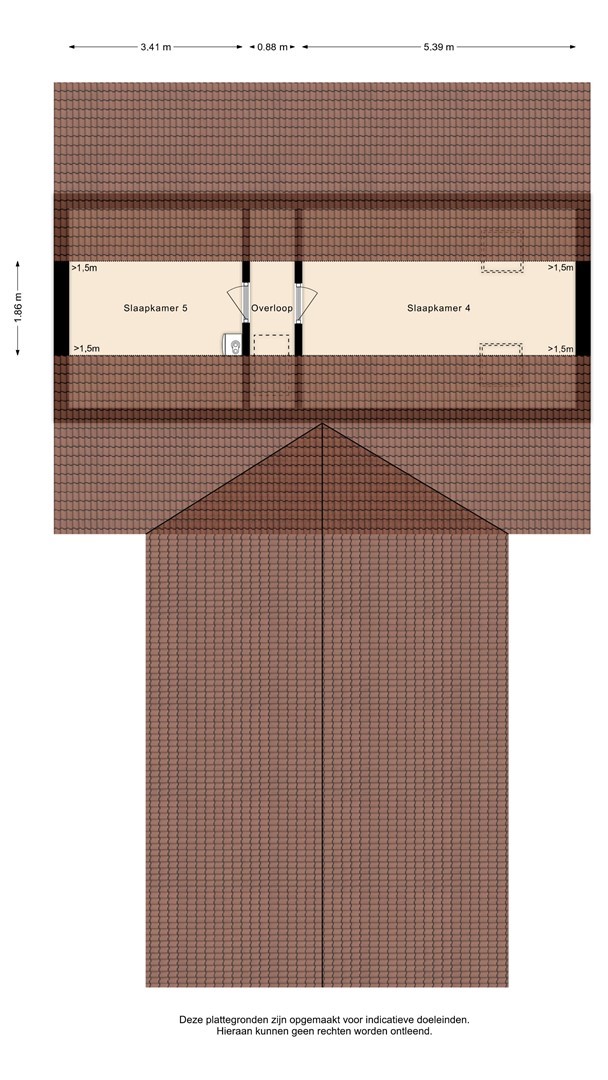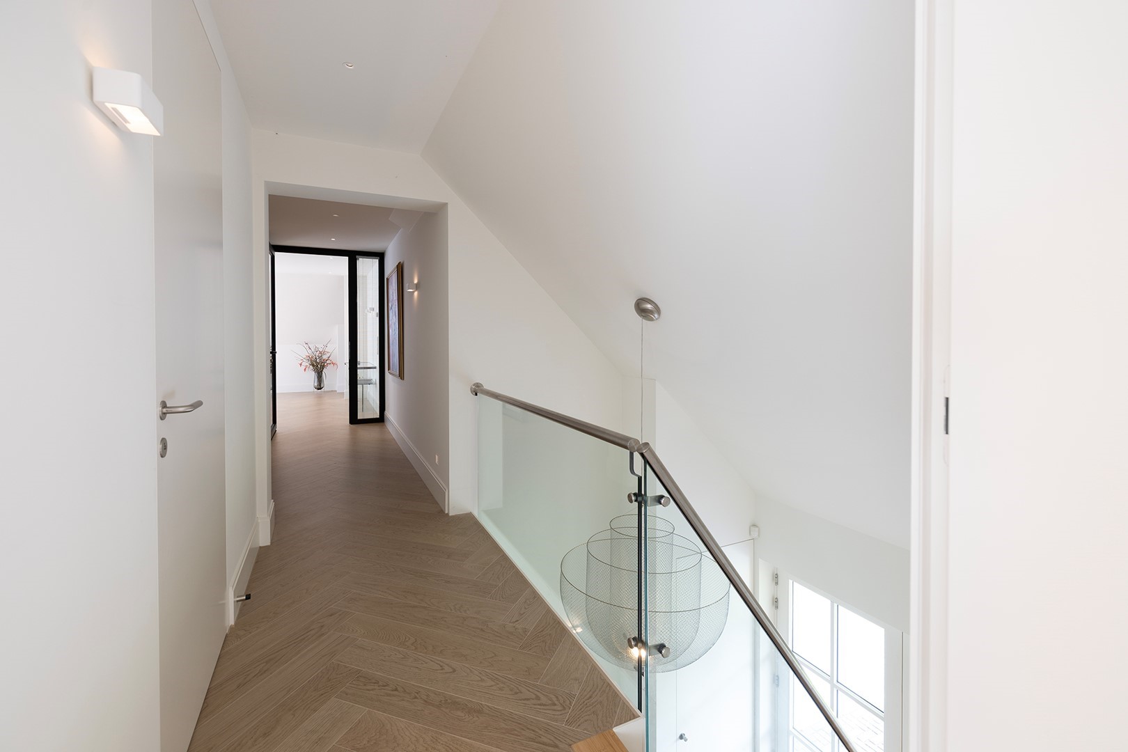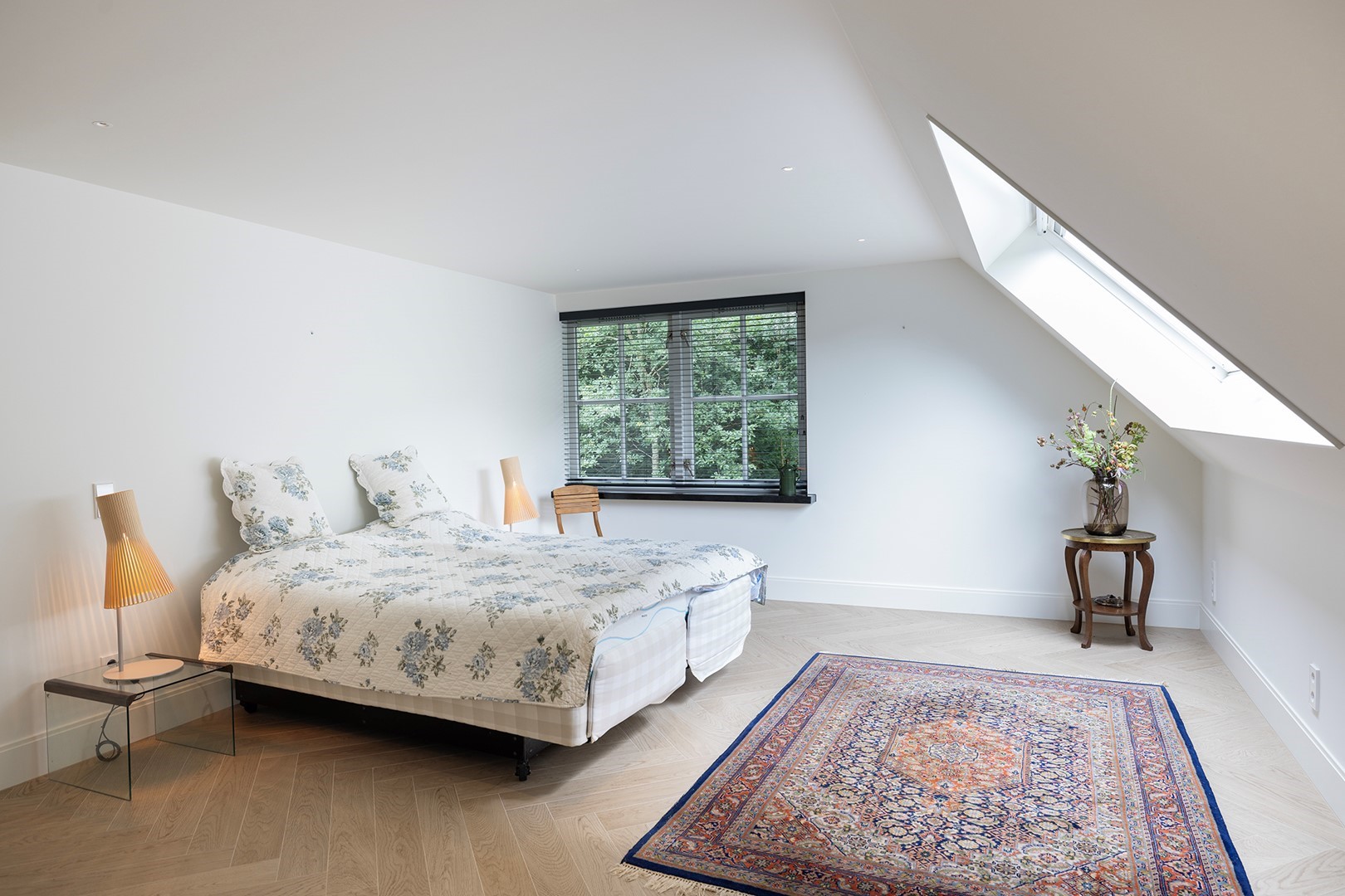De overloop is subtiel verlicht en biedt toegang tot drie slaapkamers. De gehele verdieping is voorzien van vloerverwarming. De eerste kamer heeft twee grote dakramen en is ruim van opzet. De tweede slaapkamer is geschikt als kinderkamer of logeerkamer. De moderne badkamer op deze verdieping is voorzien van een inloopdouche, wastafelmeubel en toilet.