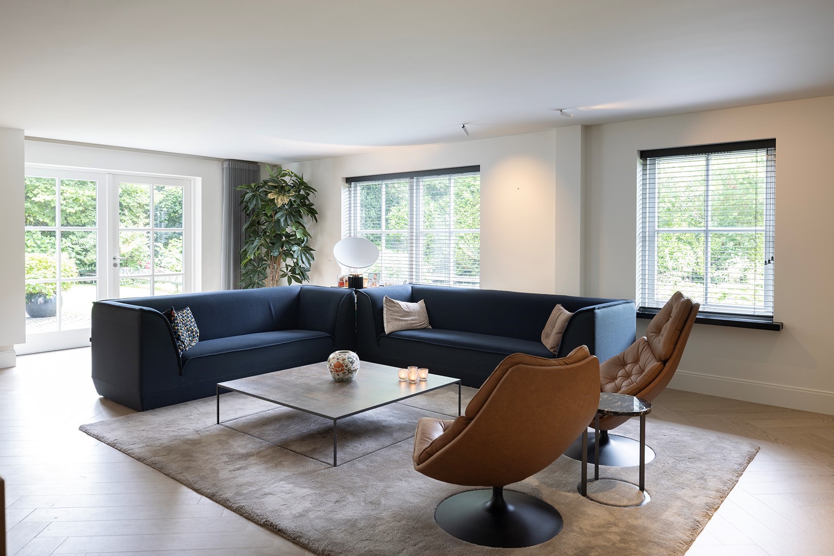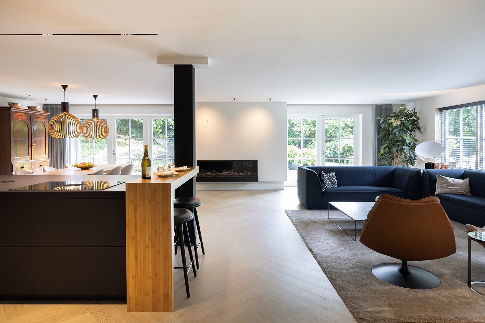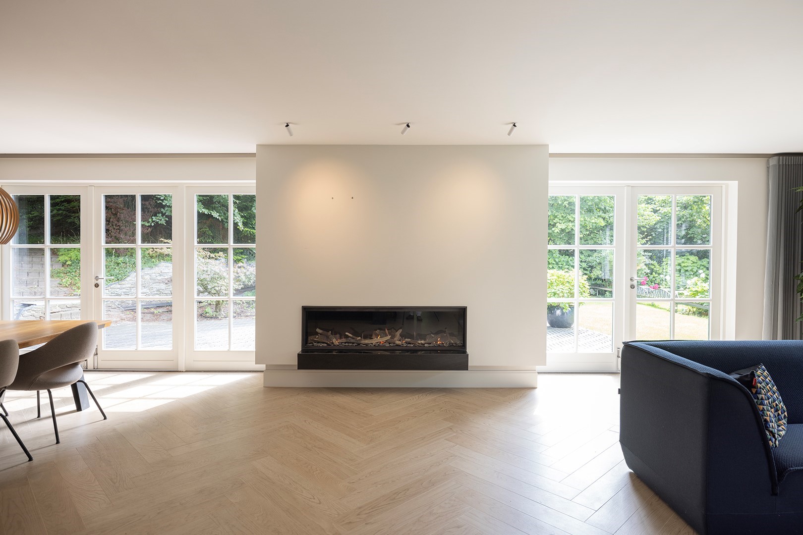 De zithoek wordt op elegante wijze gescheiden van het eetgedeelte door een moderne gashaard. Dankzij de grote raampartijen en twee dubbele openslaande deuren naar de tuin is er een sterke connectie met buiten, in alle seizoenen.