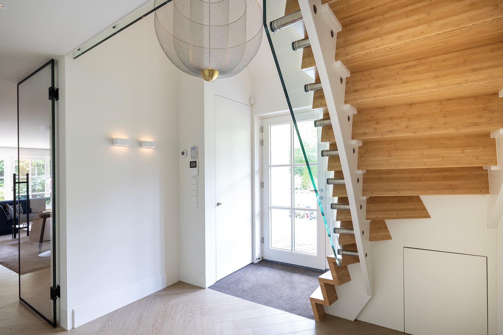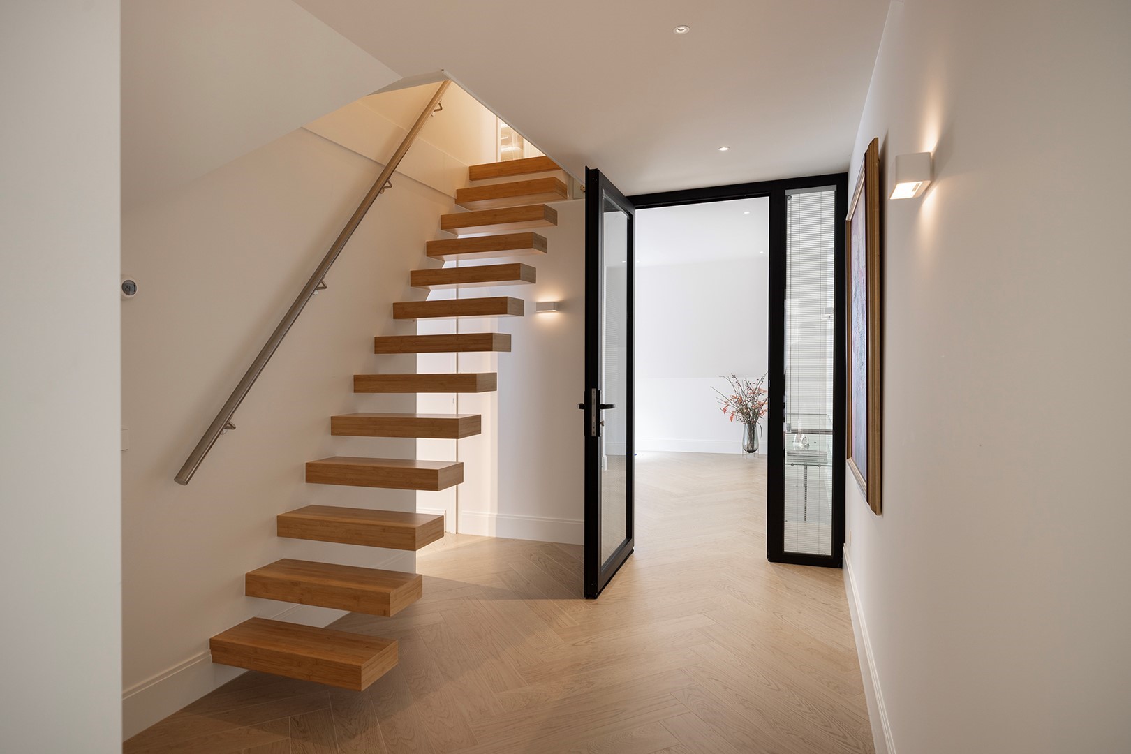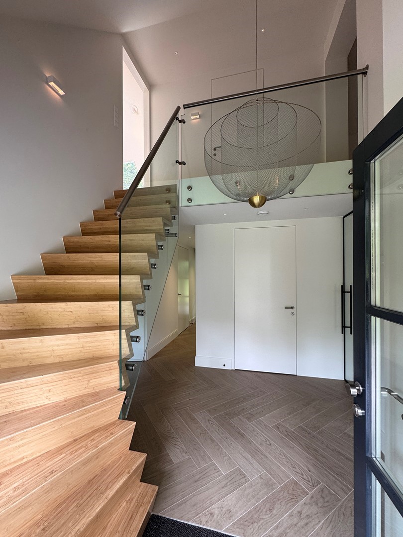 The entrance hall features a modern cloakroom, fuse box and alarm system. Through a stylish steel pivot door, you enter the living room: a spacious, light-filled area with a high-quality ceramic herringbone floor complete with underfloor heating.