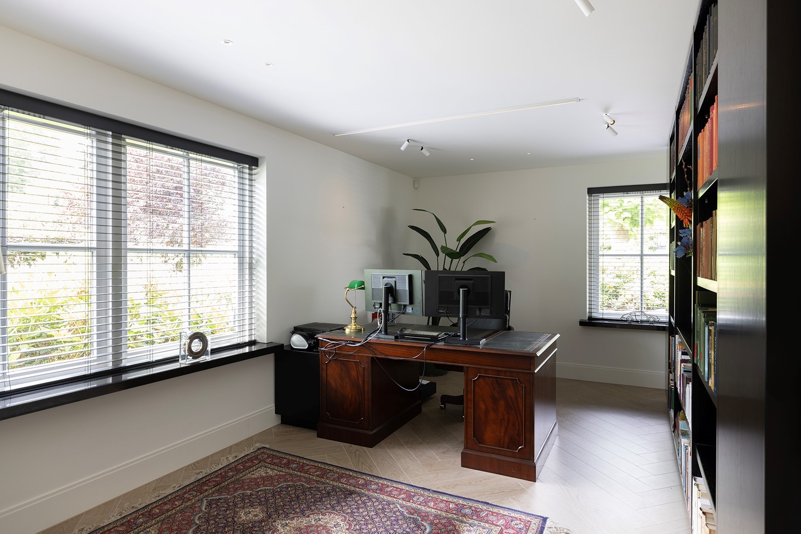 On the other side of the hallway is a multifunctional room, currently used as an office, but also perfectly suited as a playroom, practice space or additional bedroom. A second entrance at the rear leads to a cloakroom area with bespoke fitted wardrobes.