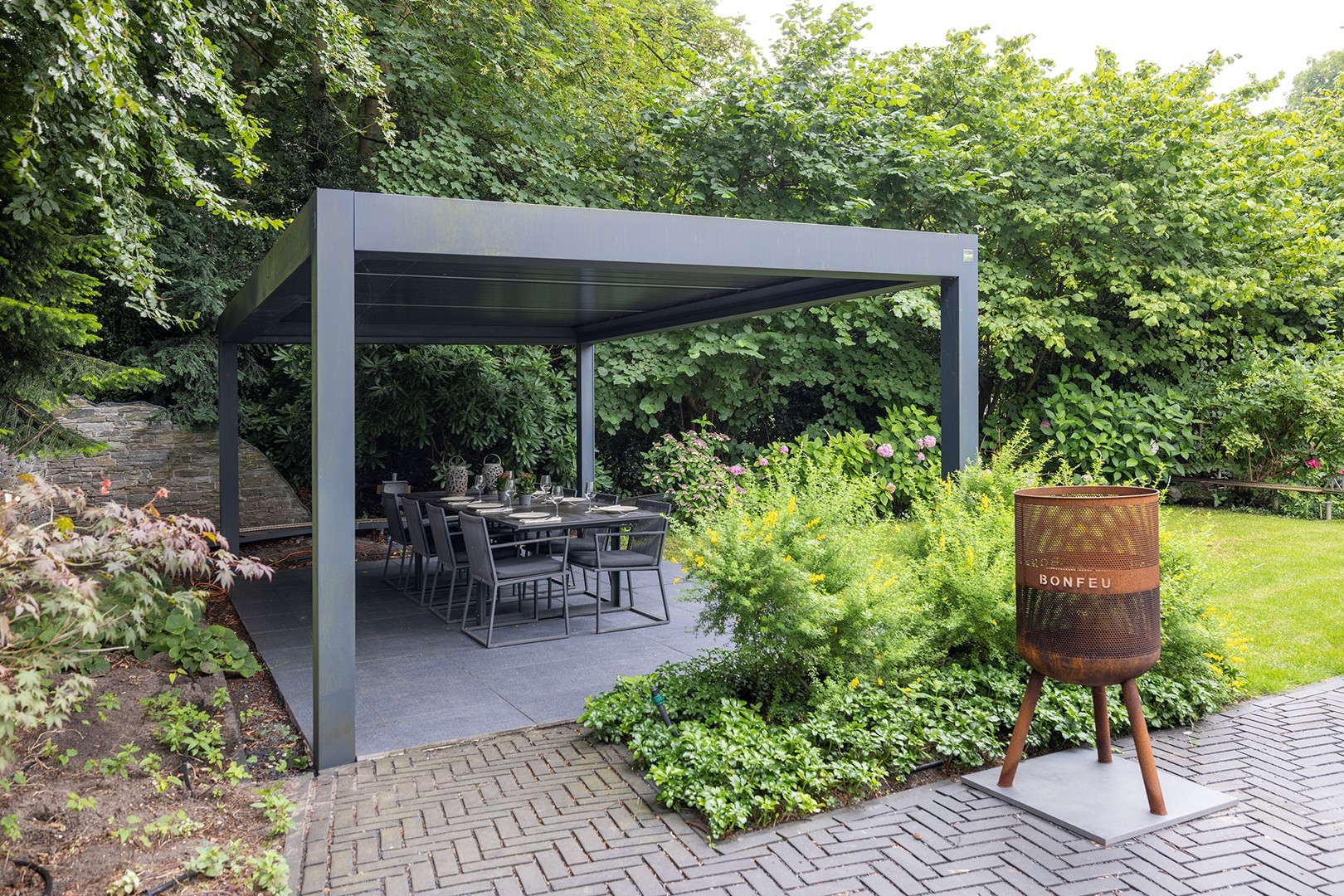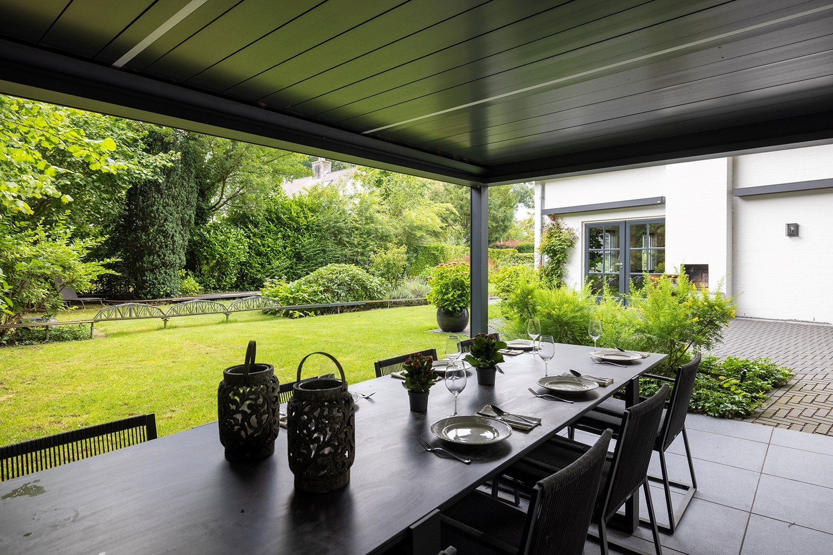 One of the terraces features a stylish, multifunctional aluminium canopy with integrated lighting, making it ideal for long summer evenings or sheltered winter days outdoors. The garden is surrounded by mature trees.