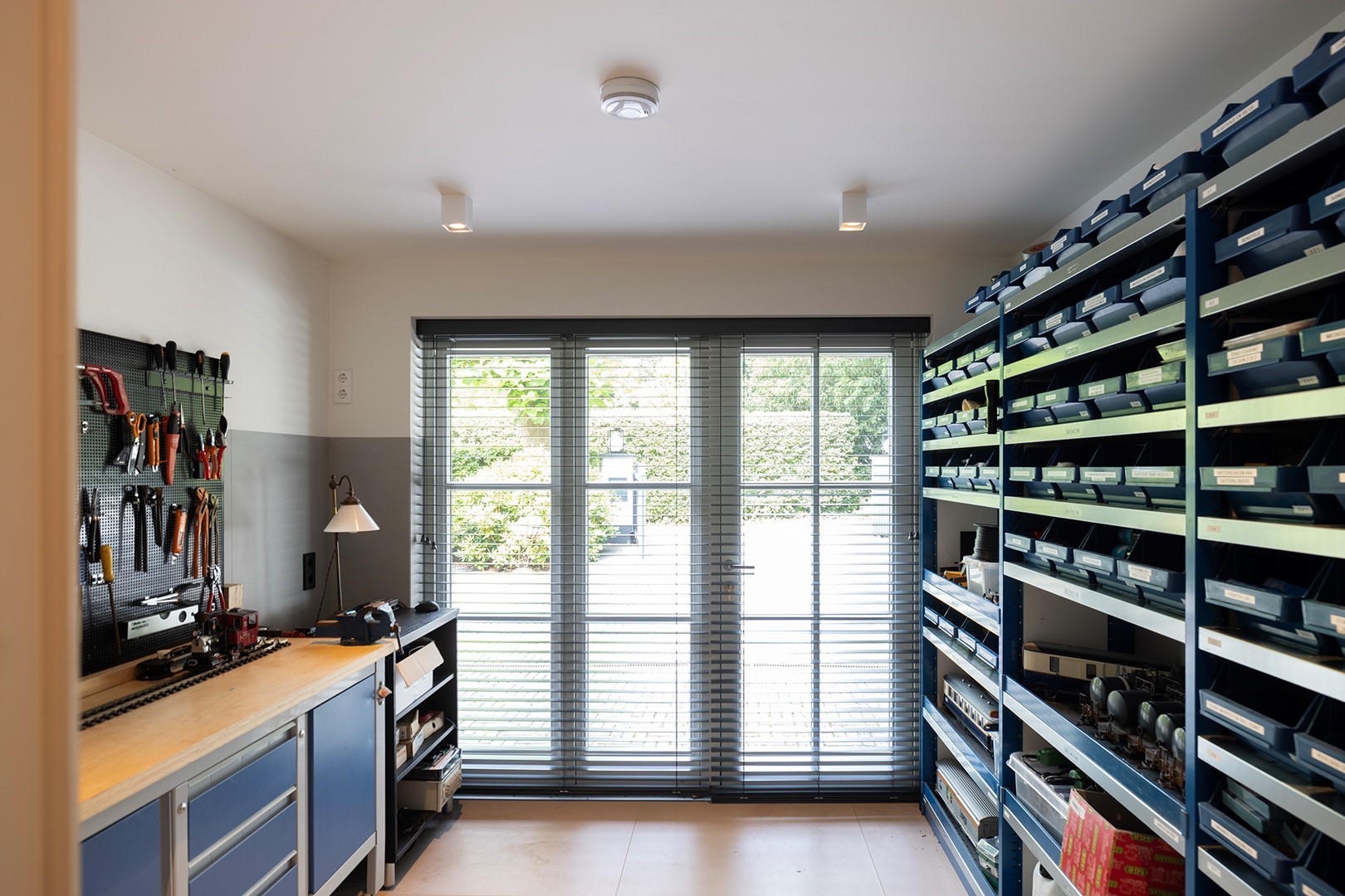 Grenzend aan de andere kant van de hal bevindt zich een multifunctionele kamer, momenteel in gebruik als kantoor, maar ook uitstekend geschikt als speelkamer, praktijkruimte of extra slaapkamer. Via een tweede entree aan de achterzijde is een garderobe bereikbaar, verwerkt met een op maat gemaakte kastenwand.
