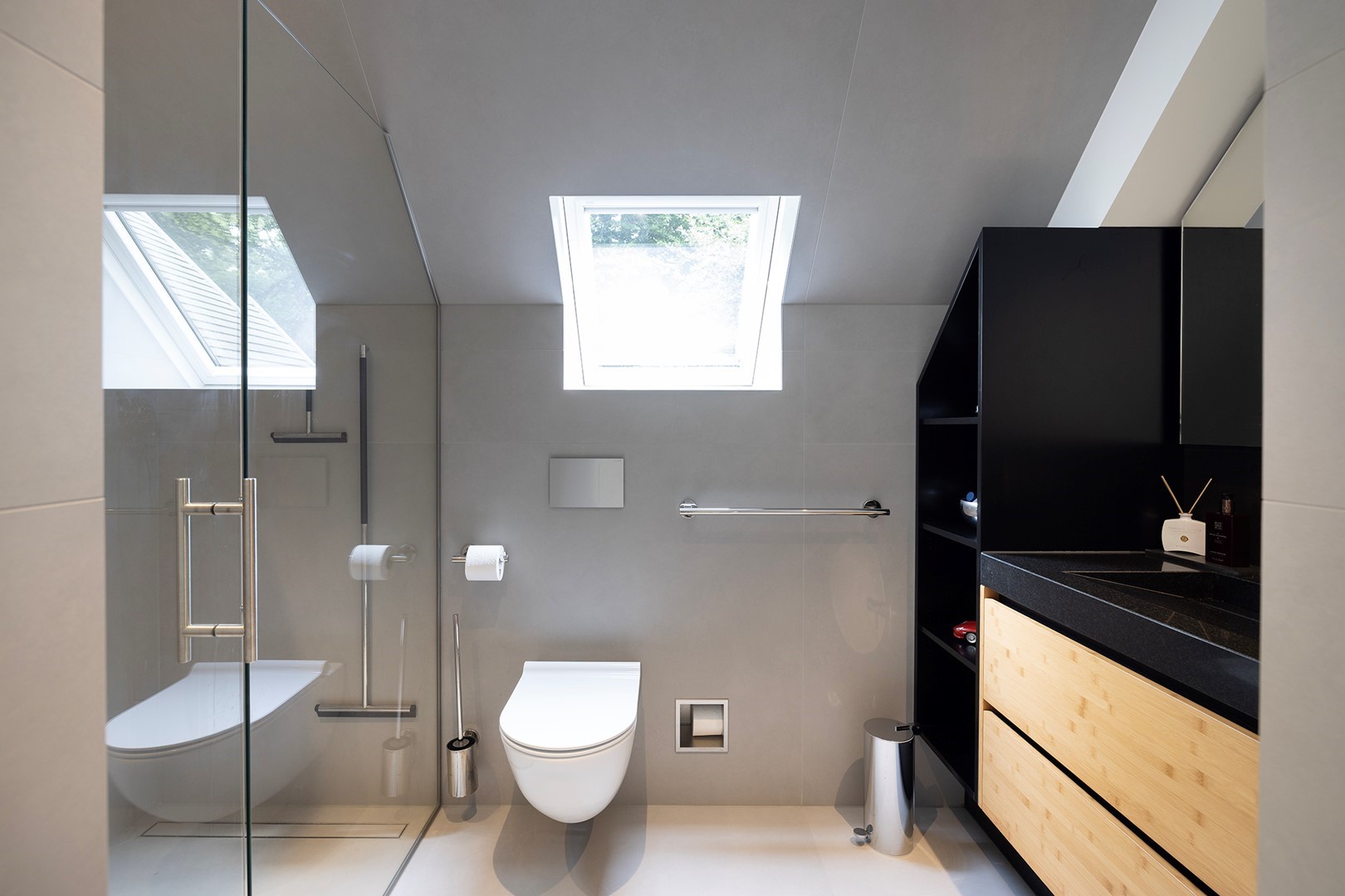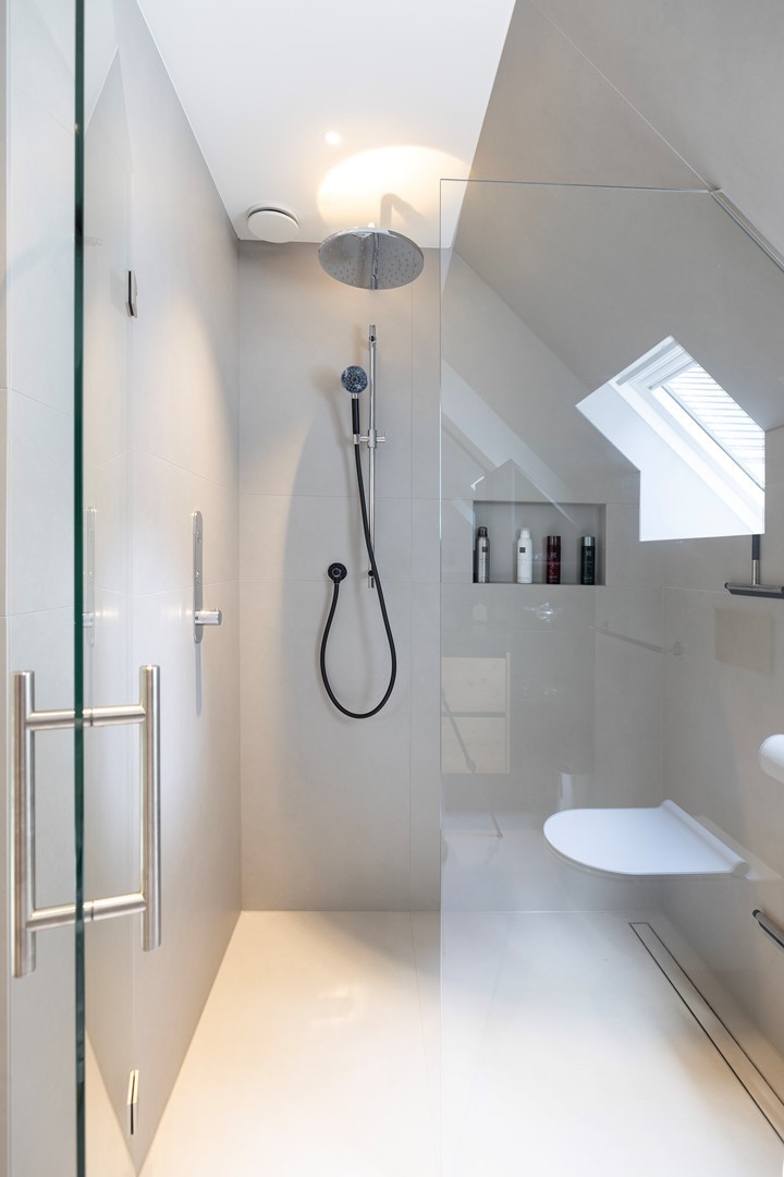 The subtly lit landing provides access to three bedrooms. The entire floor benefits from underfloor heating. The first bedroom is generously proportioned with two large skylights. The second is ideal as a child’s bedroom or guest room. The modern bathroom on this floor features a walk-in shower, washbasin unit and toilet.