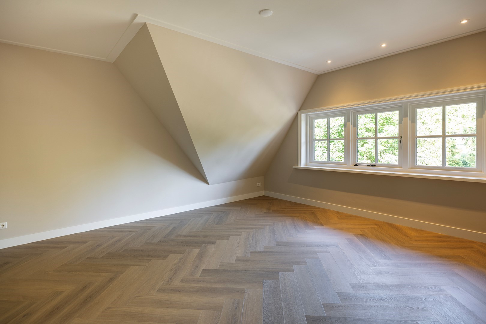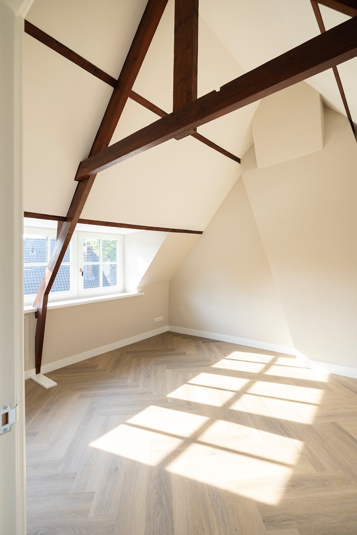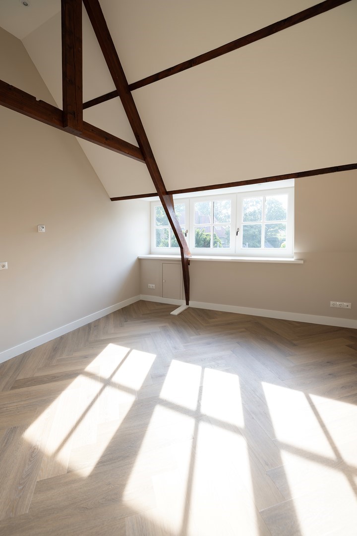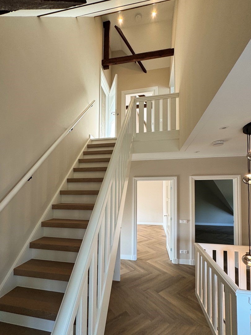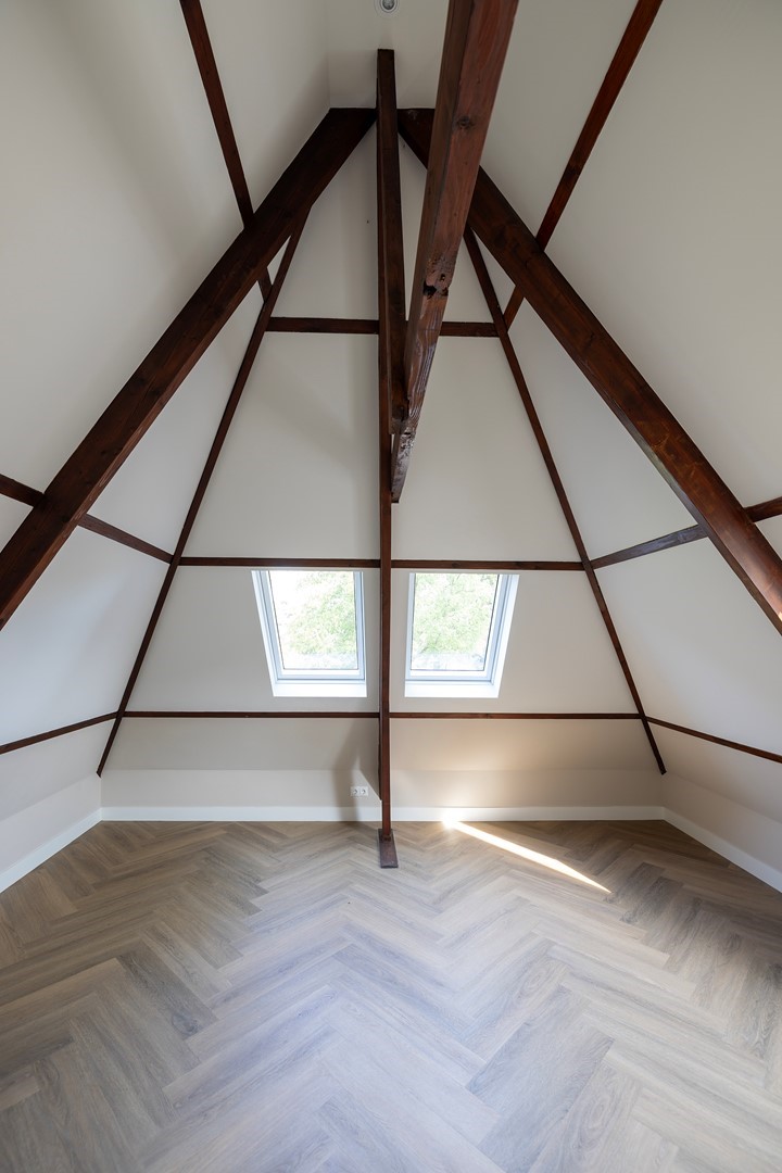 Er is een vaste trap gerealiseerd naar de ruime zolder. Er zijn twee slaapkamers en hier vinden we tevens de tweede badkamer. Ook dit betreft een luxe badkamer met inloopdouche, toilet, wastafel en vloer-/ en spiegelverwarming.