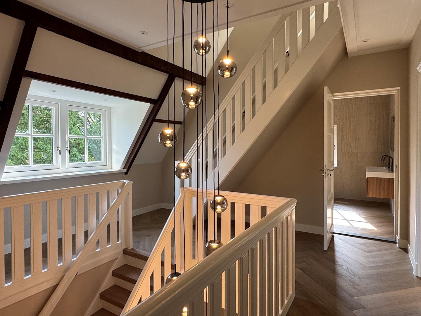 Via de elegante vaste trap lopen we naar de ruime overloop op de verdieping. Hier vinden we twee ruime slaapkamers waarvan 1 met balkon aan de tuinzijde. Een grote luxe badkamer met dubbele inloopdouche, dubbele wastafel, douchtoilet, vloer-/ en spiegelverwarming. En aan de voorzijde de was-/technische ruimte, ook met balkon en de installaties zoals de warmtepomp, boiler en waterontharder.