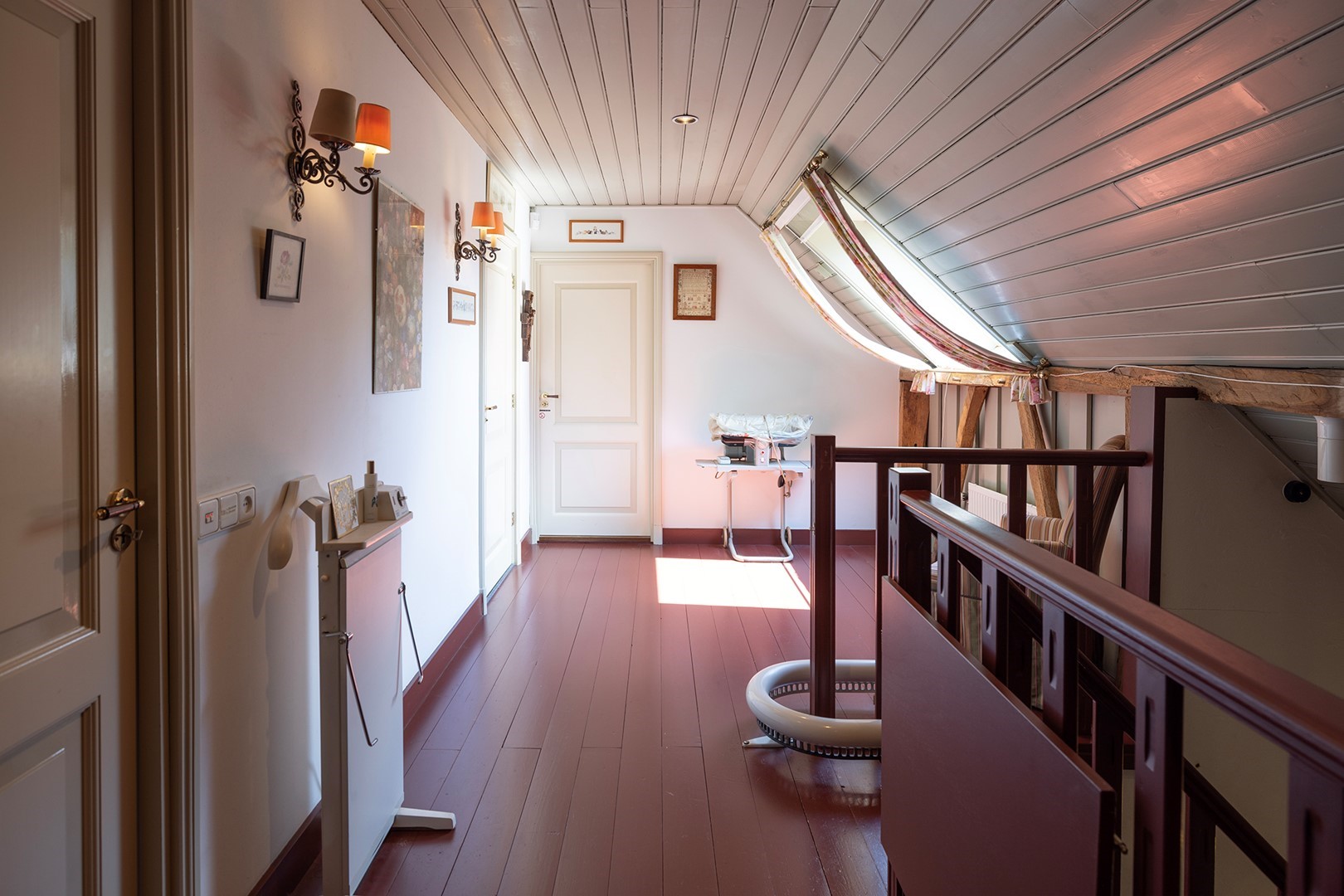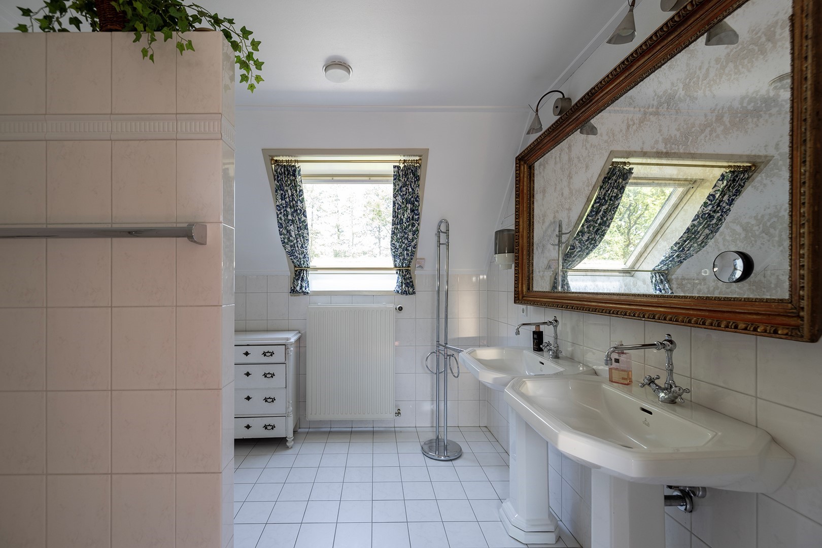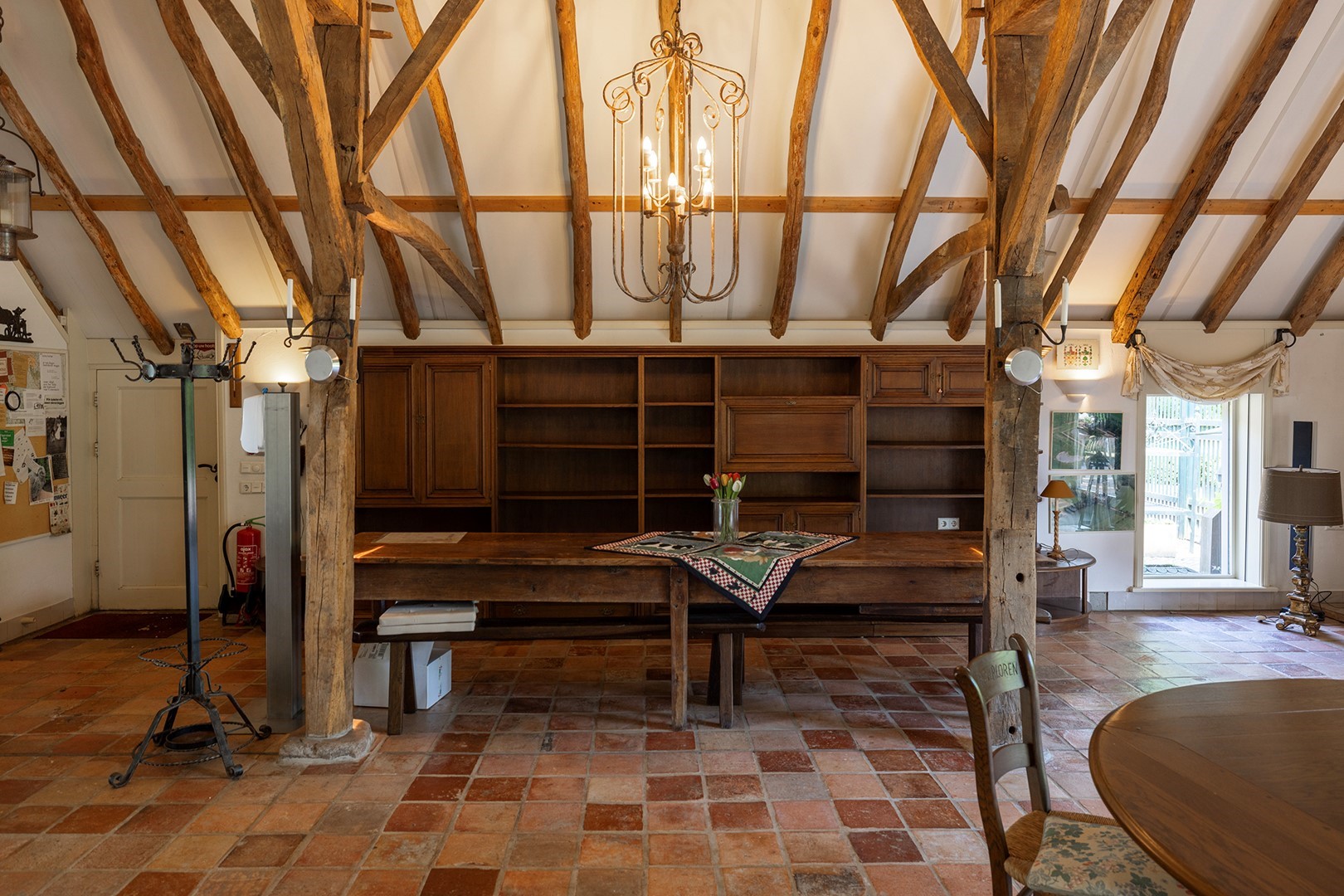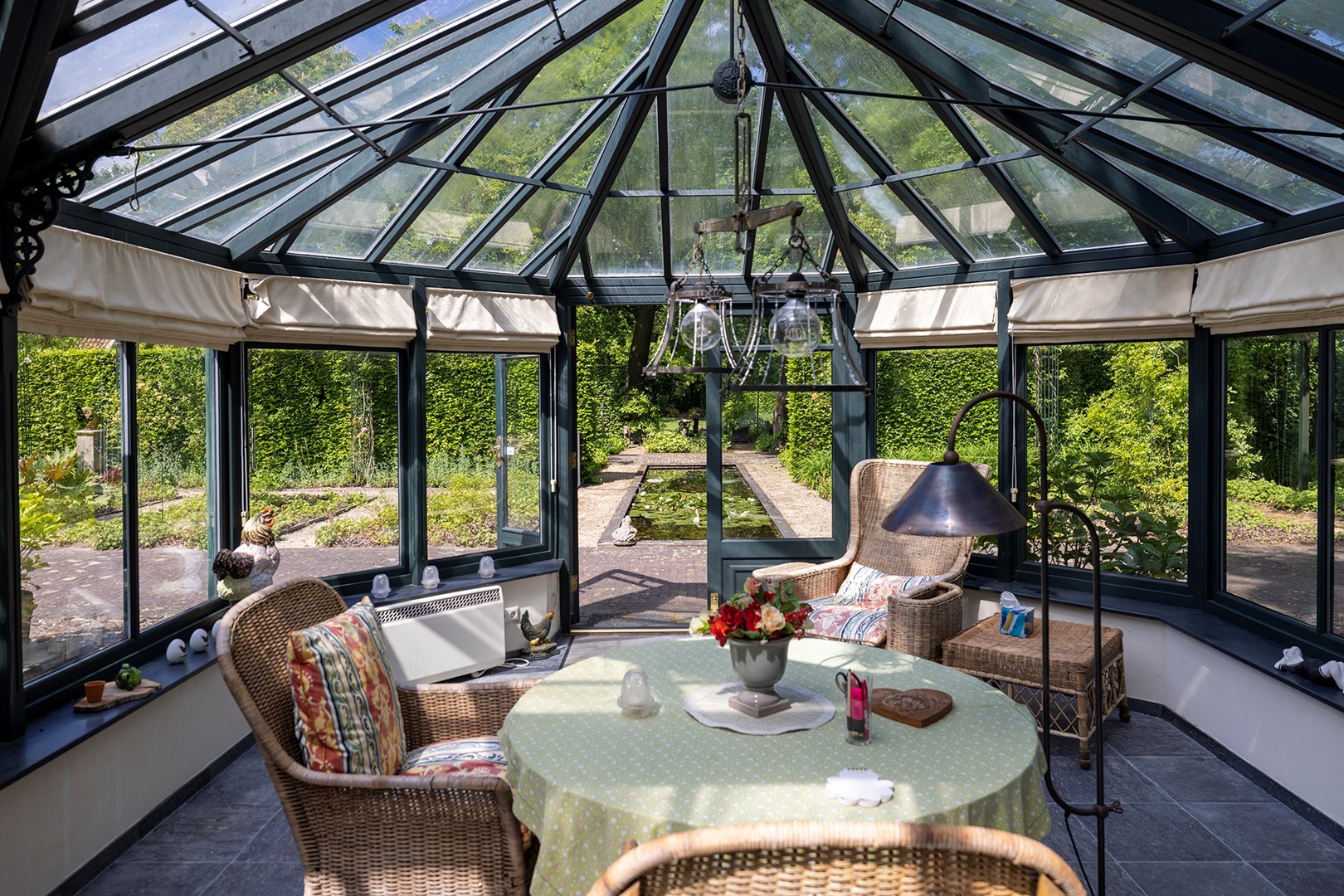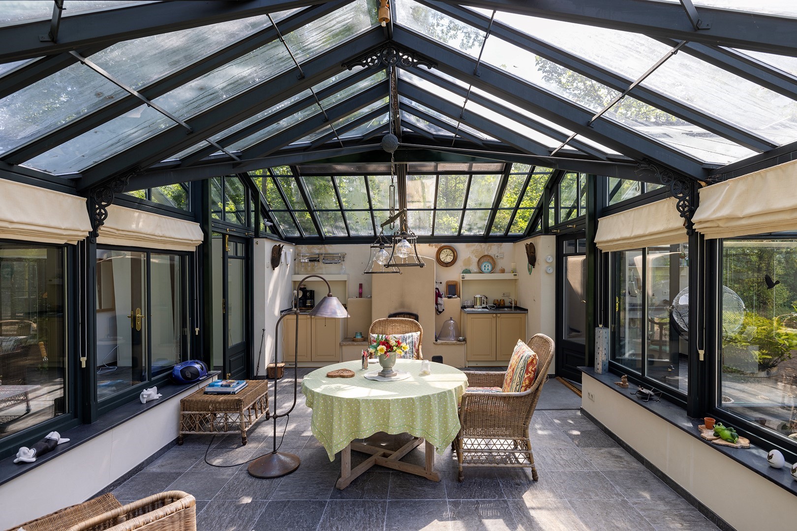 De monumentale woonboerderij stamt al uit 1904 maar is in 1991 volledig gerenoveerd. Bij het ontwerp van Maas Architecten gold de natuur als uitgangspunt. Gevolgd door licht, luxe en authenticiteit. De landelijke keuken – met sfeervolle details en luxe apparatuur – bevindt zich aan de voorzijde van het huis. De living met schouw en originele gebinten kijkt uit over het landgoed. De strakke, eigentijdse serre is een stijlvol extra. U waant zich er, dankzij het instelbare binnenklimaat, het hele jaar door buiten.