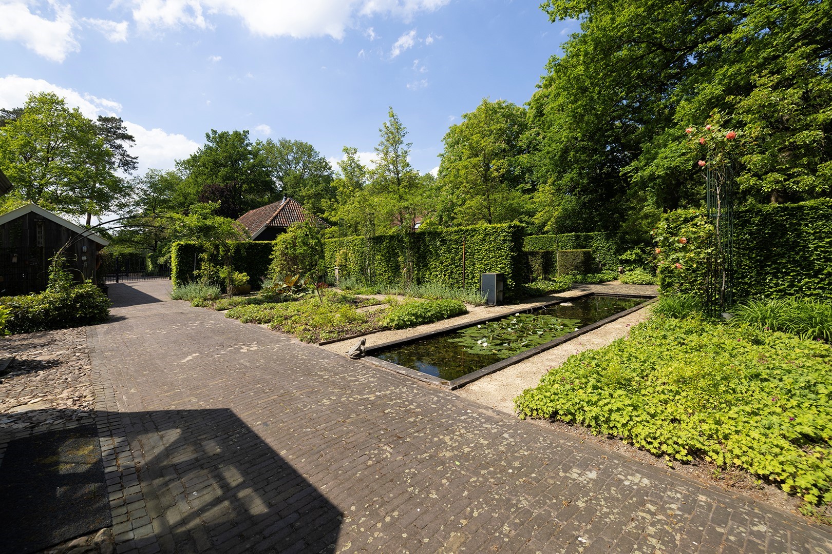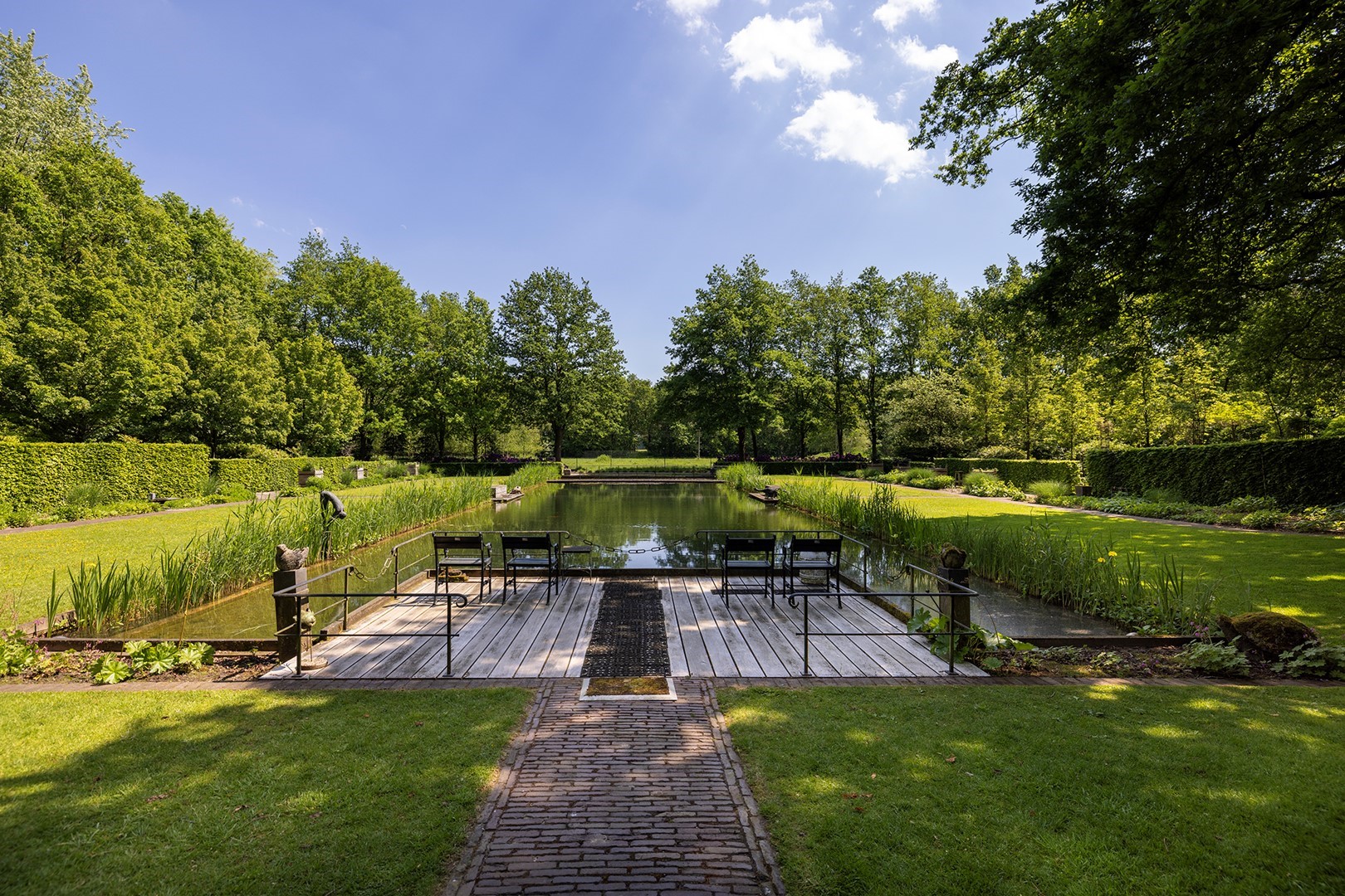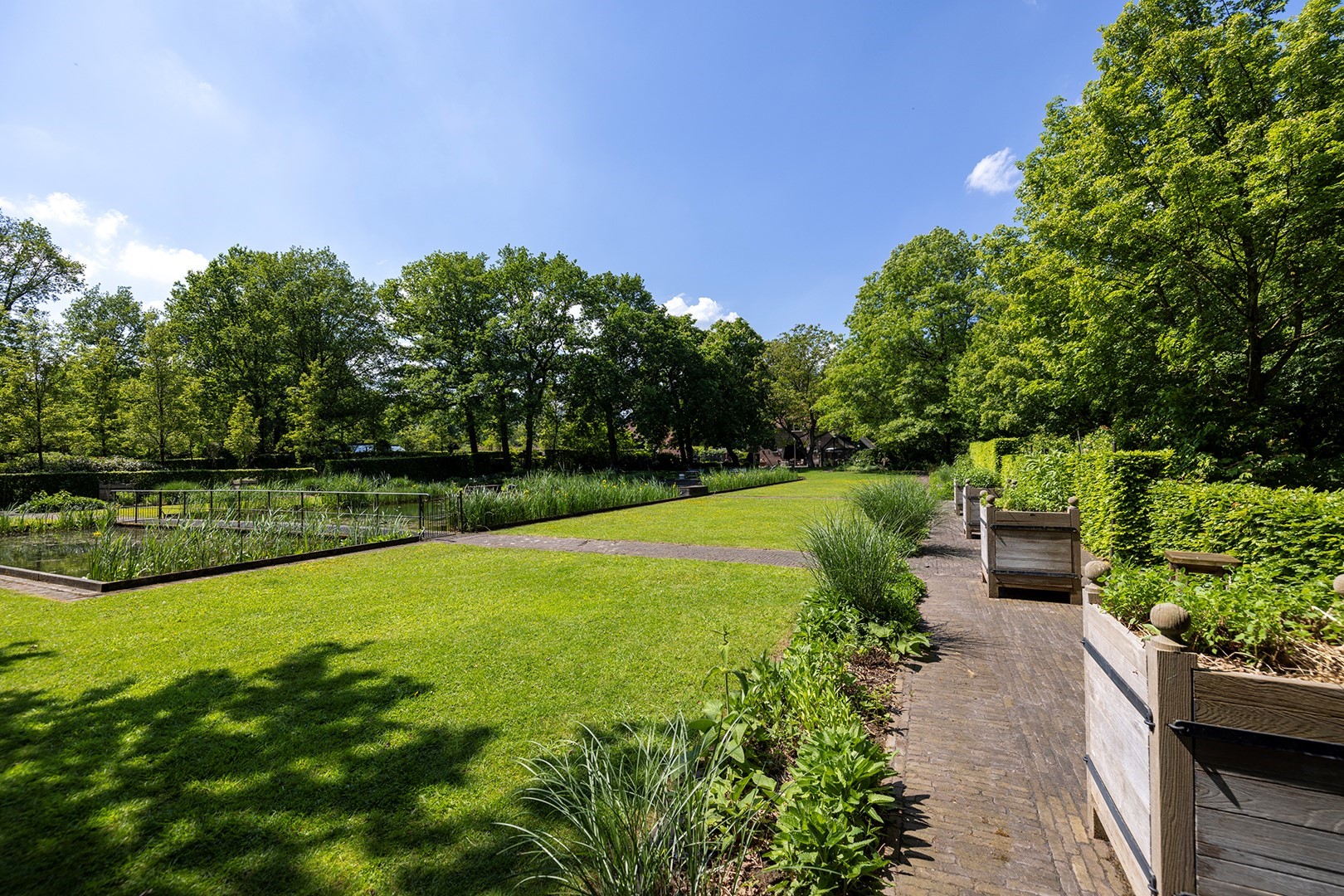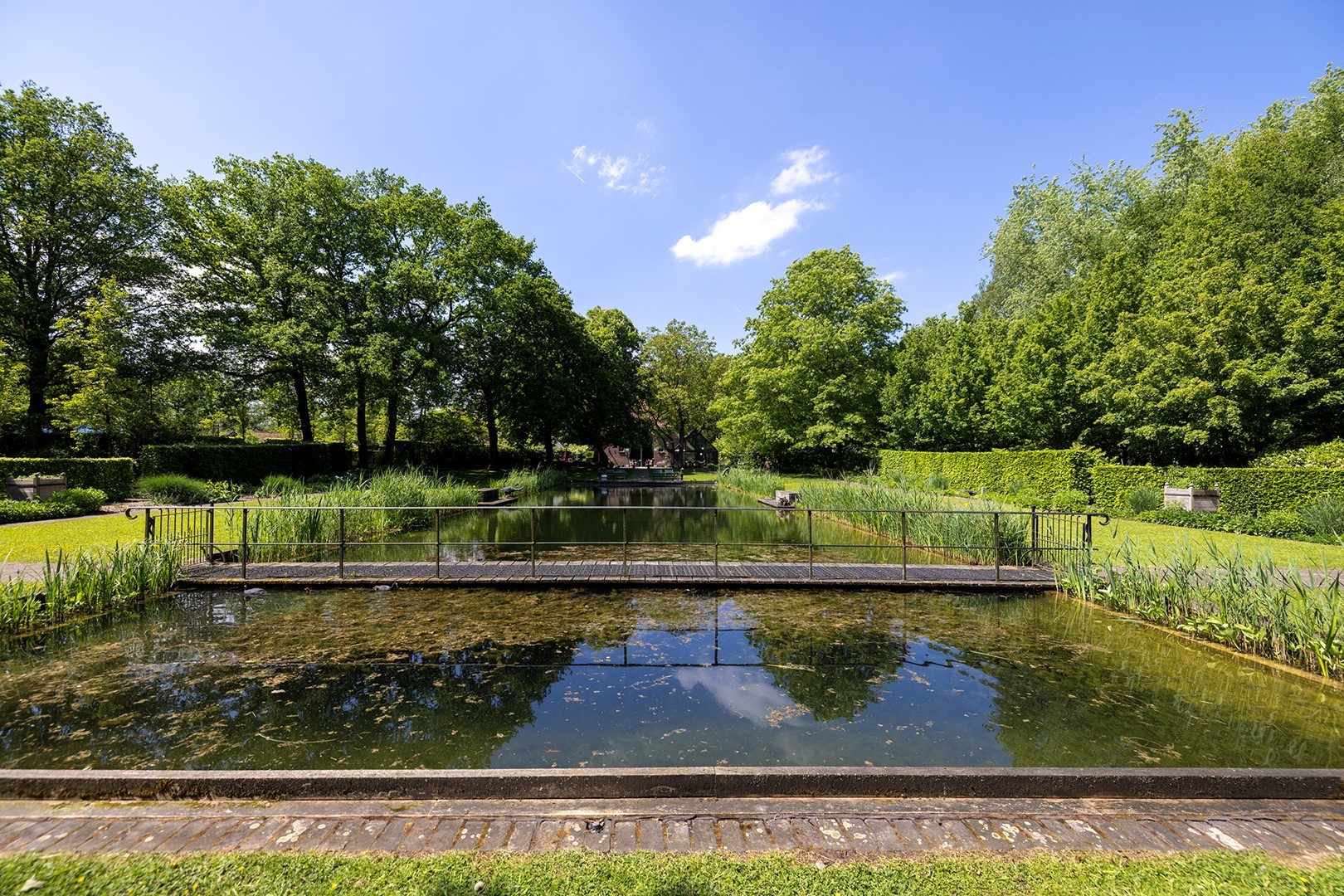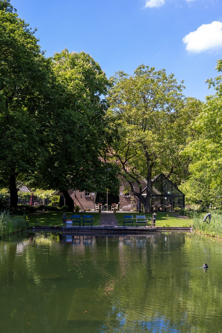 Met een gastvrij voorplein, uitbundige bloeiers en ruime parkeergelegenheid aan de voorzijde valt de ruim 100 jaar oude woonboerderij direct op. Toch kunt u vanaf die plek de grootsheid van dit 5 hectare tellende landgoed nog niet vermoeden. Aan de achterzijde reiken haast eindeloze zichtlijnen – over de langgerekte vijver heen – tussen schapen en eeuwenoude bomen door. Van al dat moois is één hectare omheind als tuin. Daarachter treft u uitgestrekte weilanden, bospercelen, vijverpartijen omrand met knotwilgen en ruisende platanen. Mens en dier leven er in harmonie samen dankzij het uitgebalanceerde landschap ontwerp van Arend Jan van der Horst.