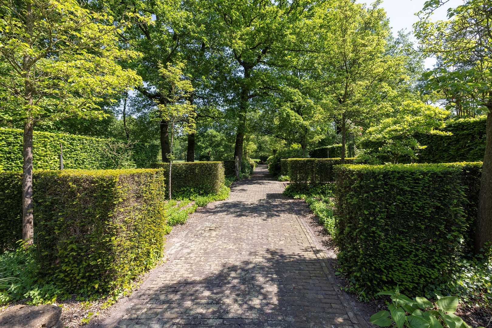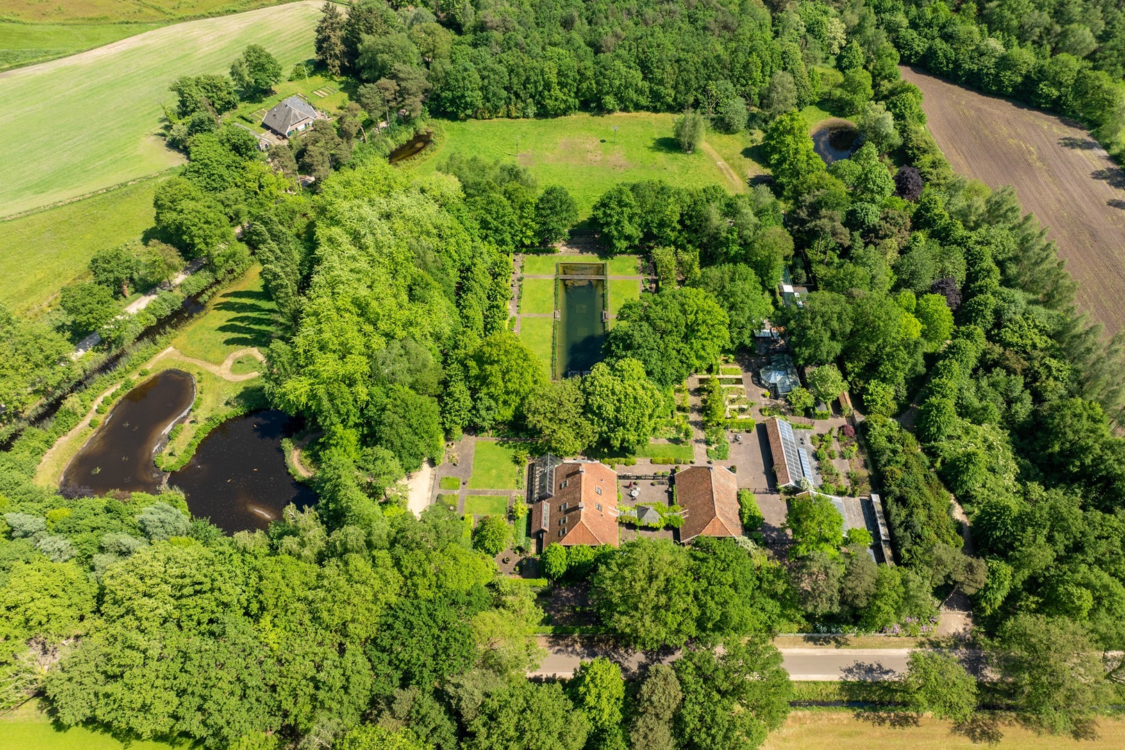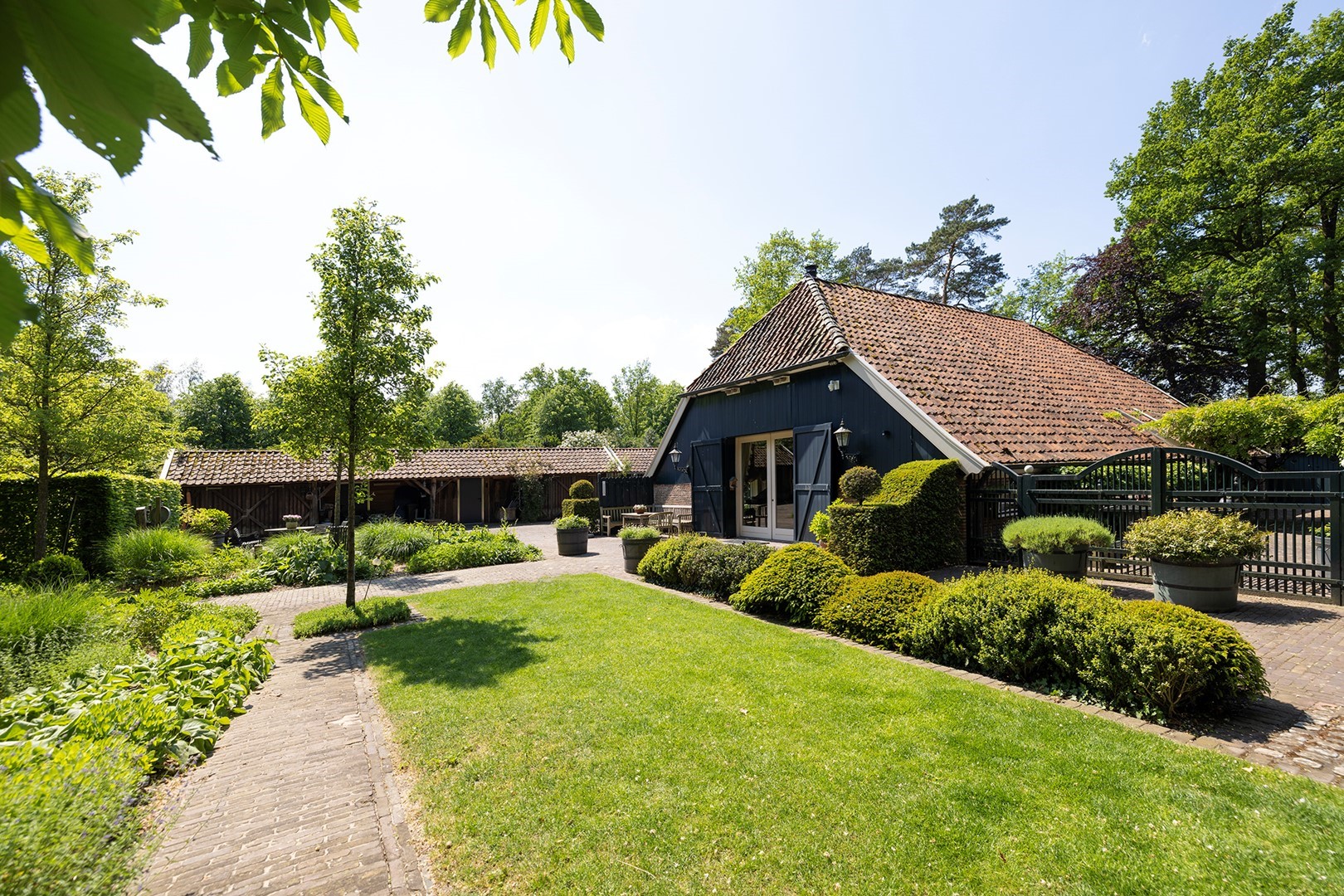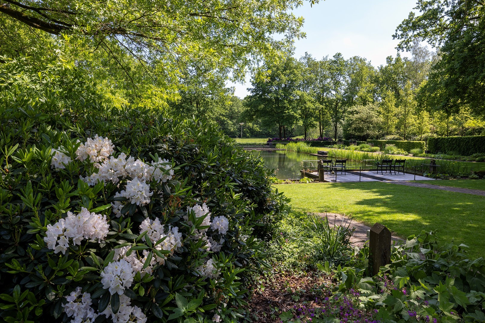 Met een gastvrij voorplein, uitbundige bloeiers en ruime parkeergelegenheid aan de voorzijde valt de ruim 100 jaar oude woonboerderij direct op. Toch kunt u vanaf die plek de grootsheid van dit 5 hectare tellende landgoed nog niet vermoeden. Aan de achterzijde reiken haast eindeloze zichtlijnen – over de langgerekte vijver heen – tussen schapen en eeuwenoude bomen door. Van al dat moois is één hectare omheind als tuin. Daarachter treft u uitgestrekte weilanden, bospercelen, vijverpartijen omrand met knotwilgen en ruisende platanen. Mens en dier leven er in harmonie samen dankzij het uitgebalanceerde landschap ontwerp van Arend Jan van der Horst.