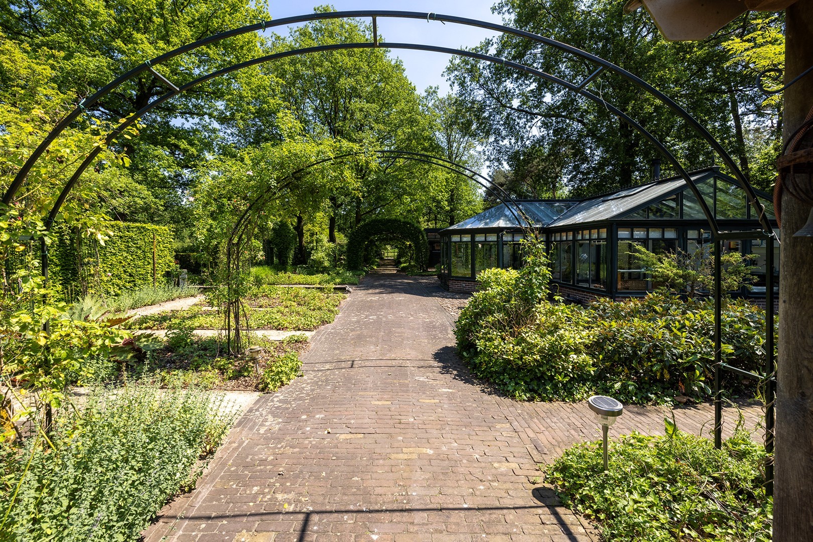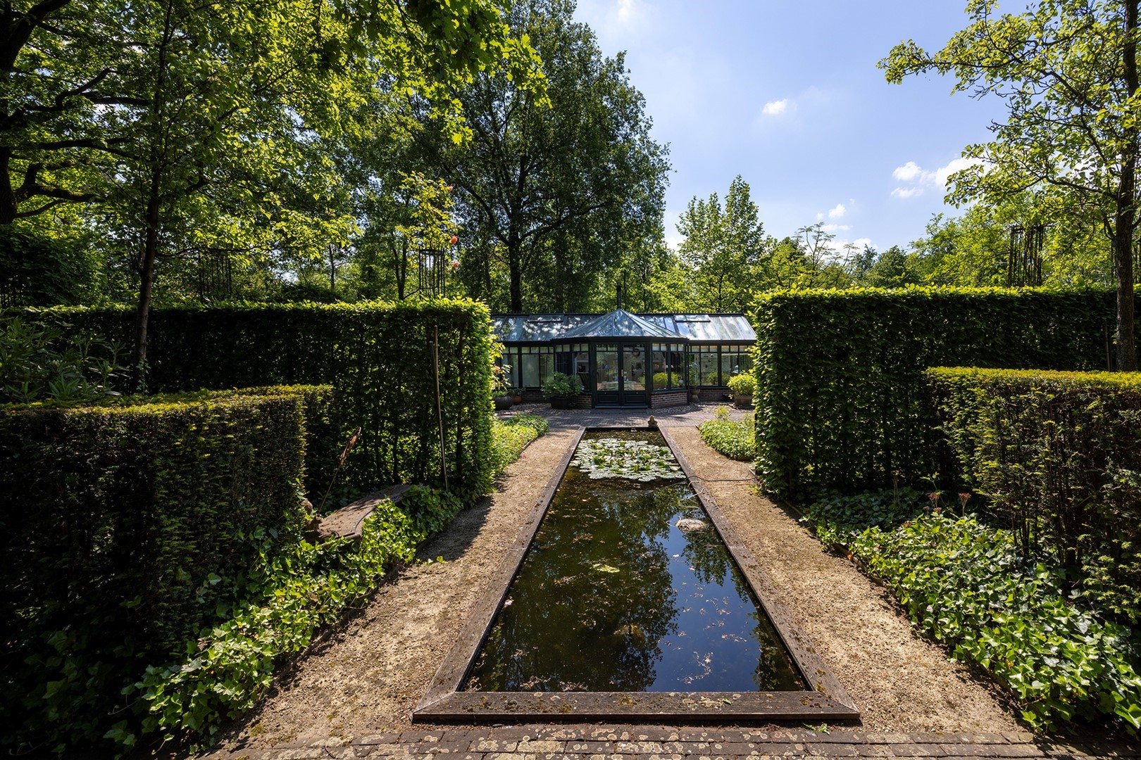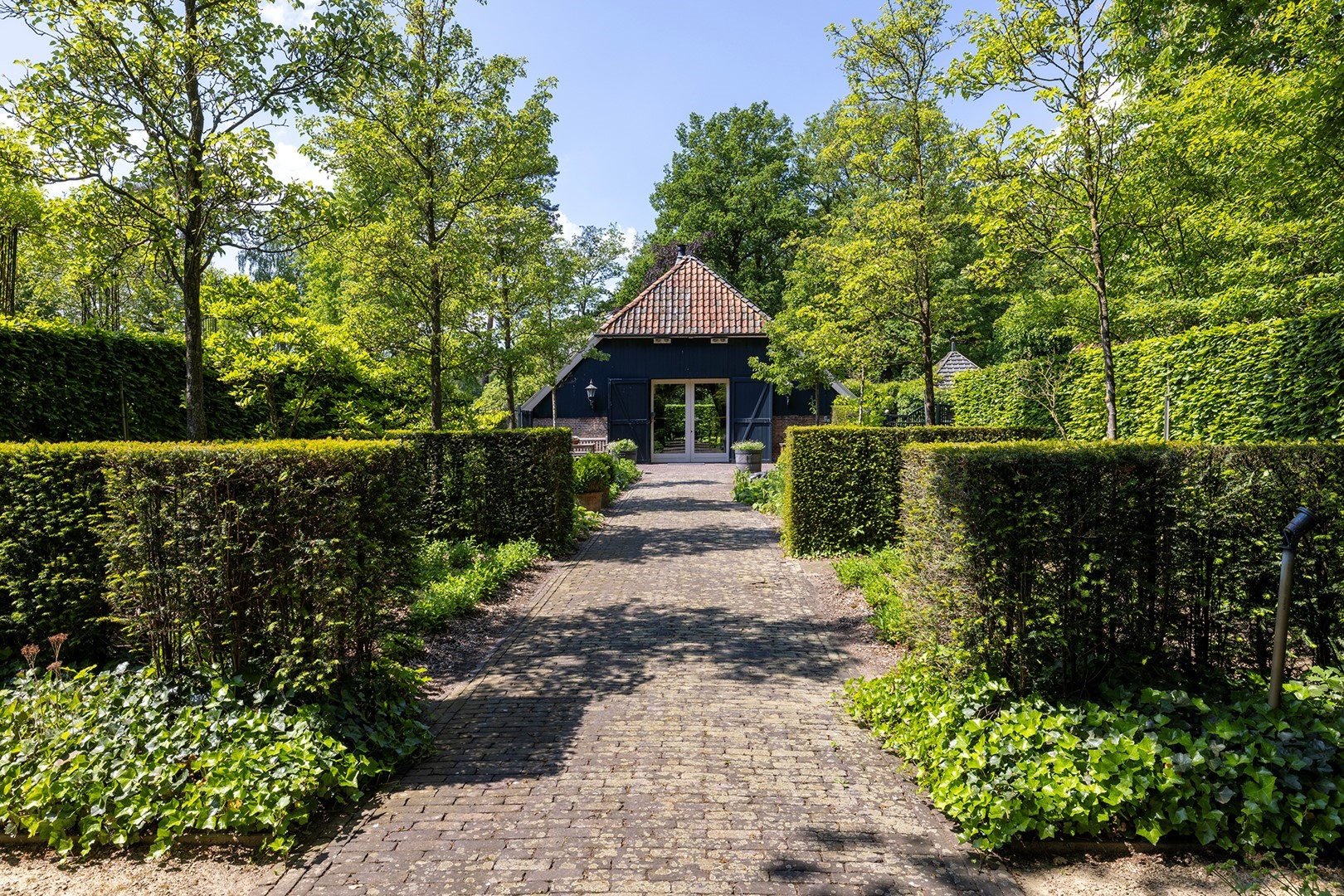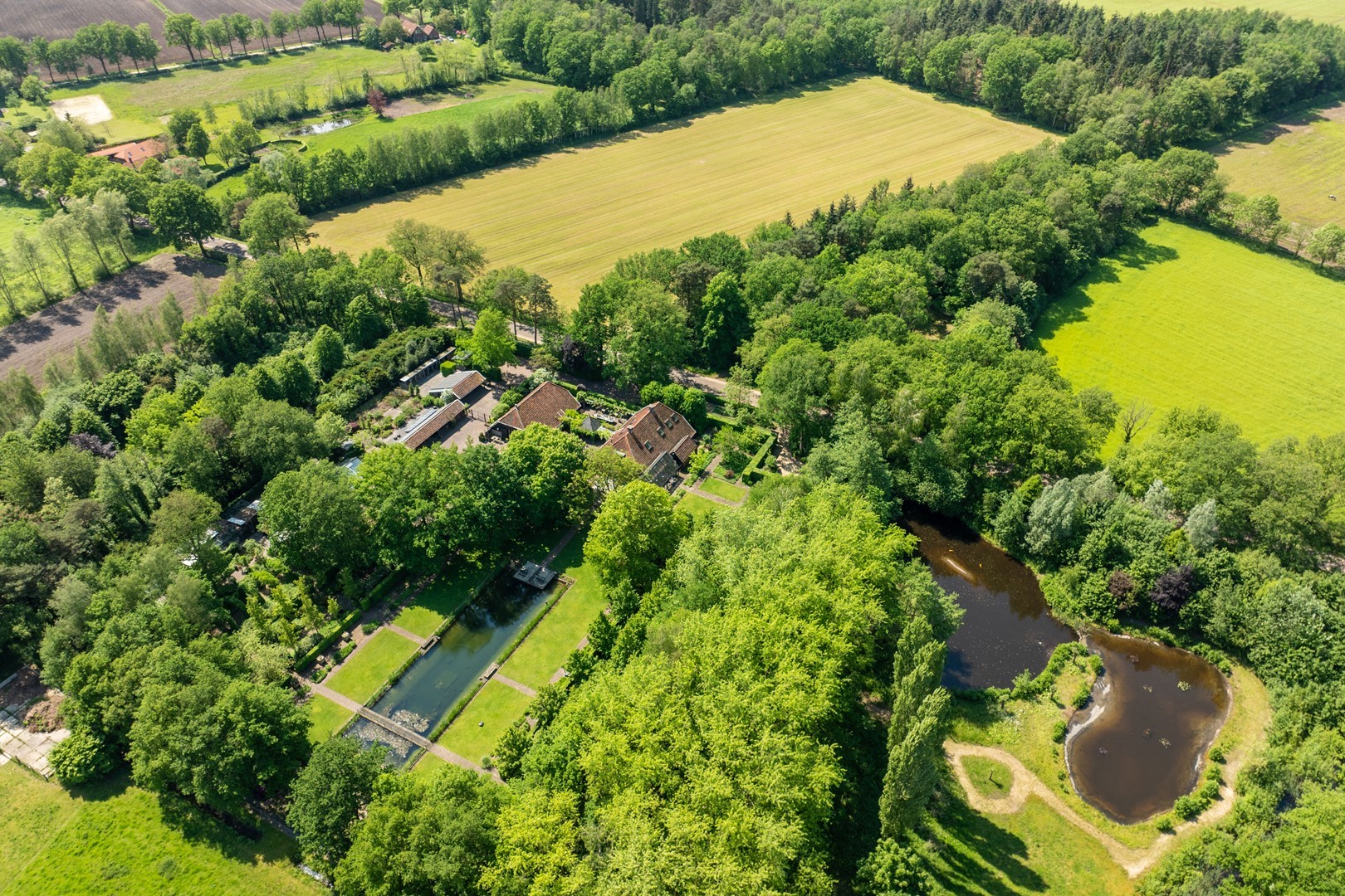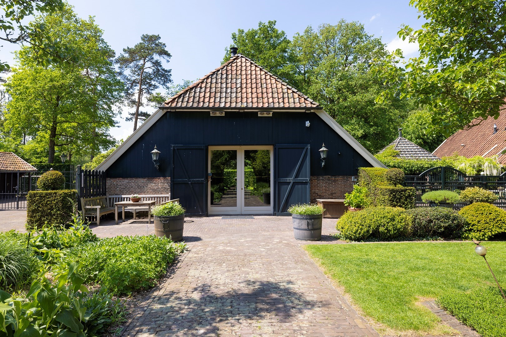 Met een gastvrij voorplein, uitbundige bloeiers en ruime parkeergelegenheid aan de voorzijde valt de ruim 100 jaar oude woonboerderij direct op. Toch kunt u vanaf die plek de grootsheid van dit 5 hectare tellende landgoed nog niet vermoeden. Aan de achterzijde reiken haast eindeloze zichtlijnen – over de langgerekte vijver heen – tussen schapen en eeuwenoude bomen door. Van al dat moois is één hectare omheind als tuin. Daarachter treft u uitgestrekte weilanden, bospercelen, vijverpartijen omrand met knotwilgen en ruisende platanen. Mens en dier leven er in harmonie samen dankzij het uitgebalanceerde landschap ontwerp van Arend Jan van der Horst.