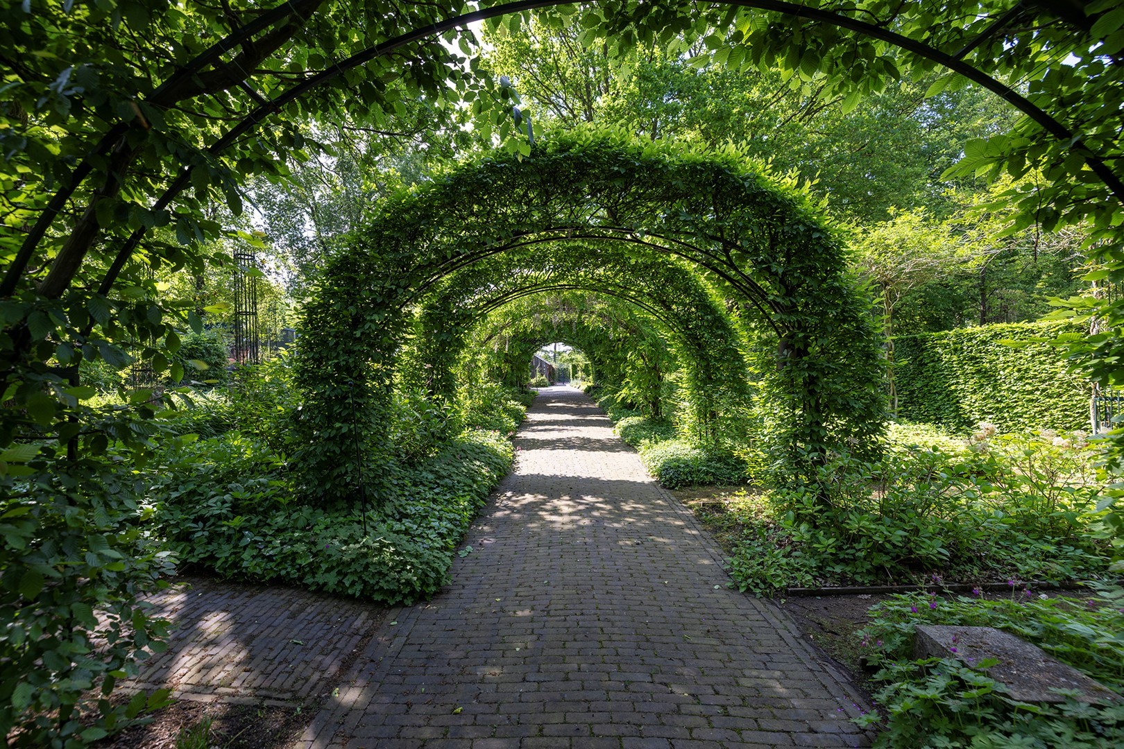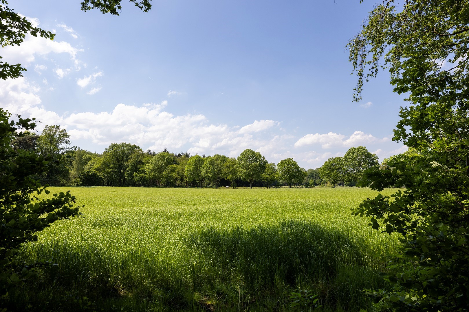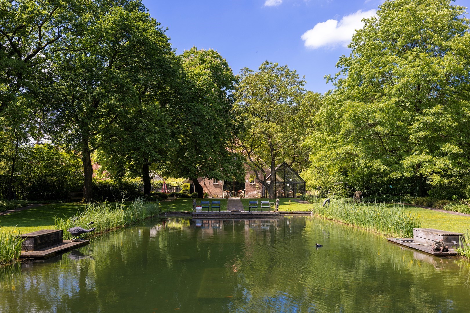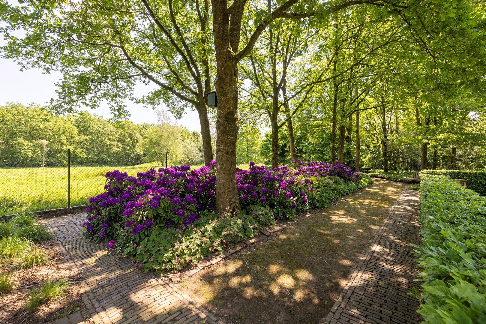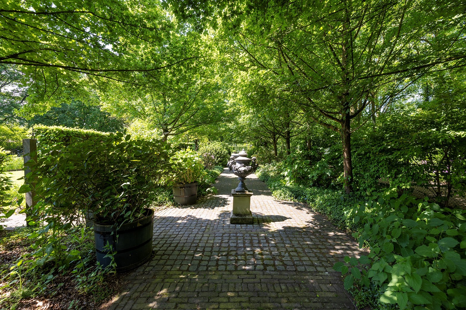 Met een gastvrij voorplein, uitbundige bloeiers en ruime parkeergelegenheid aan de voorzijde valt de ruim 100 jaar oude woonboerderij direct op. Toch kunt u vanaf die plek de grootsheid van dit 5 hectare tellende landgoed nog niet vermoeden. Aan de achterzijde reiken haast eindeloze zichtlijnen – over de langgerekte vijver heen – tussen schapen en eeuwenoude bomen door. Van al dat moois is één hectare omheind als tuin. Daarachter treft u uitgestrekte weilanden, bospercelen, vijverpartijen omrand met knotwilgen en ruisende platanen. Mens en dier leven er in harmonie samen dankzij het uitgebalanceerde landschap ontwerp van Arend Jan van der Horst.