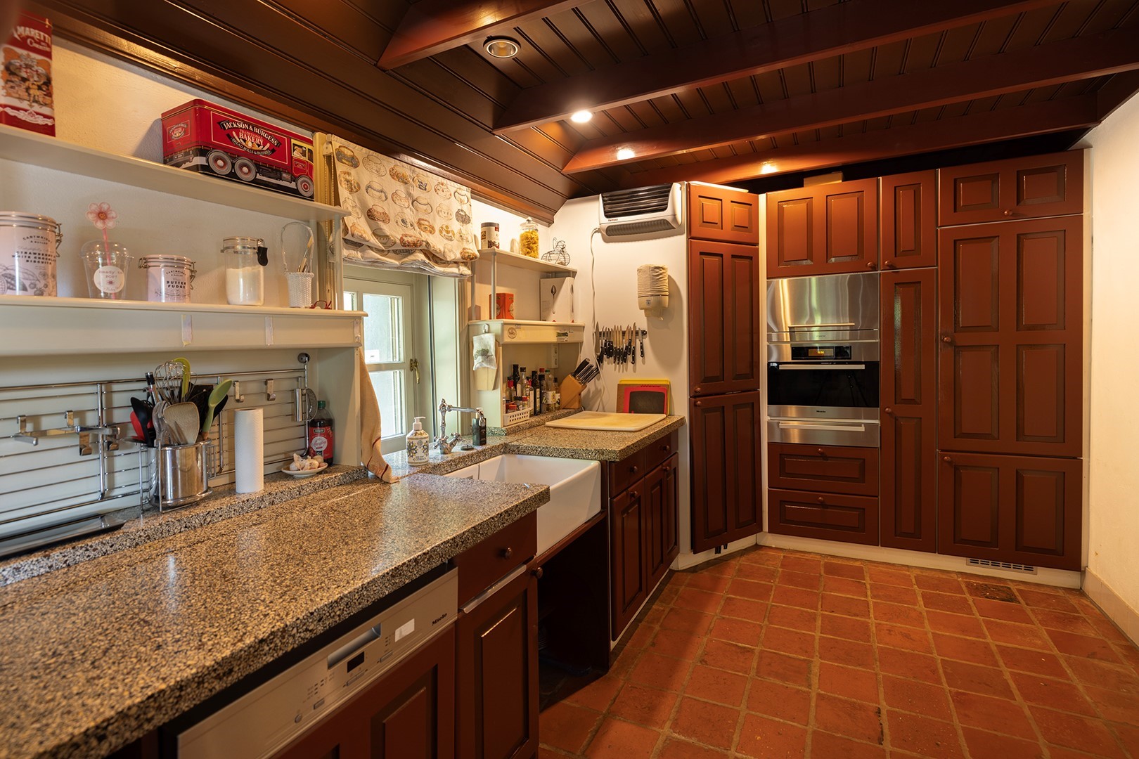Via een groene patio met weelderige pergola bereikt u de schöppe: een grote schuur – met vloerverwarming – waar van alles mogelijk is. De vorige bewoners gebruikten hem voor vergaderingen, feesten en mini concerten. In de zomer doet het terras, dankzij de royale, openslaande deuren, volop mee. Weelderige tuinpaden leiden naar diverse bijgebouwen. Naar de dubbele garage bijvoorbeeld, waar zich ook de wijnkelder bevindt. Naar het glasshouse of naar het ‘tuinmanshuisje’ waar ruimte is om de kweeperen-oogst op te slaan.
