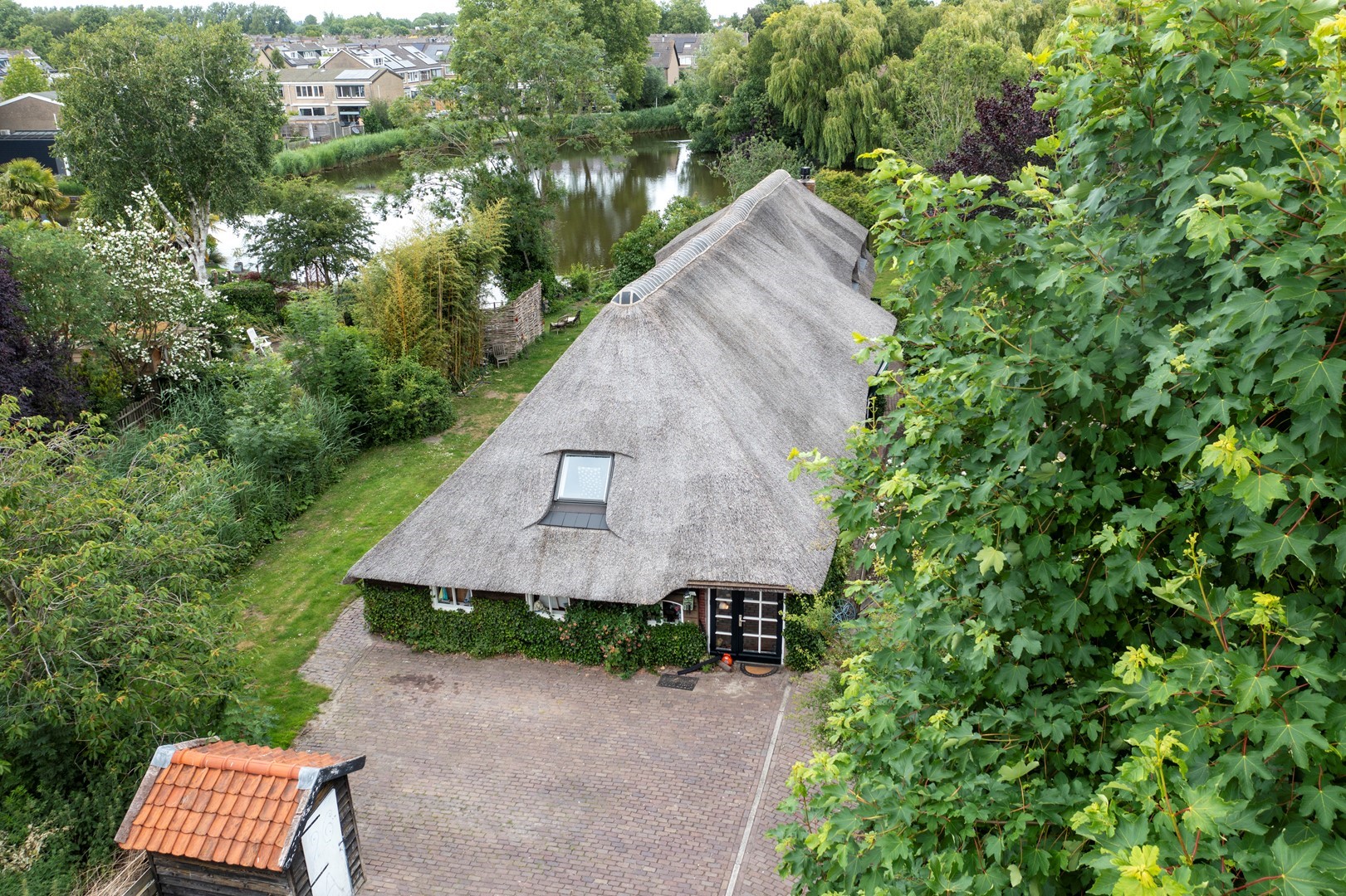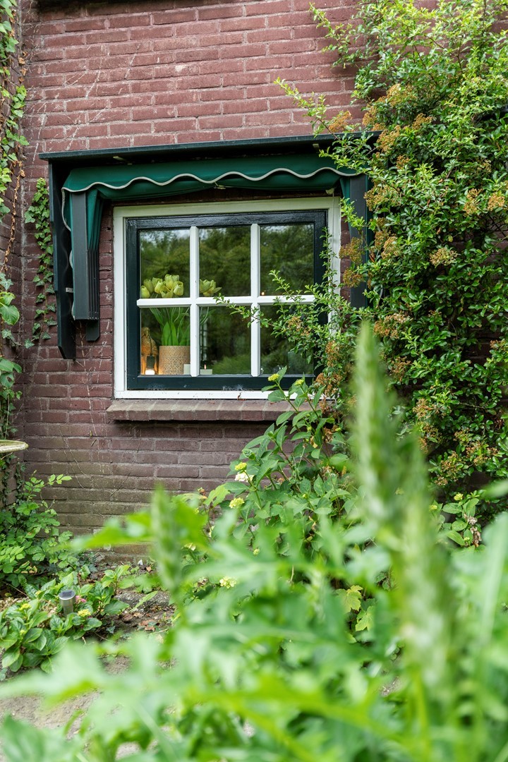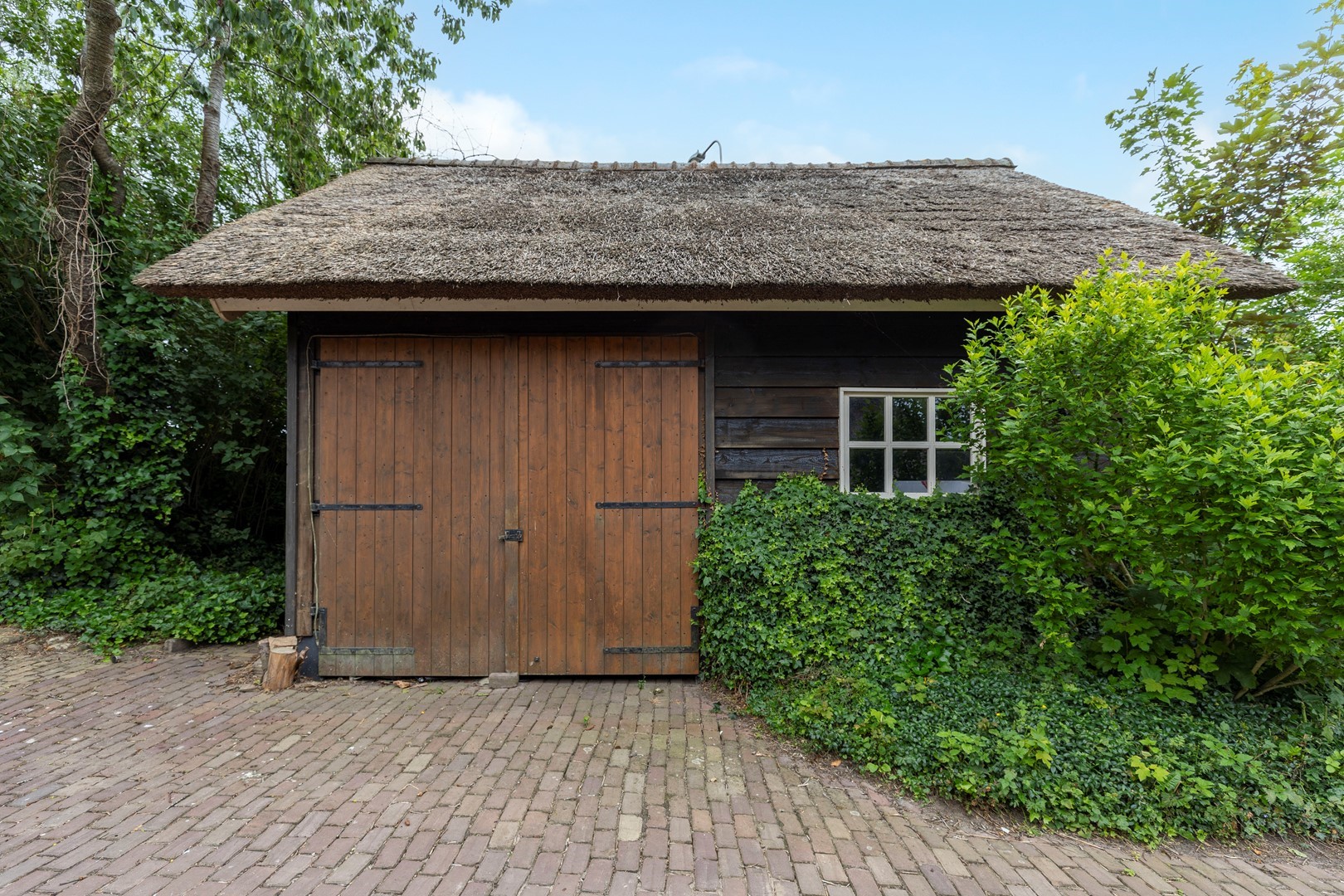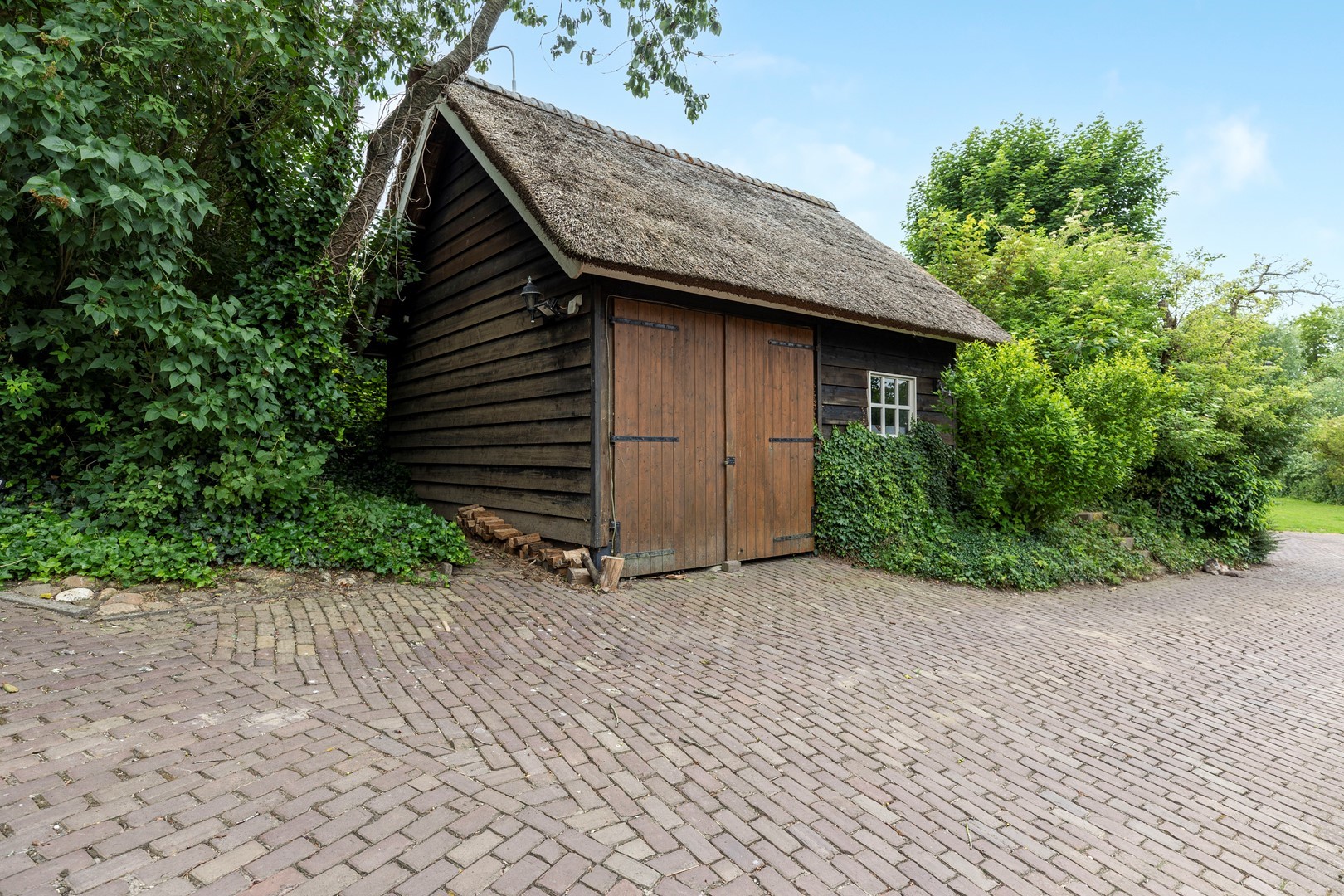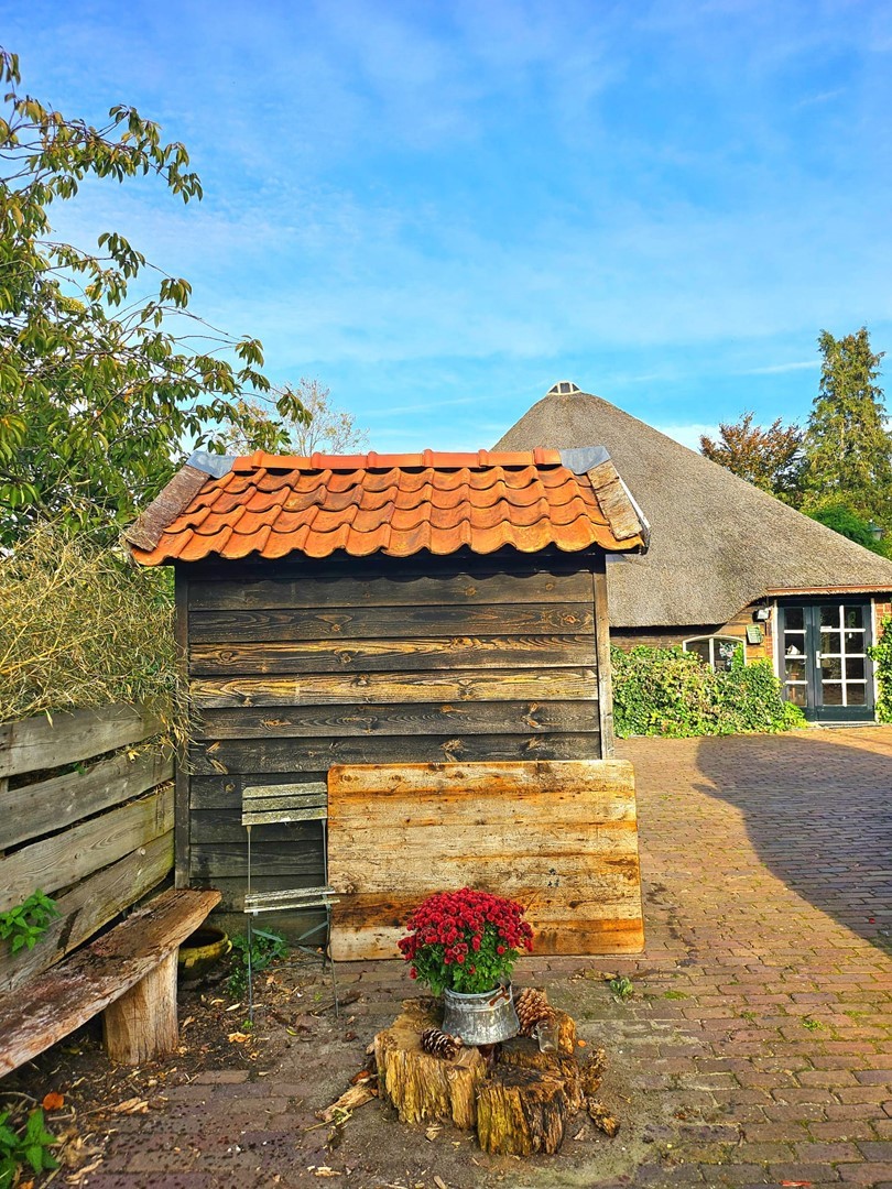 De originele schuur, die tevens is gebouwd in klassieke stijl, doet tegenwoordig dienst als garage en is voorzien van voldoende opslagmogelijkheden voor onder andere tuingereedschap en fietsen.