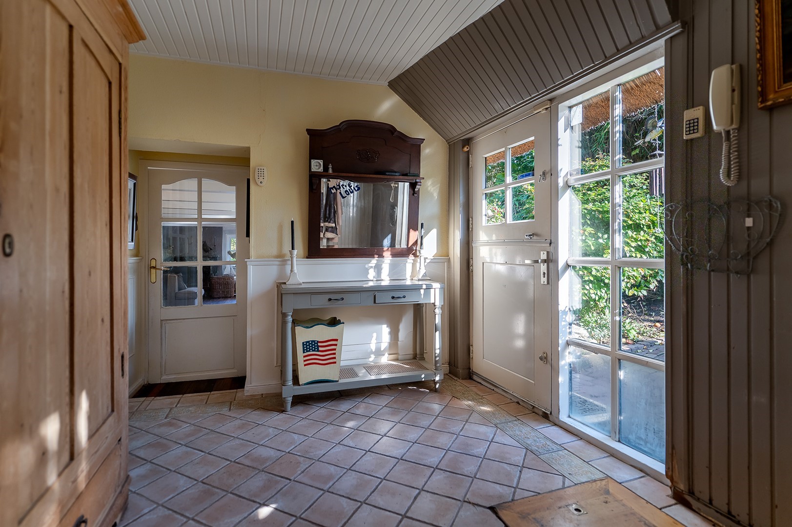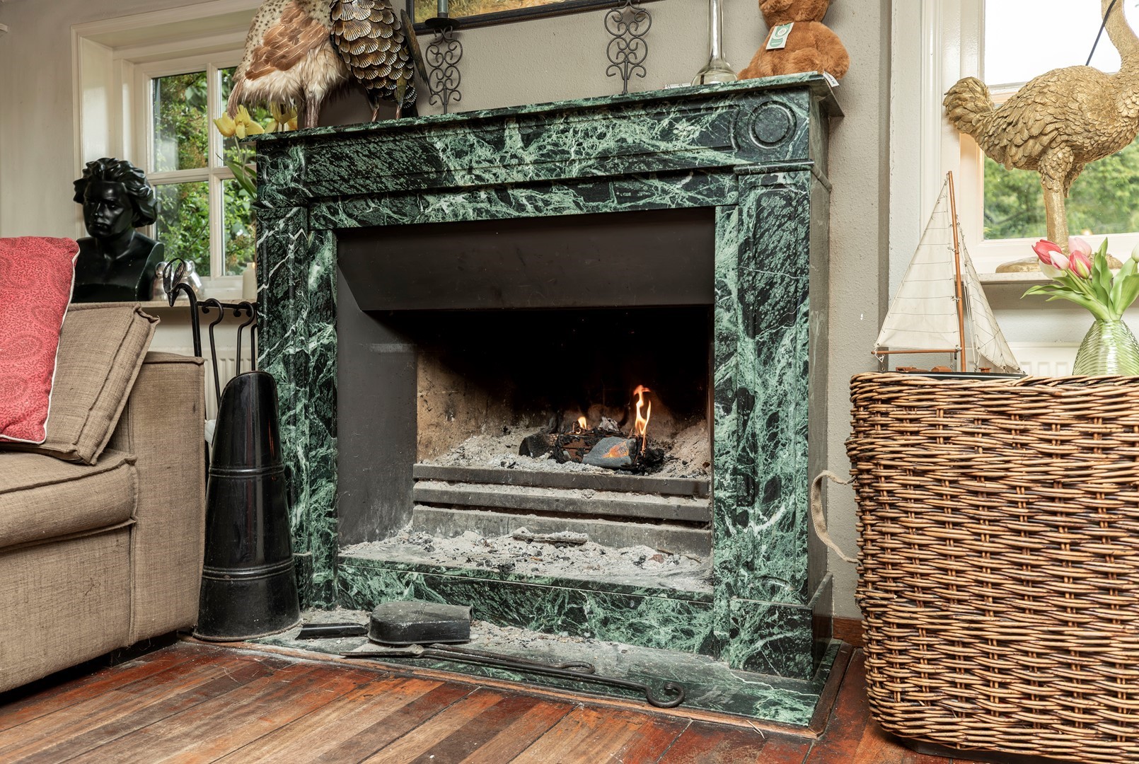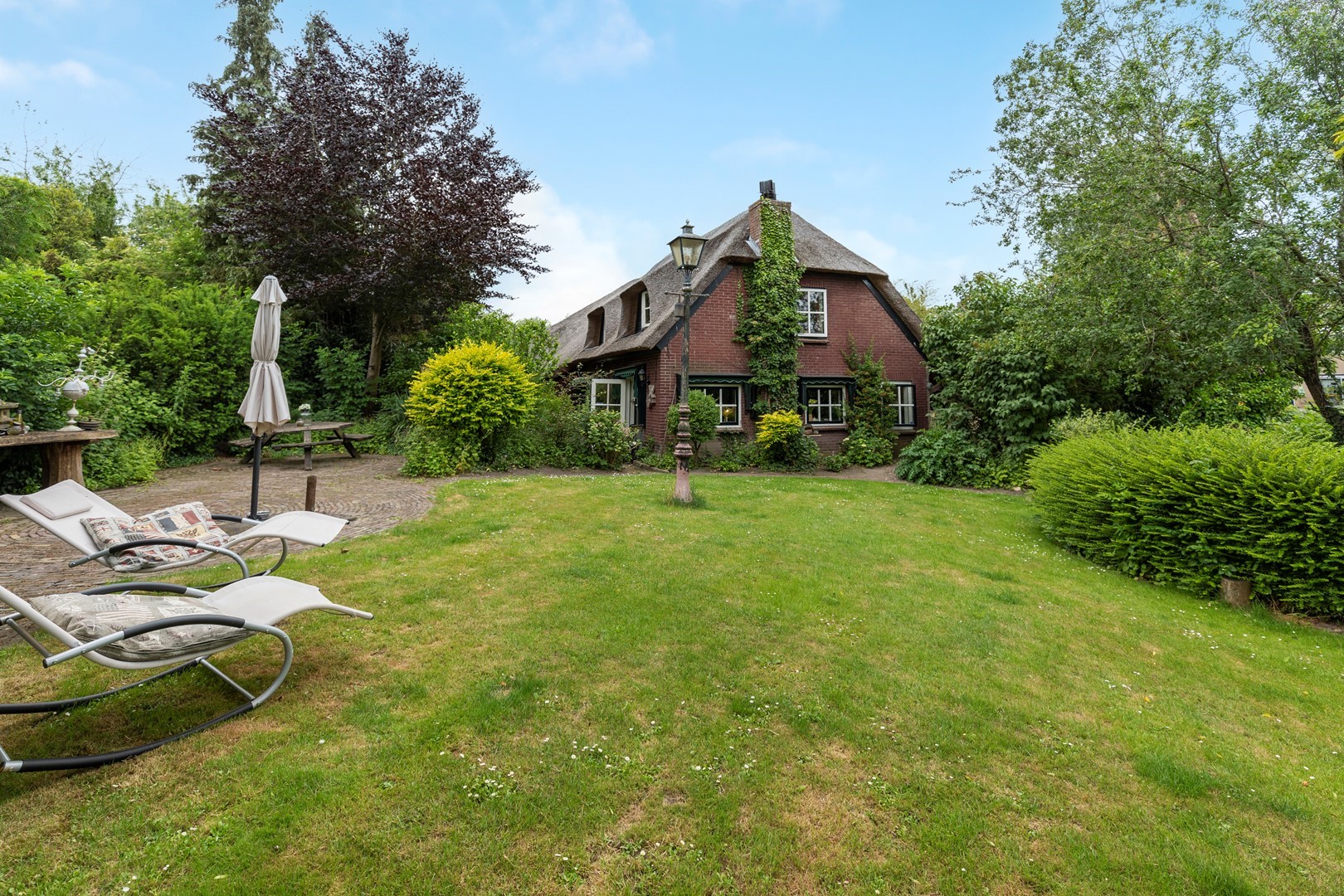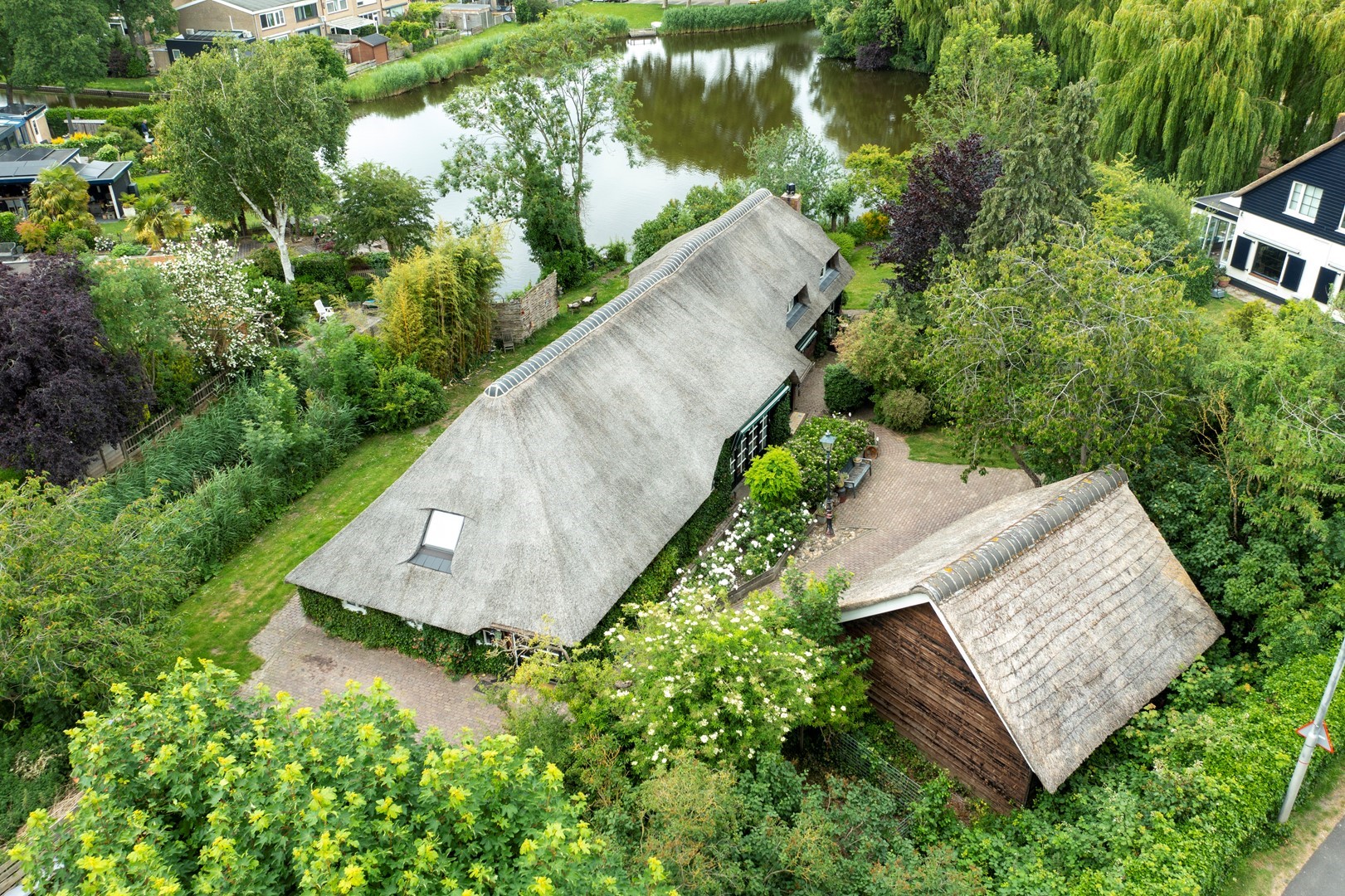 De originele schuur, die tevens is gebouwd in klassieke stijl, doet tegenwoordig dienst als garage en is voorzien van voldoende opslagmogelijkheden voor onder andere tuingereedschap en fietsen.