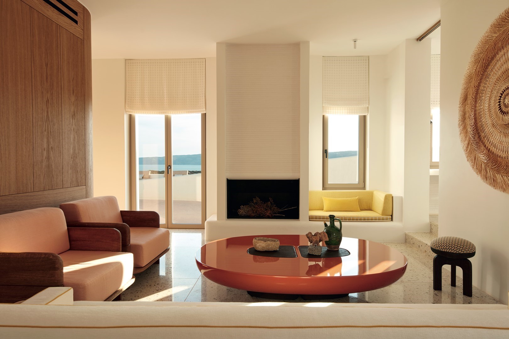Elk detail - de kleur van het marmer in de open keuken, de gele bekleding van een bankje, de onbewerkt houten planken van een kast en de rode wanden in een badkamer - is het gevolg van een uitgebreide analyse.’ Antonin stemt in: ‘We wilden overal een connectie met de plek, zowel qua bouwstructuur als qua meubels. Wat overigens niet betekent dat je het landschap altijd moet zien - veel van de ramen hebben we, om de monastieke sfeer te versterken, bewust klein gehouden - maar Kythira moet wel overal voelbaar zijn. Een puur zintuiglijke ervaring die we door middel van de zachte lijnen, kleuren en textuur geprobeerd hebben te verwezenlijken.’